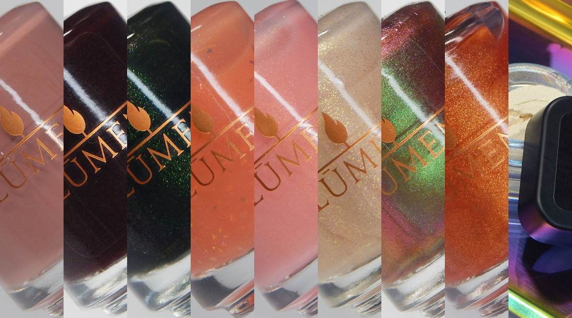 The shade selections in the set range from light and airy to deep and vampy, which is good – it covers a large range and… I love the vampy side. There’s 8 polishes and 1 powder, which I will be showing over past Lumen Nails releases and some current.