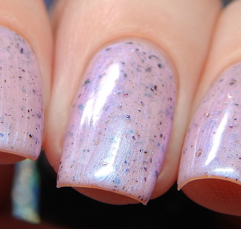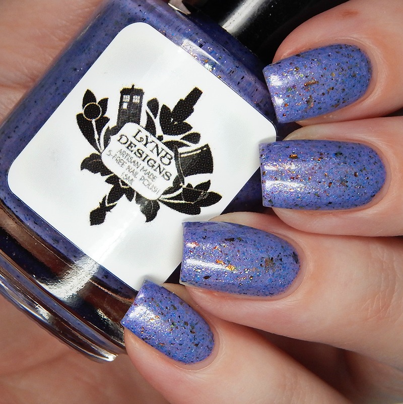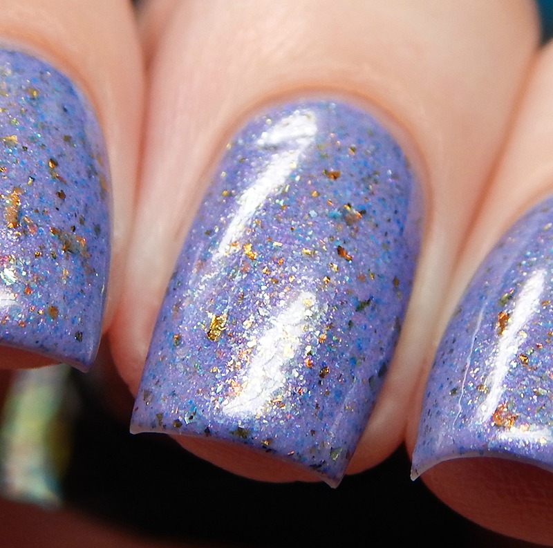 I Am Cornholio is a dusty purple shimmer crelly base with blue to gold flakes, purple shimmer and gold to bronze to silver ultrachrome chameleon flakes. I used 2 coats and a glossy top coat for these photos.