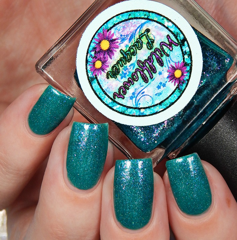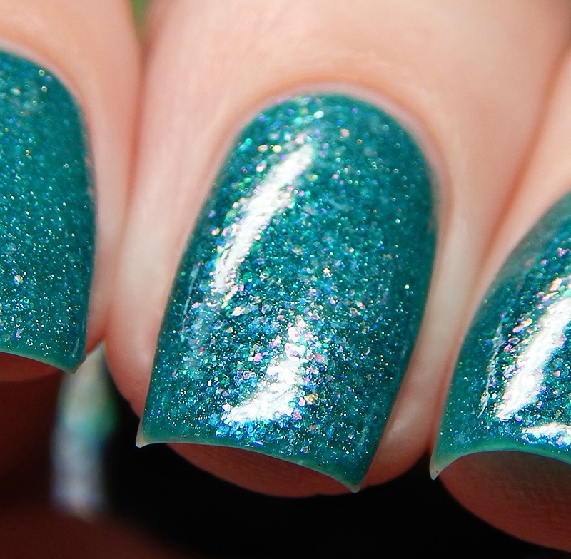 What Up Butthead? is a teal crelly base with rose pearl flakes and a subtle linear holographic effect. It’s a touch bluer in person. I used 3 thin coats and a glossy top coat for these photos.