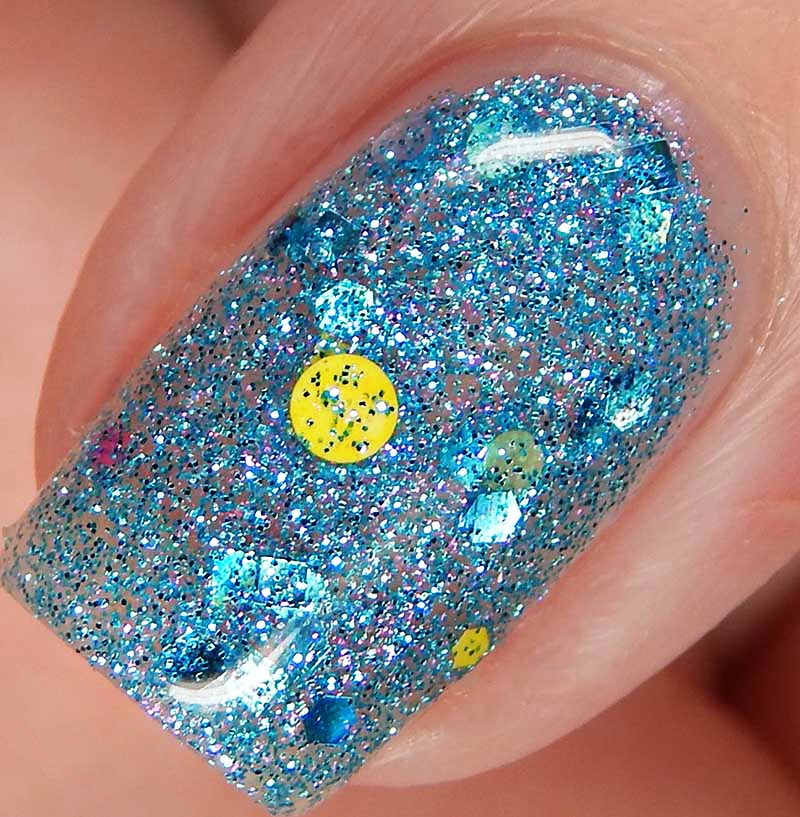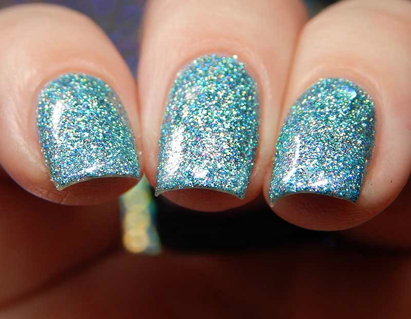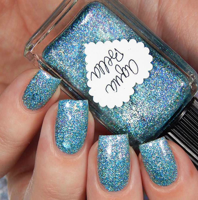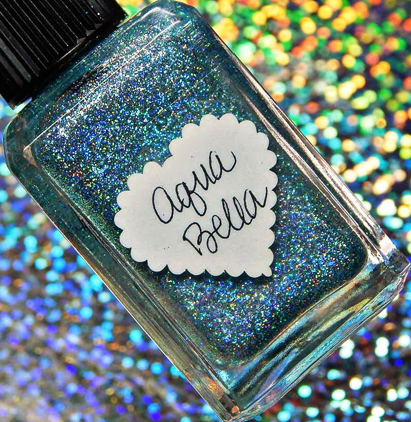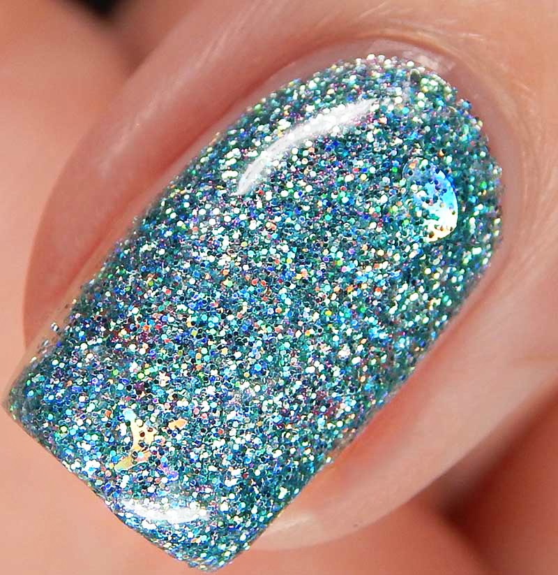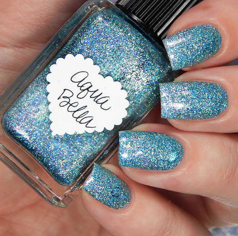 Aqua Bella is a n aqua tinted base packed with aqua holographic microglitters and medium aqua holographic heart glitters. I used 2 coats and a glossy top coat for these photos.