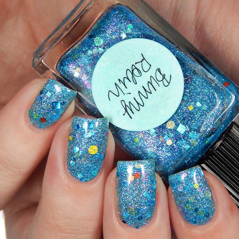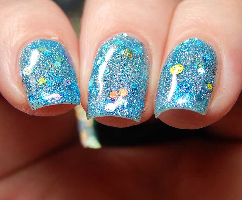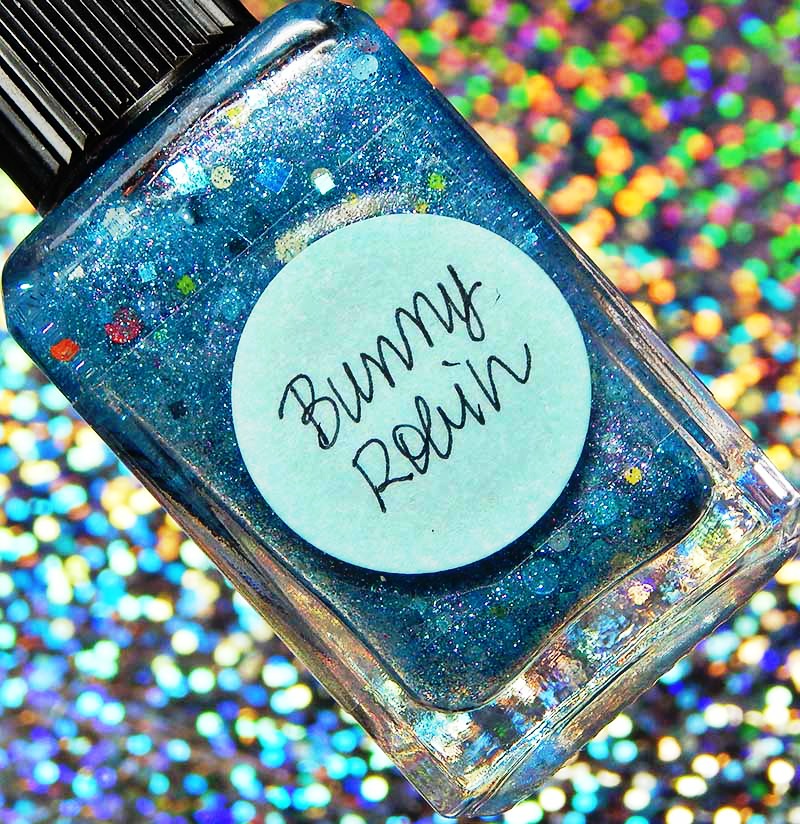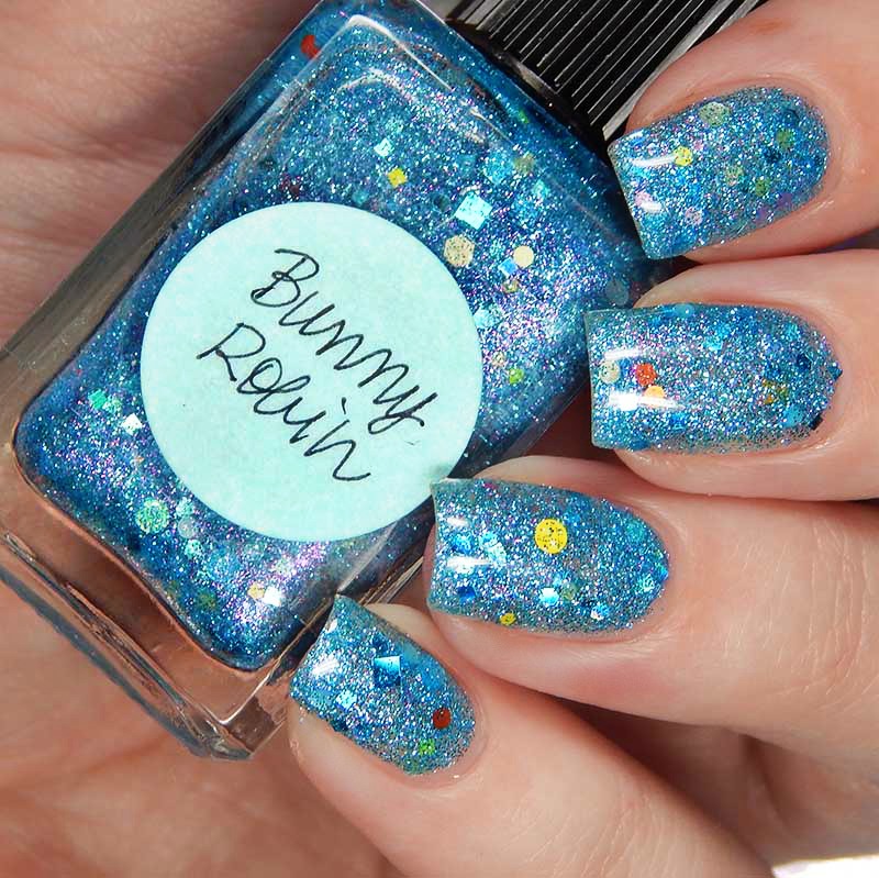 Bunny Robin is a fun Easter/Spring polish! This is a clear base with a flash of pink shimmer, sky blue holographic particles packed in, and white, sky blue and yellow glitters in various shapes and sizes. I used 3 thin coats and a glossy top coat for these photos.
