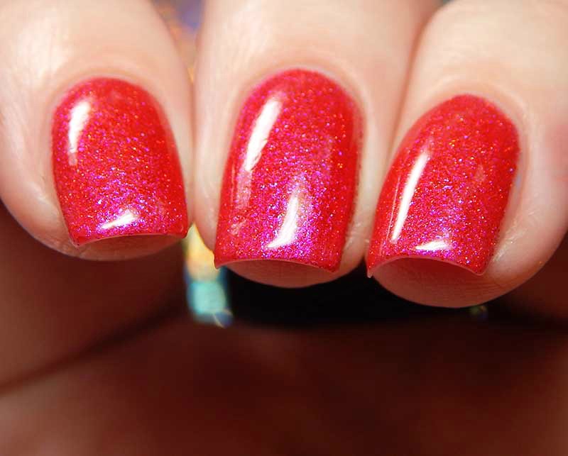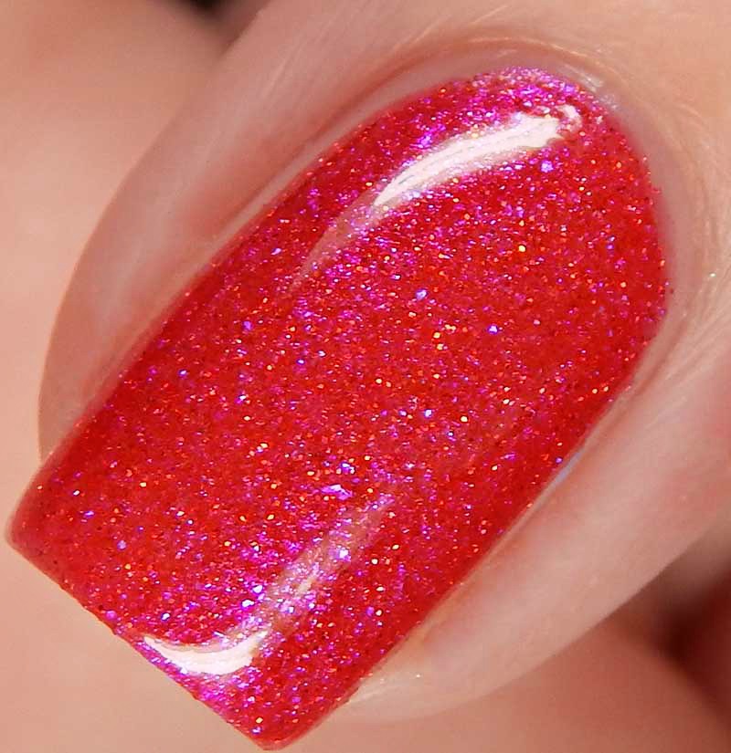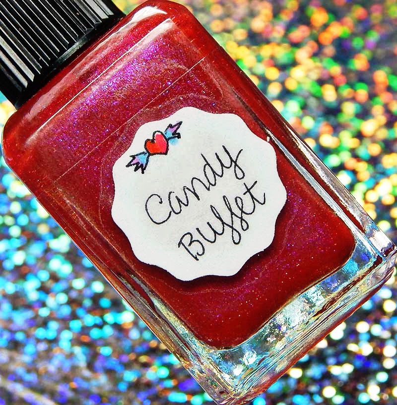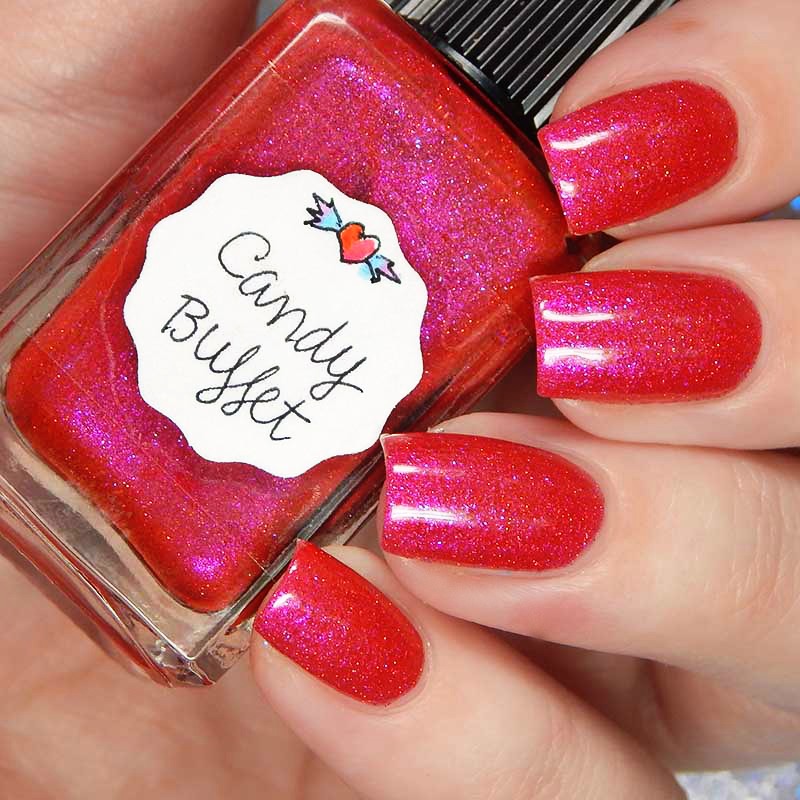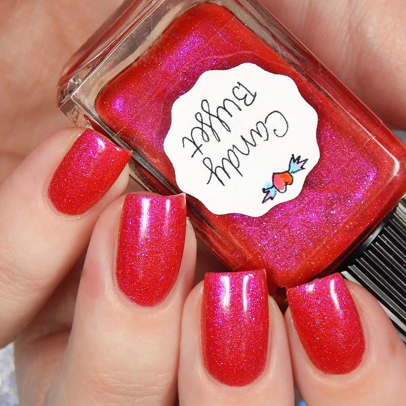 Candy Buffet is a red toned multishimmered deep pink with very subtle red holographic microglitters. I used 2 coats and a glossy top coat for these photos.