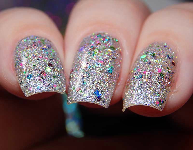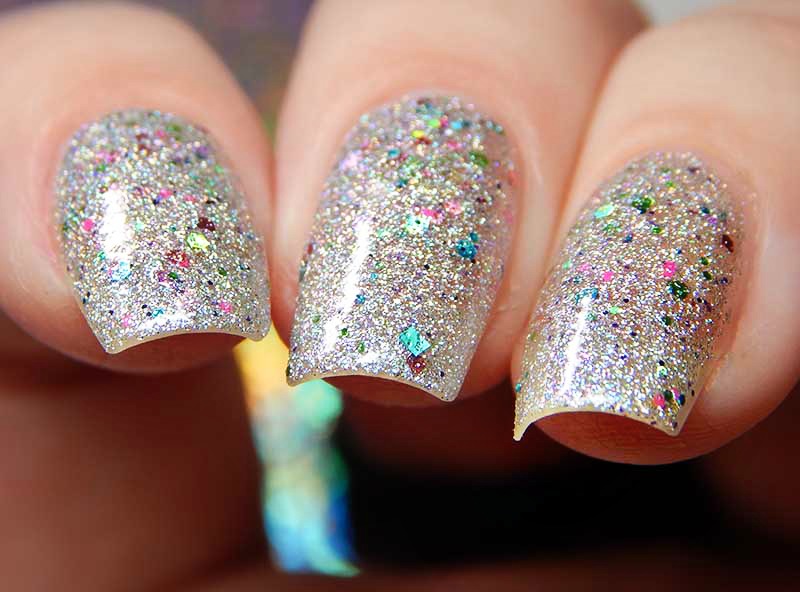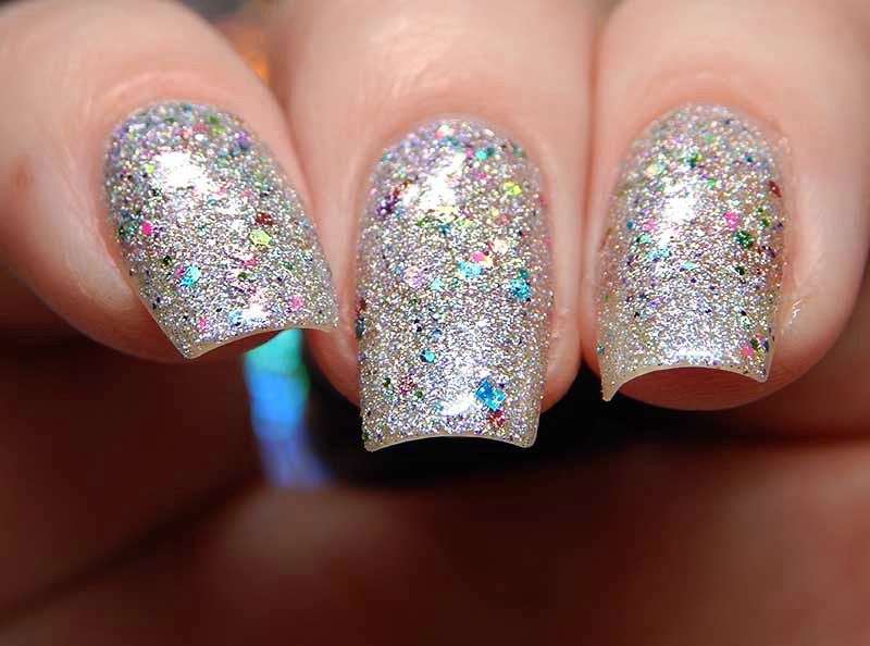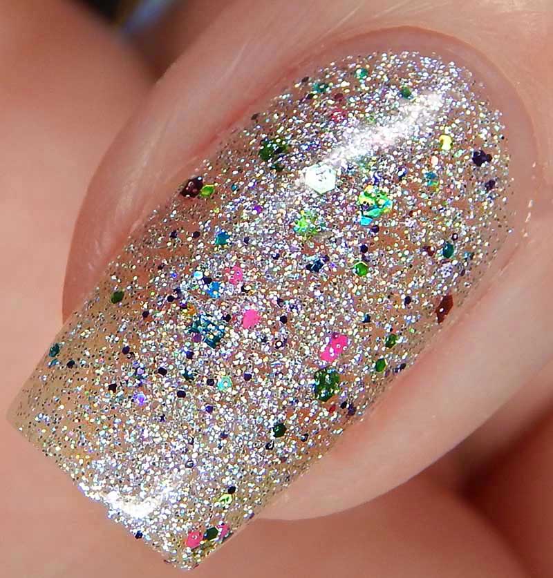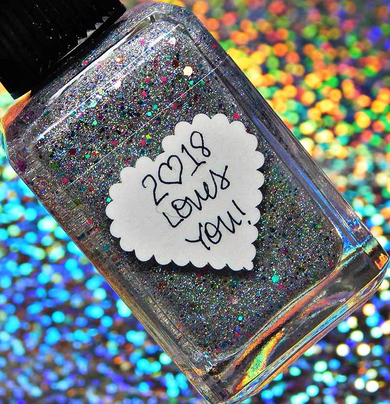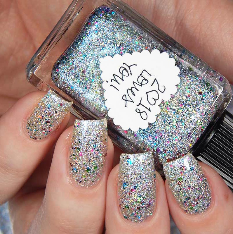 2018 Loves You is a silver holographic nanoglitter with blue, pink, fuchsia, yellow, aqua and chartreuse microglitters, there is also a gorgeous flash of blue shimmer in the base. I used 2 coats and a glossy top coat for these photos.