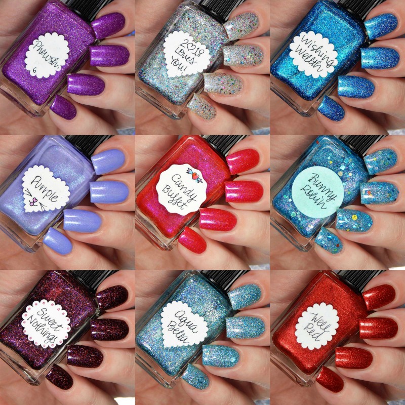 What I really loved about this assortment is they were all really different. The elements, the shades, the finishes – so many choices! I had no application issues, but with some shades like Aqua Bella, Wishing Wellth, Bunny Robin and 2018 Loves You – you might need 2 coats of top coat for a smooth finish. I use a thick top coat, so I only really needed 1.