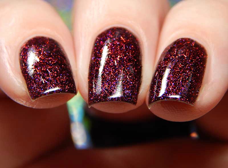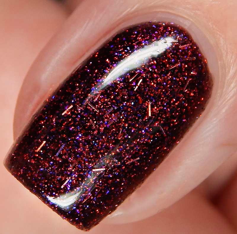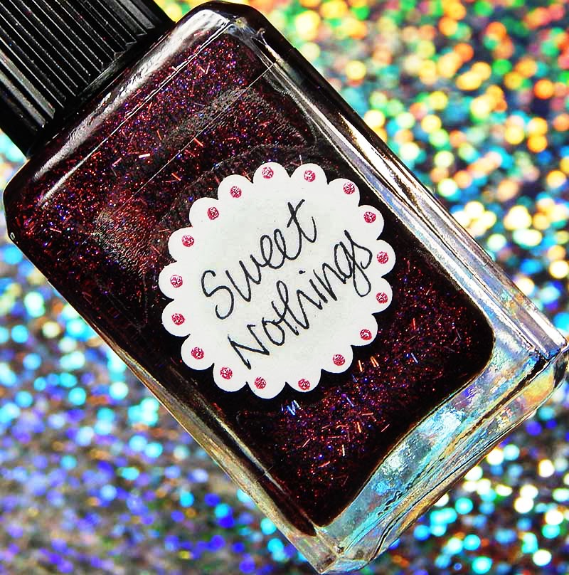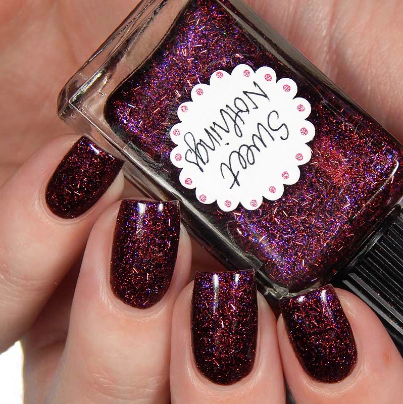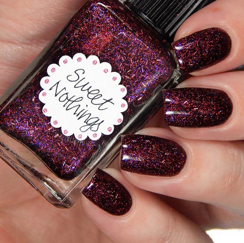 Sweet Nothings is a blackened magenta shimmery base with very small, thin pink holographic bars, as well as red pink and violet sparks. I used 3 thin coats and a glossy top coat for these photos.