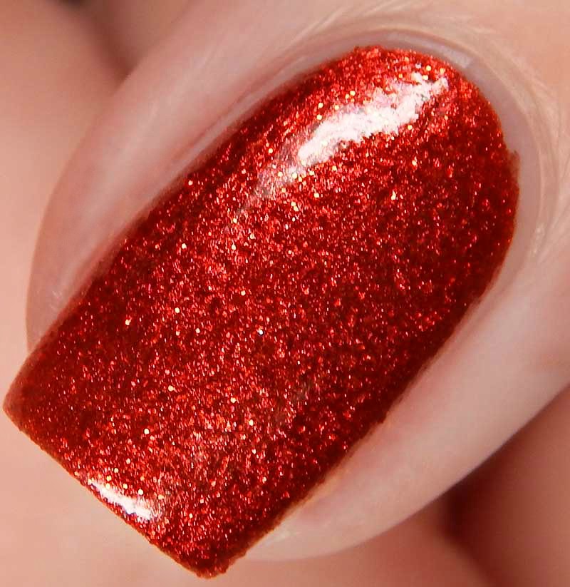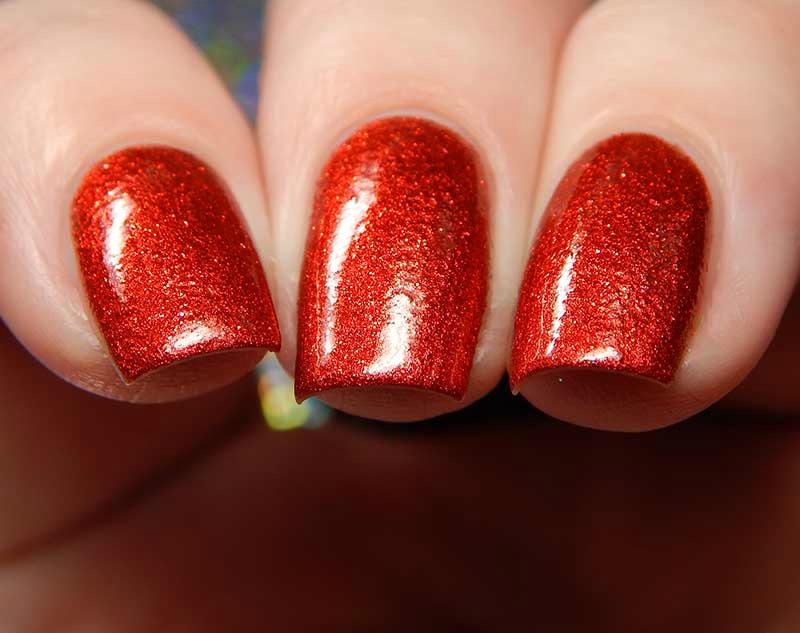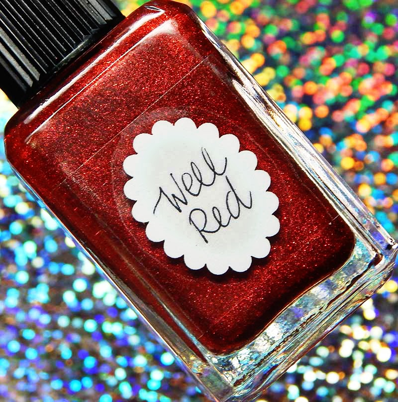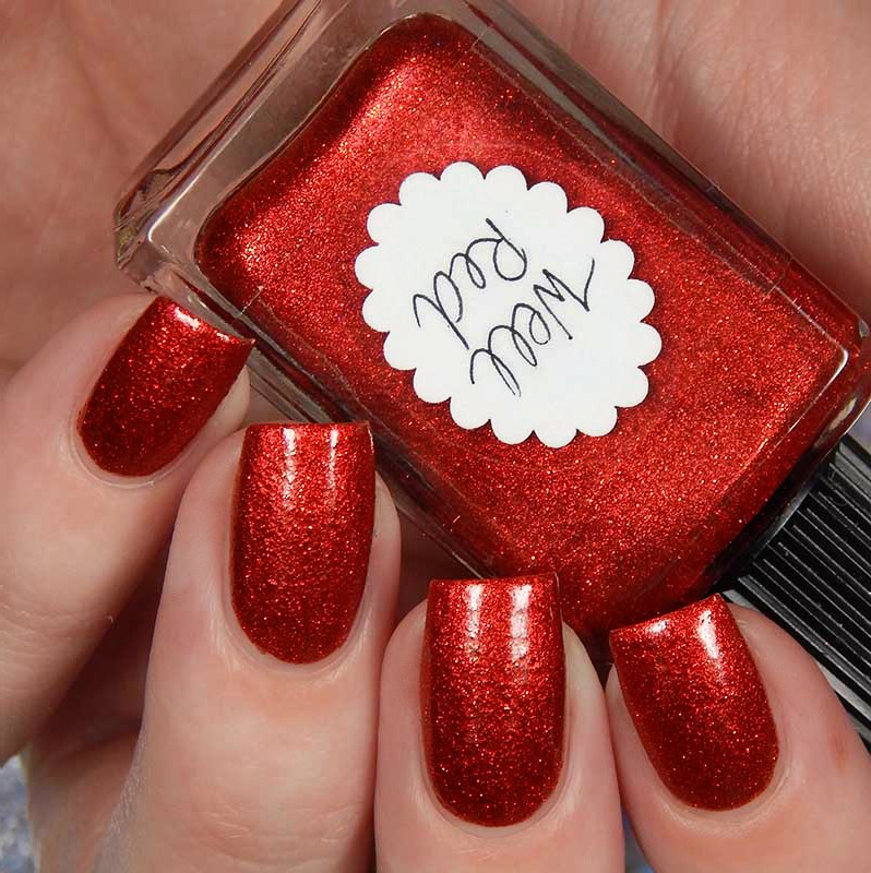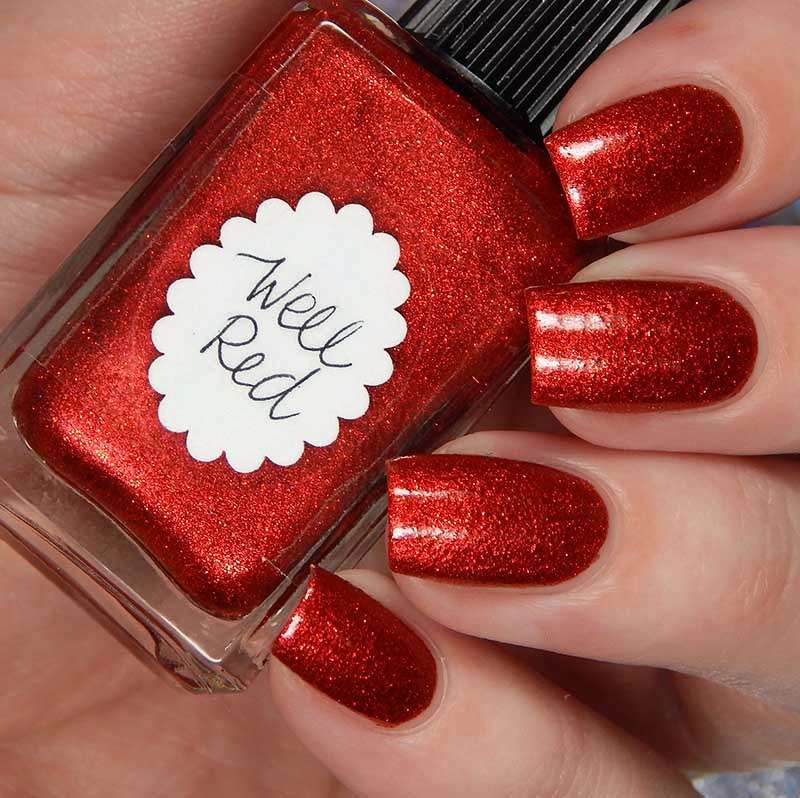 Well Red is a cherry red base with metallic microflecks and red nano glitters. I used 2 coats and a glossy top coat for these photos.