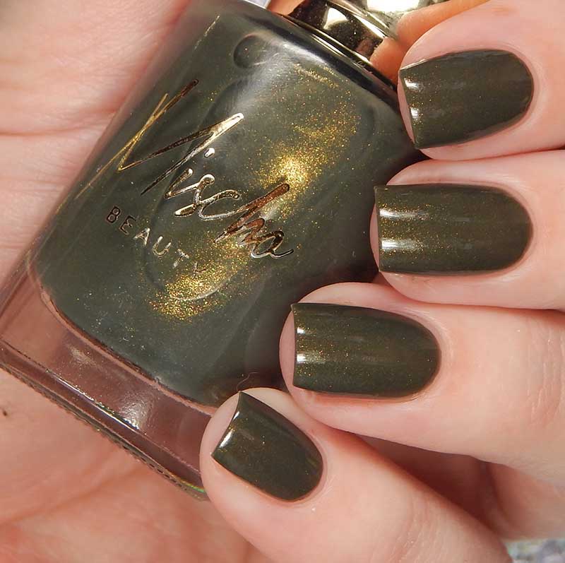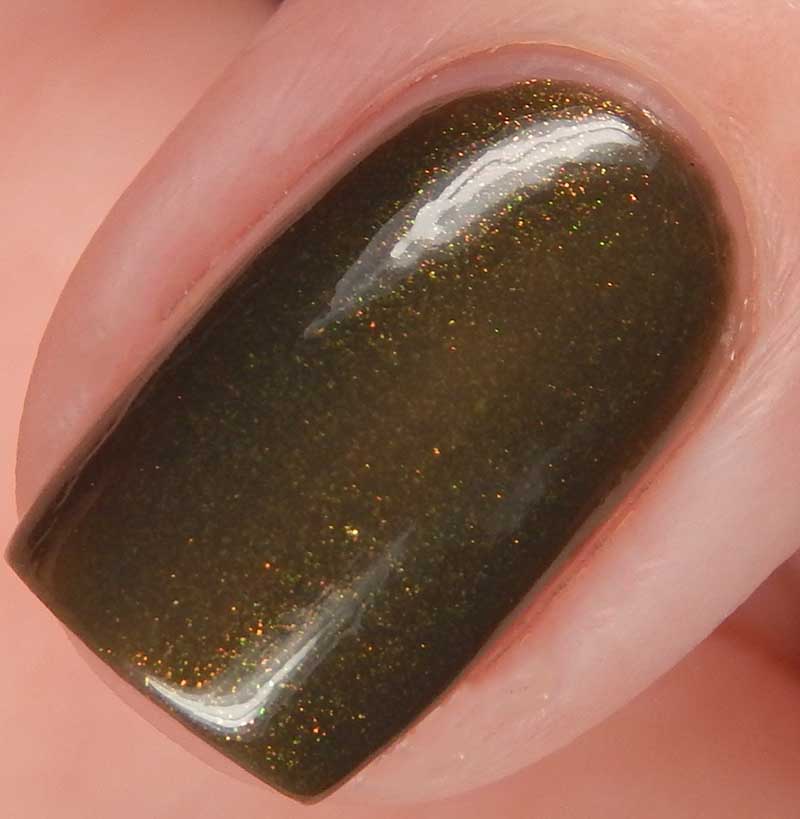 Sans Souci is a deep olive with strong golden shimmer. I used 2 coats and a glossy top coat for these photos.