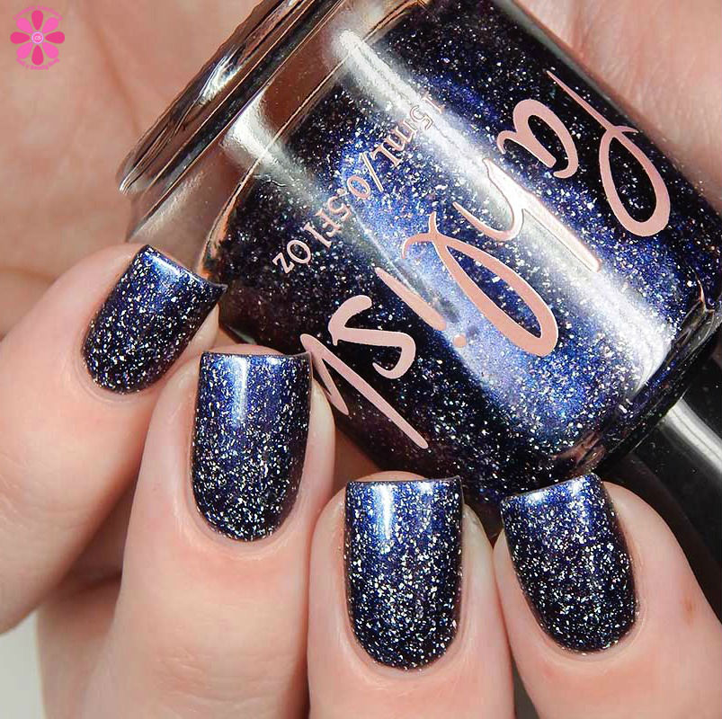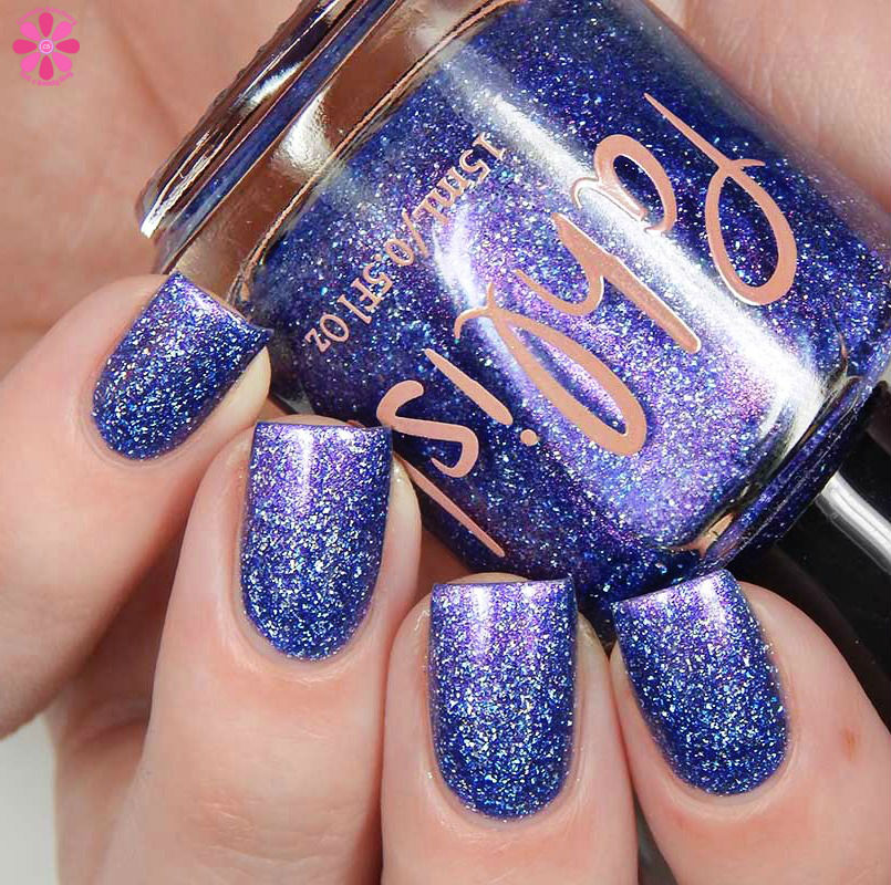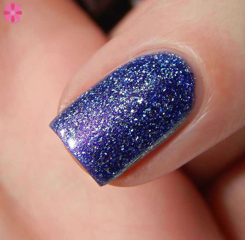 Good Omens is a periwinkle base with holo flakes and a pink to copper multichrome shimmer. I used 3 thin coats and a glossy top coat for these photos.