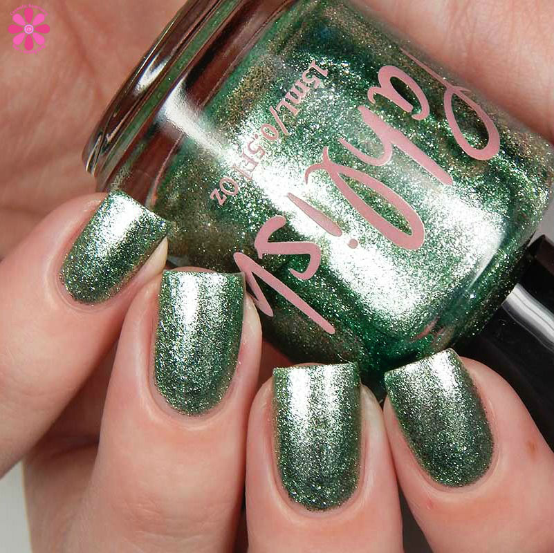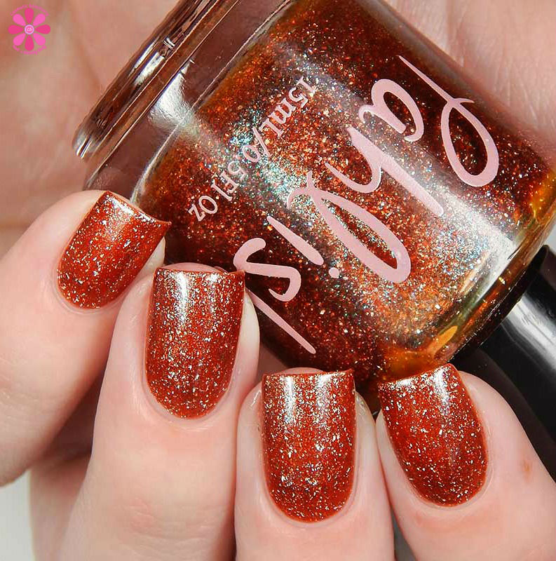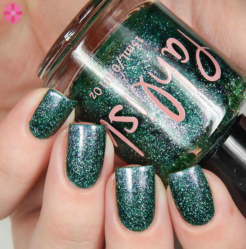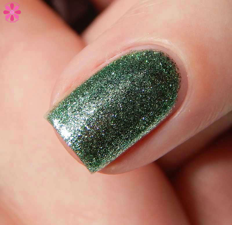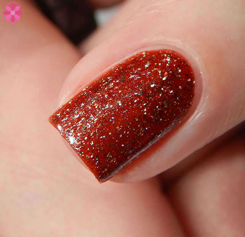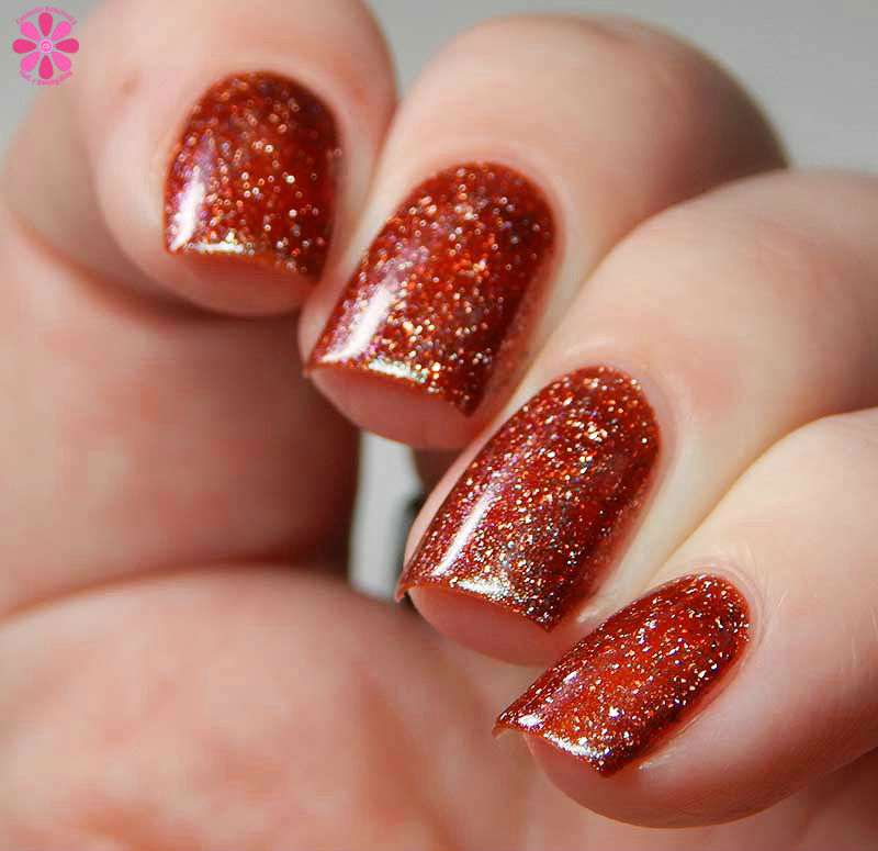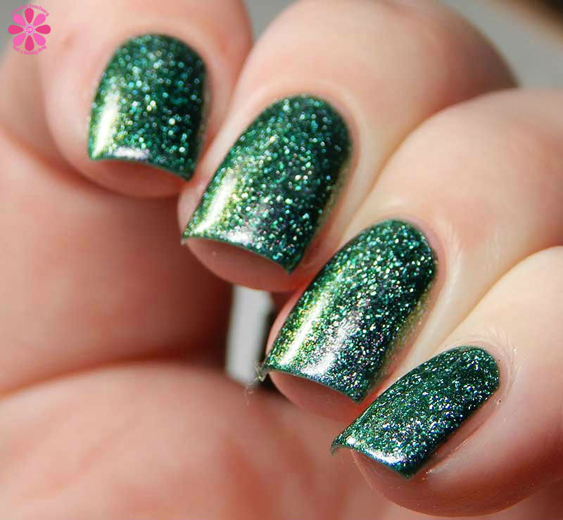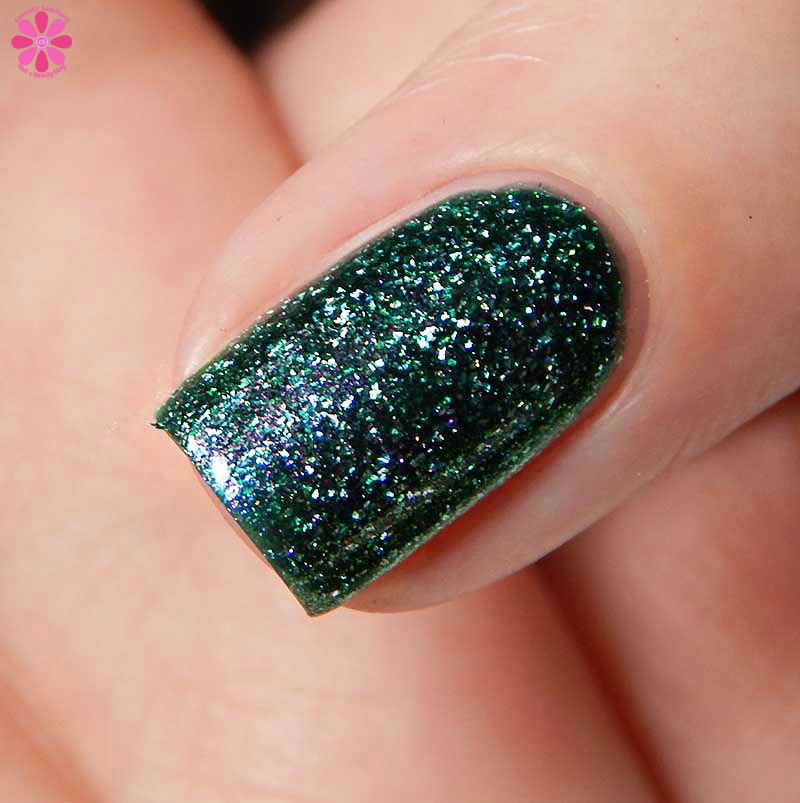Hempstock is a spearmint jelly base with red to gold multichrome shimmer and holo flakes. I used 3 thin coats and a glossy top coat for these photos.