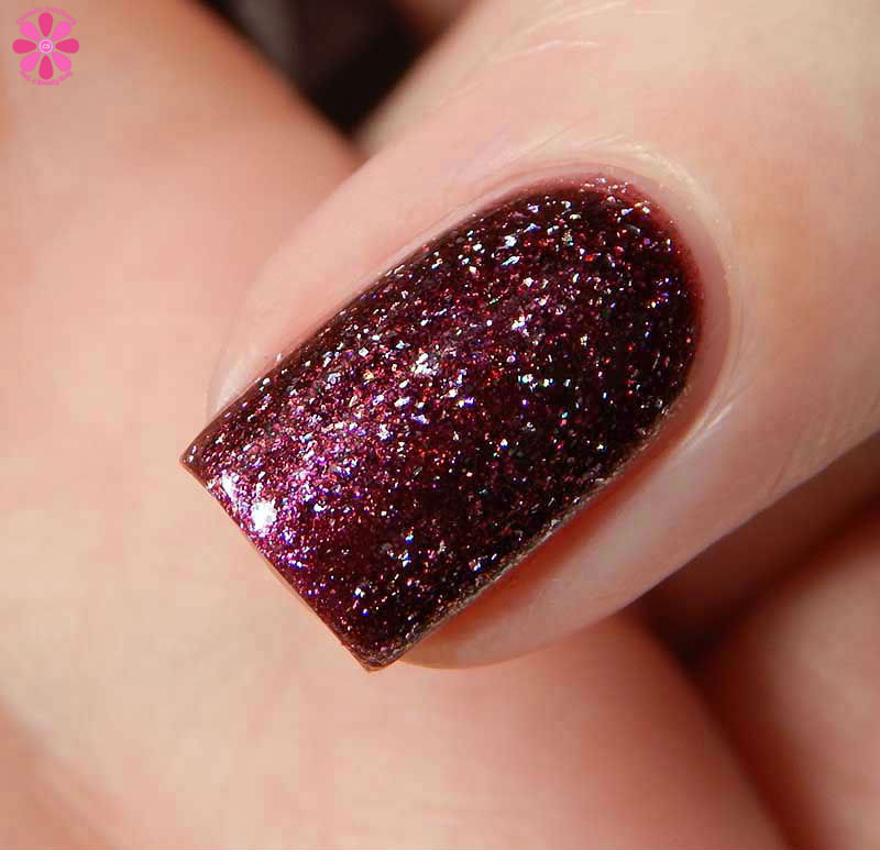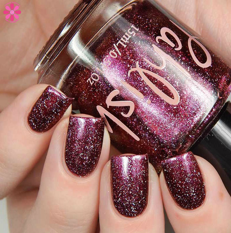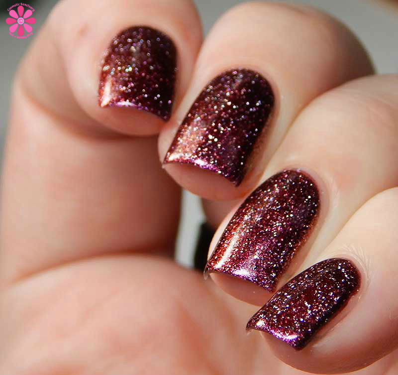 Neverwhere is described as a burgundy multichrome with silver holo flakes. The multichrome shift is incredibly subtle and goes from burgundy to a pinky red to an almost bronze red color. You can see the shift in my full photo below with no bottle used 3 thin coats and a glossy top coat for these photos.