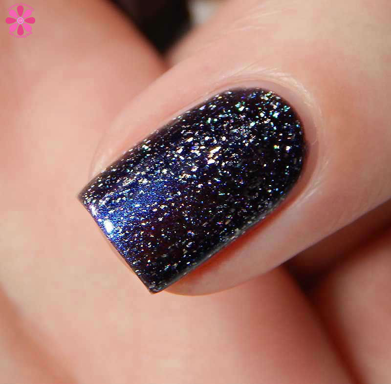 Shadow Moon is a sheer black jelly base with blue to pink duochrome shimmer and holo flakes. I used 3 thin coats and a glossy top coat for these photos. The amount of shimmer gives the black jelly base a deep purple look. It’s quite pretty.