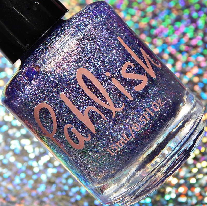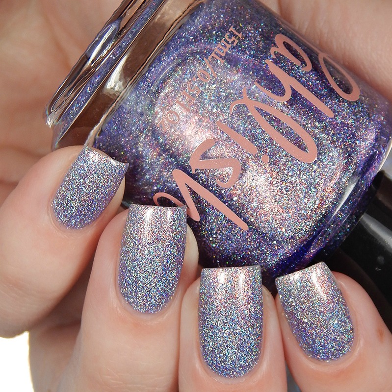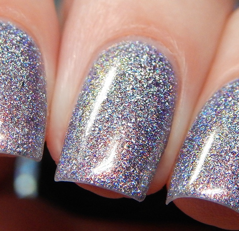 Umibozu (Sea Monk) is a soft grey with violet/blue/pink/gold shifting multichrome and a mix of holographic flakes and pigments. I used 3 thin coats and a glossy top coat for these photos.