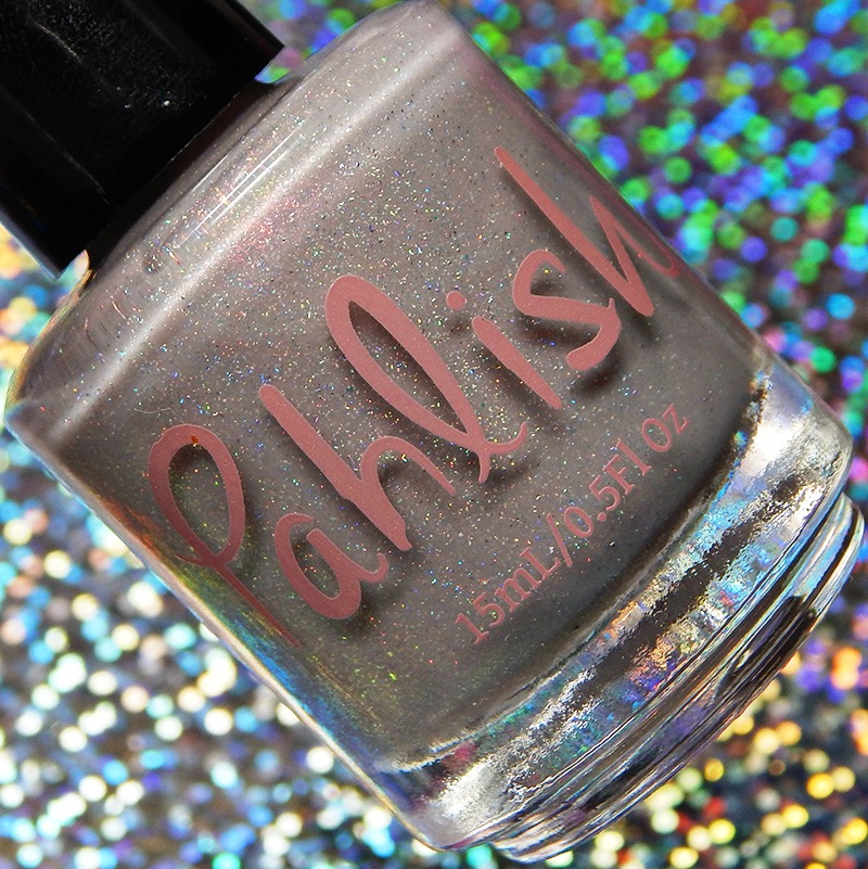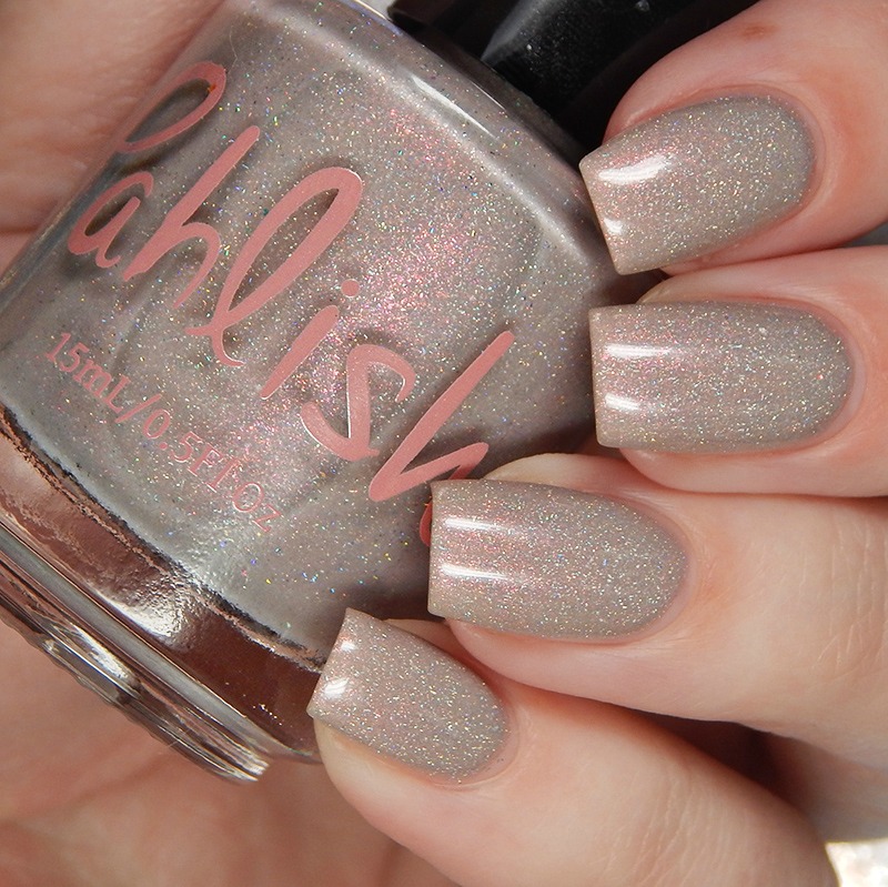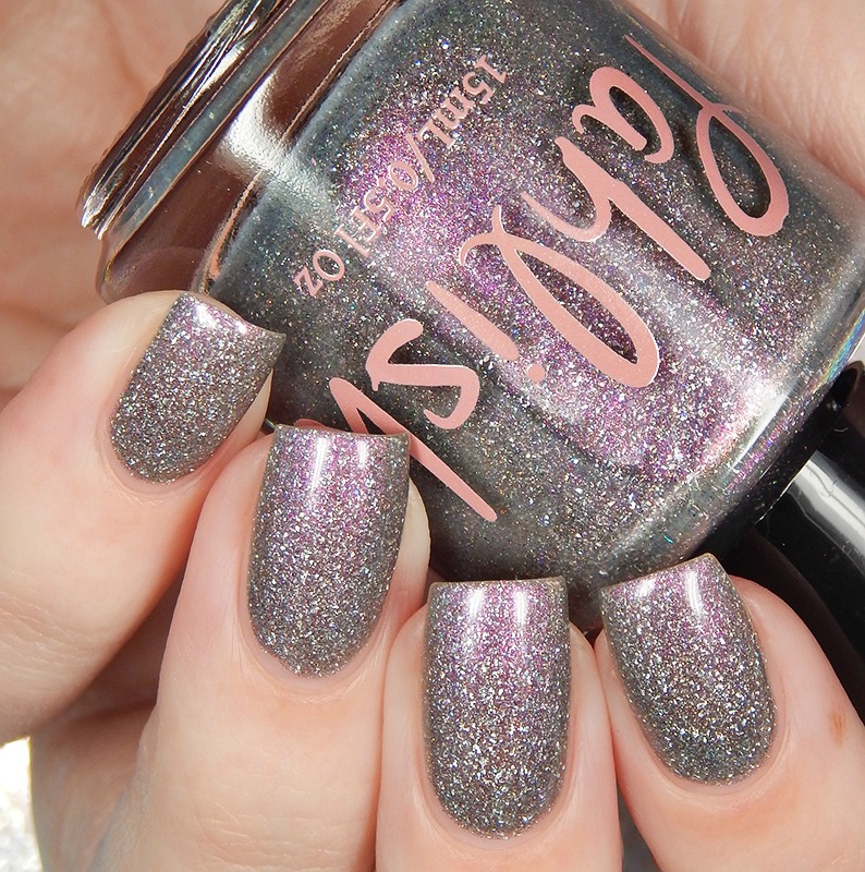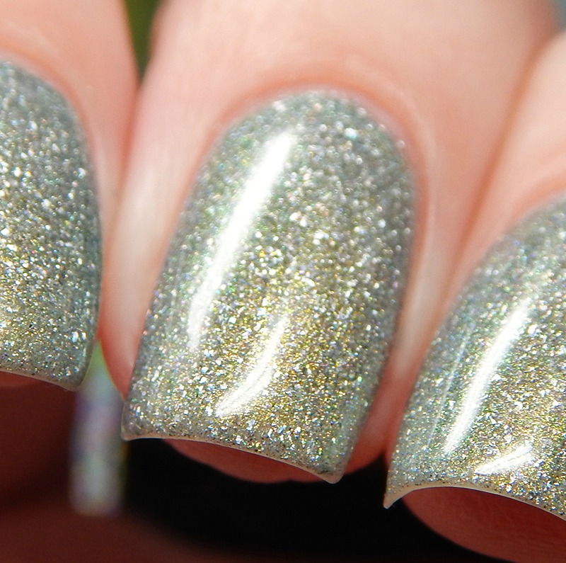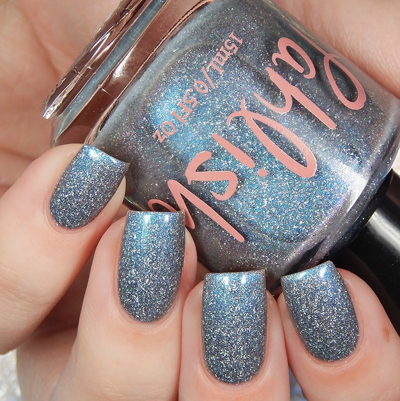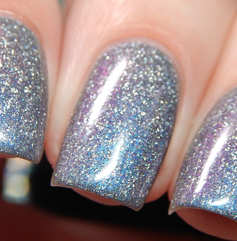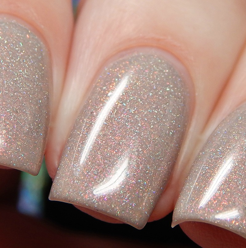 Kappa (River Child) is a soft grey with pink/gold/green shifting multichrome and a mix of holographic flakes and pigments. I used 3 thin coats and a glossy top coat for these photos.