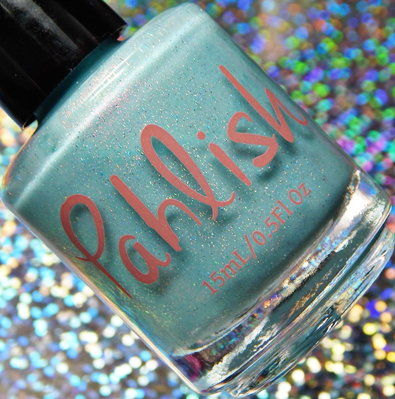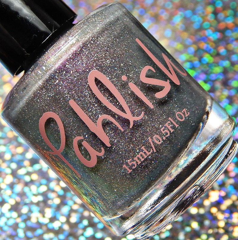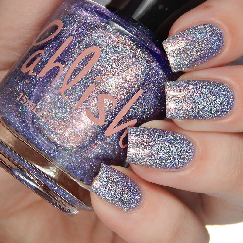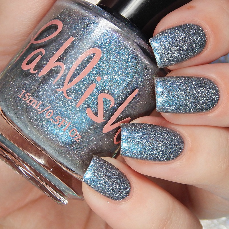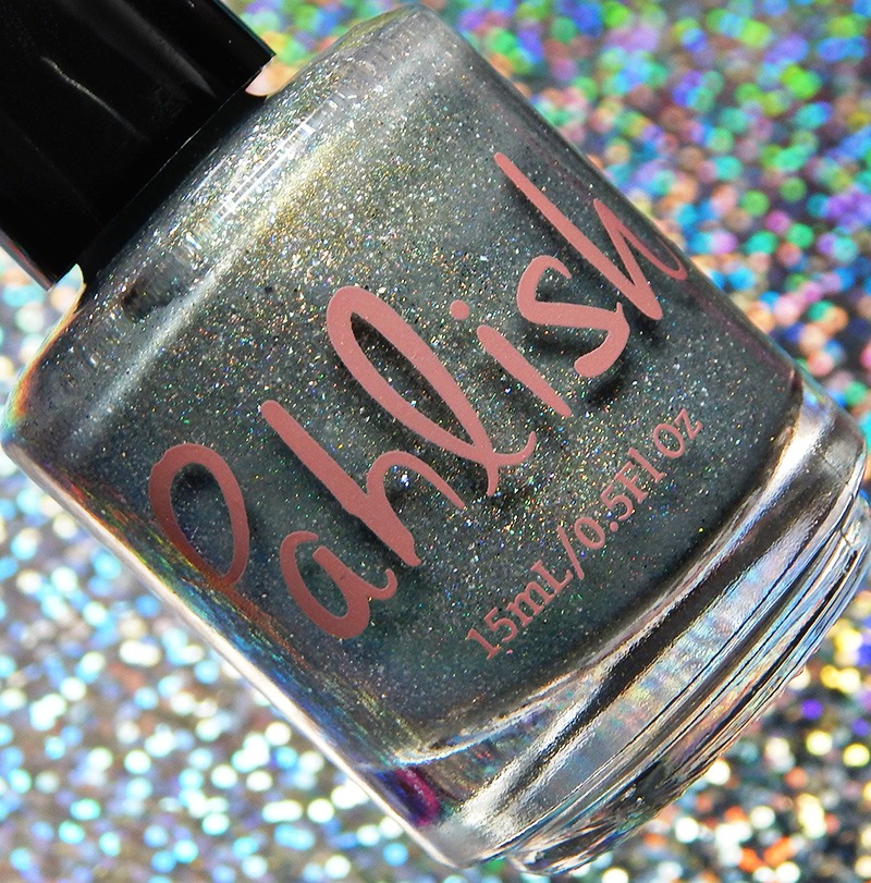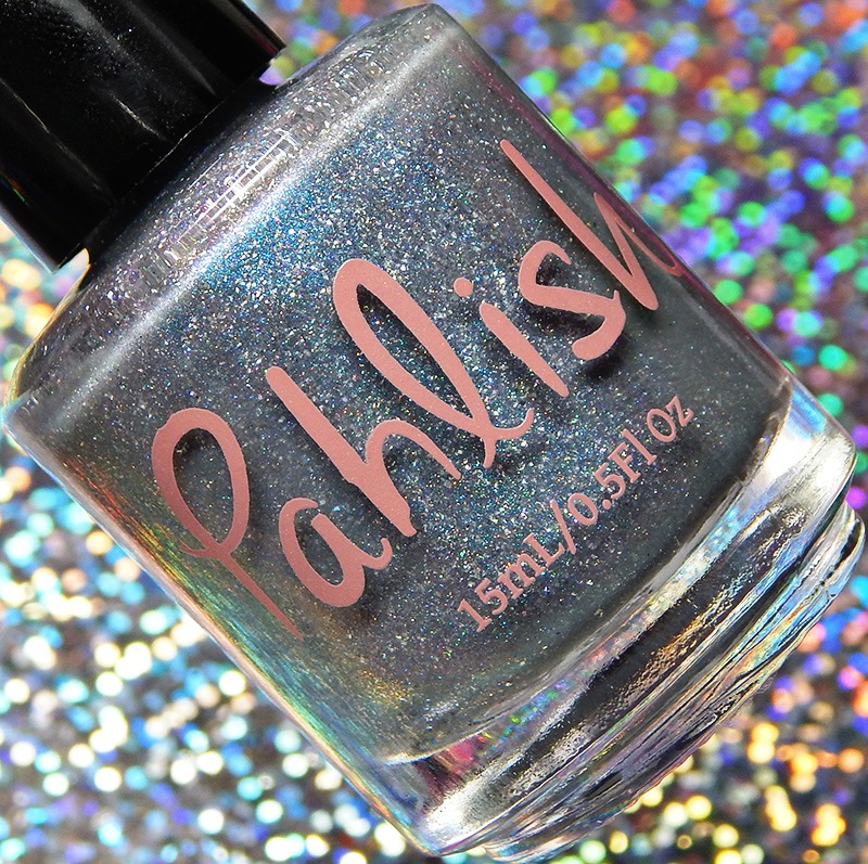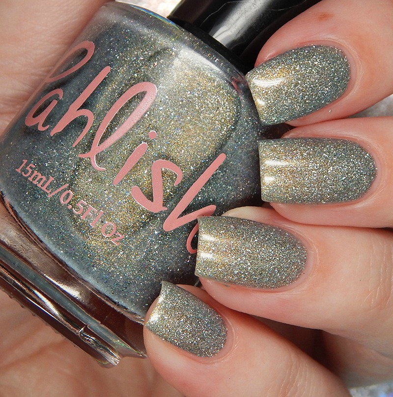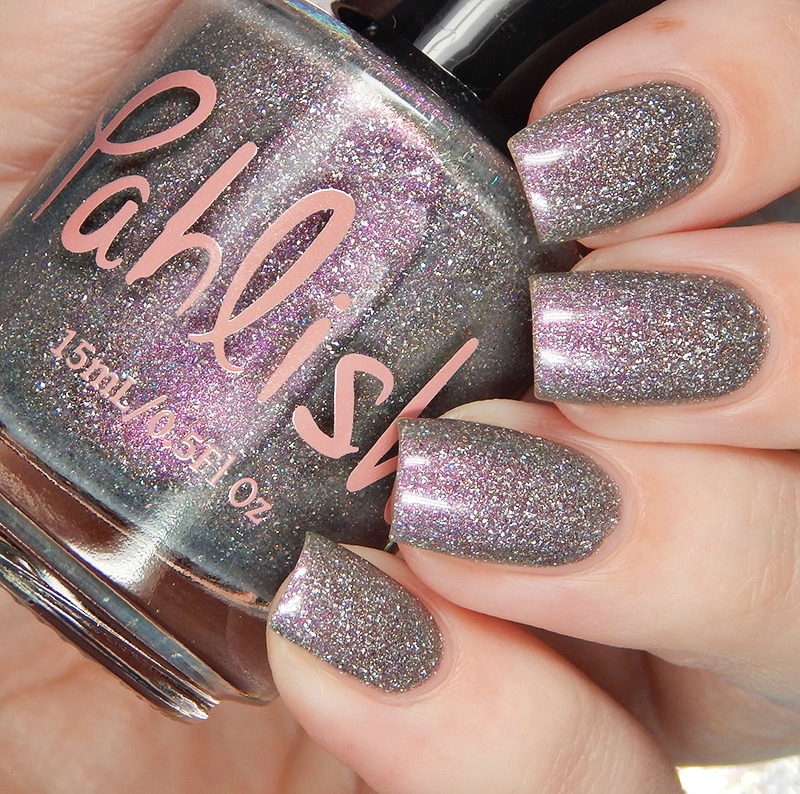 Kappa (River Child) is a soft grey with pink/gold/green shifting multichrome and a mix of holographic flakes and pigments. I used 3 thin coats and a glossy top coat for these photos.