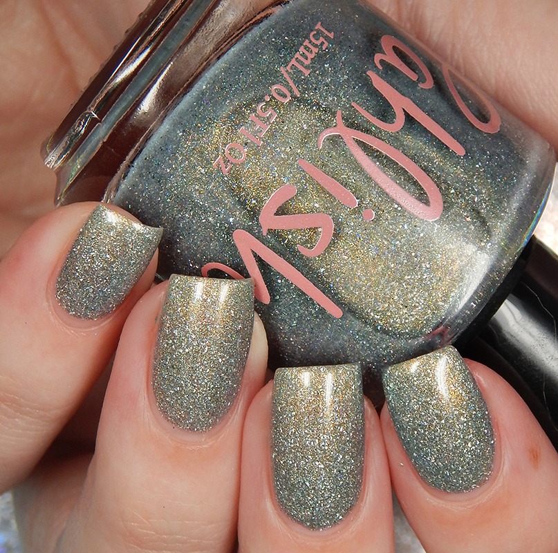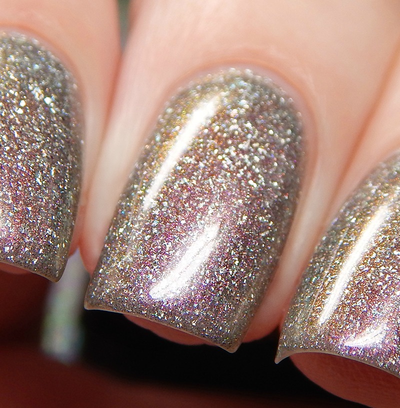 Tanuki (Raccoon Dog) is a soft grey with golden bronze/copper/green/blue shifting multichrome and a mix of holographic flakes and pigments. I used 3 thin coats and a glossy top coat for these photos.