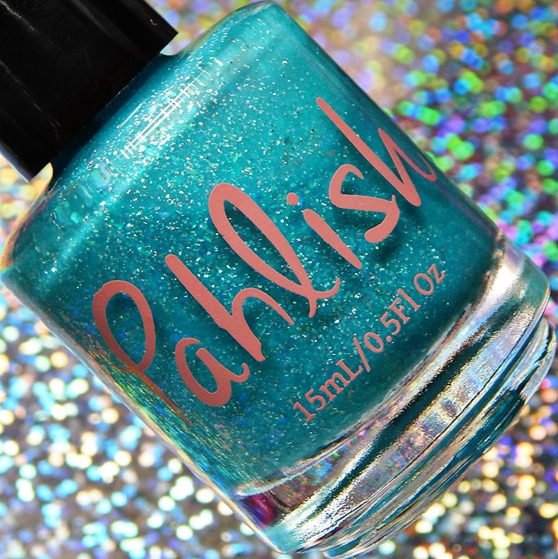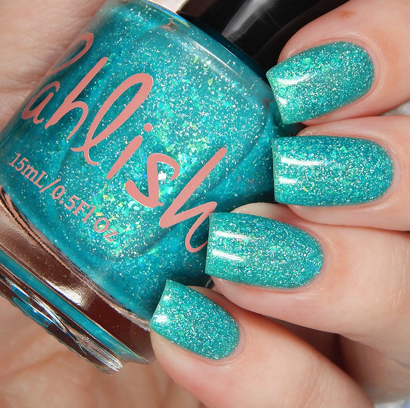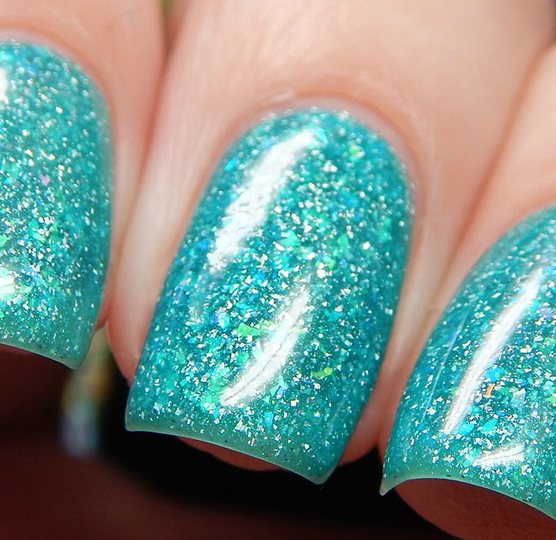 Kasa-Obake (Living Umbrella) is a bright teal jelly with a mix of holographic flakes and teal/purple/pink shifting chameleon flakes. i used 3 thin coats and a glossy top coat for these photos.