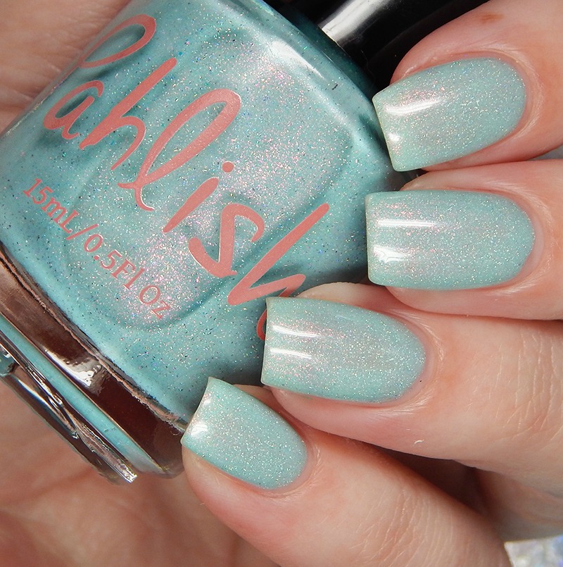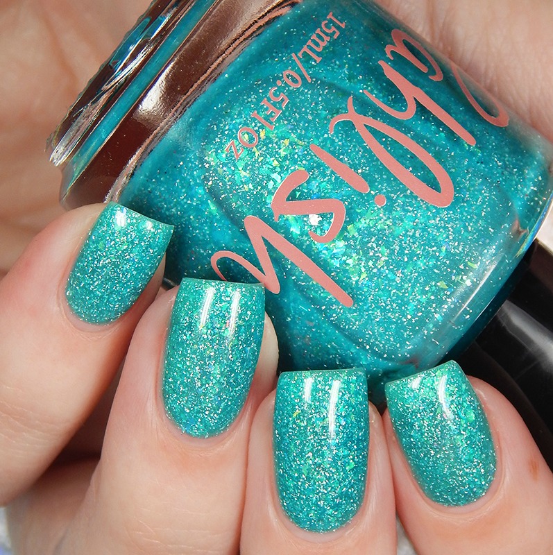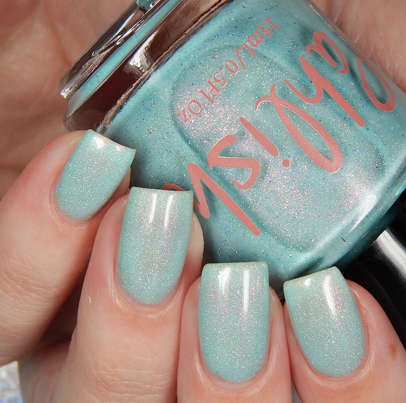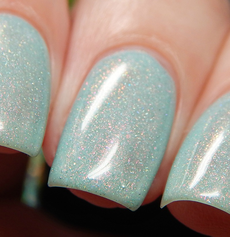 Seto Taisho (Teacup Soldier) is a soft aqua cream with bright red to green shifting shimmer and scattered holographic pigments. I used 3 thin coats and a glossy top coat for these photos.