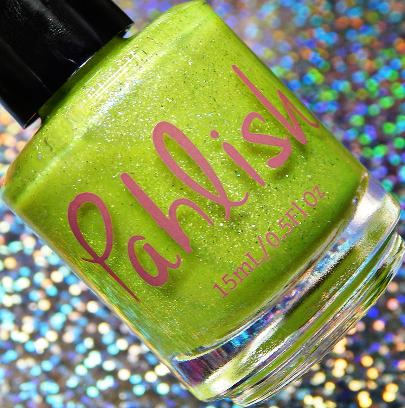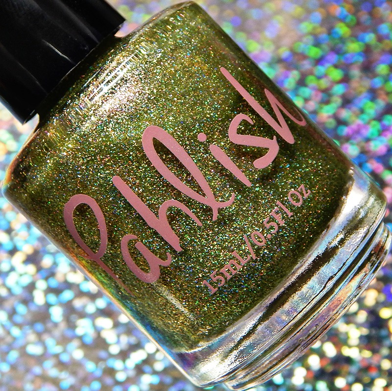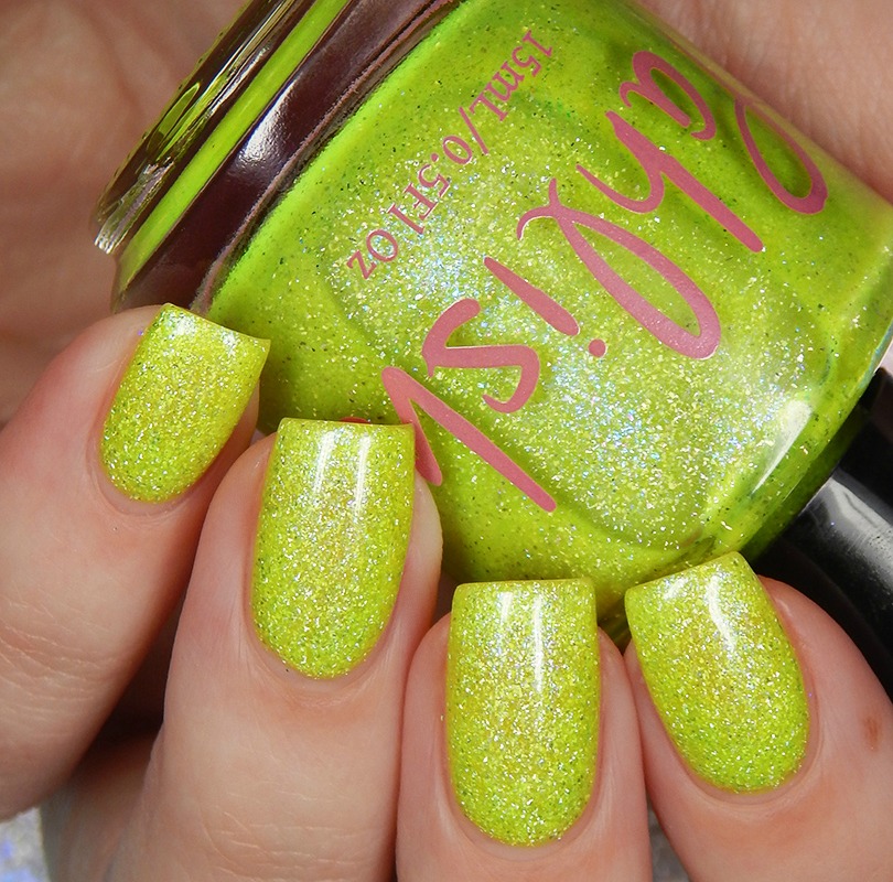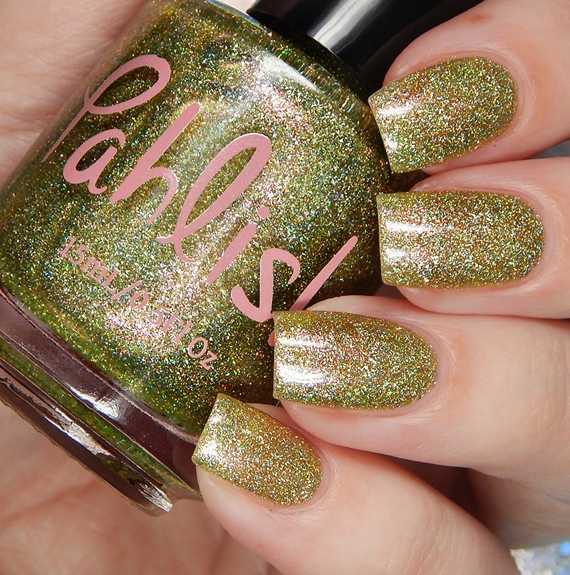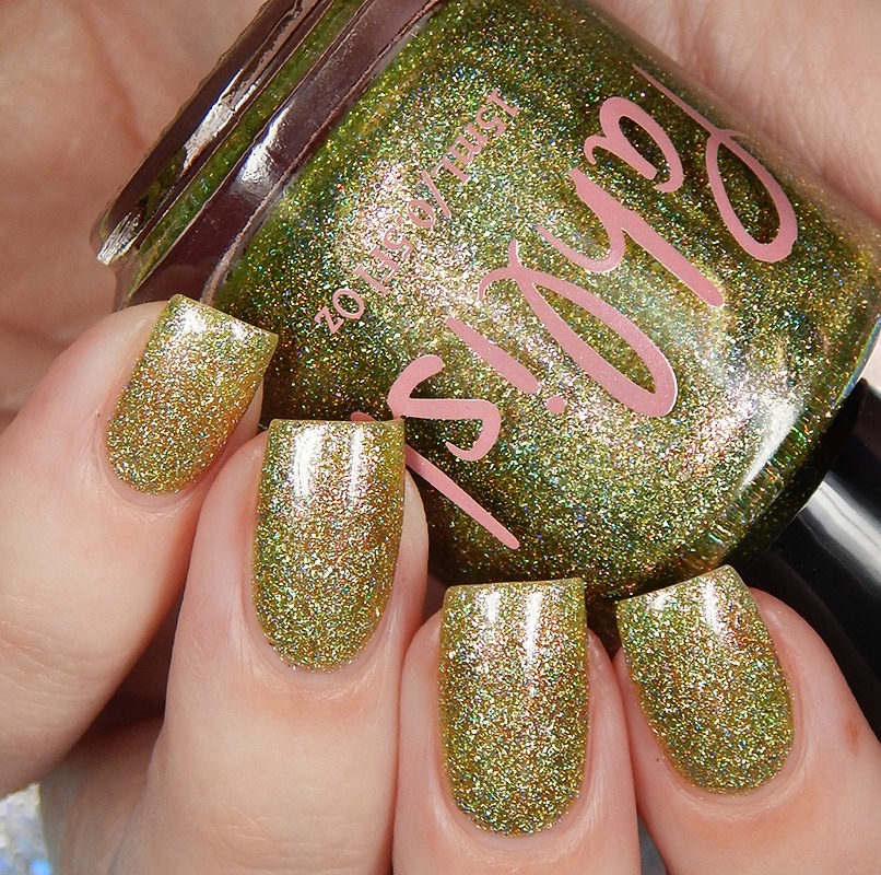 Kitsune (Many-Tailed Fox) is a spring olive green jelly base with a bright pink to gold shifting shimmer and a mix of dense holographic flakes and pigments. I used 3 thin coats and a glossy top coat for these photos.
