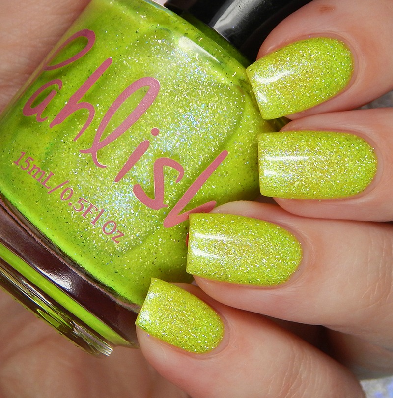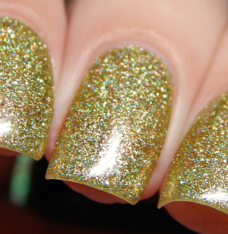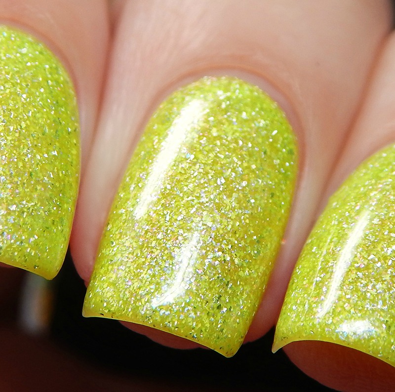 Kintaro (Golden Boy) is a neon yellow with a tinge of green, with dense holographic flakes and violet/blue/pink/orange shifting shimmer. I used 3 thin coats and a glossy top coat for these photos.