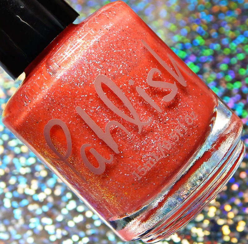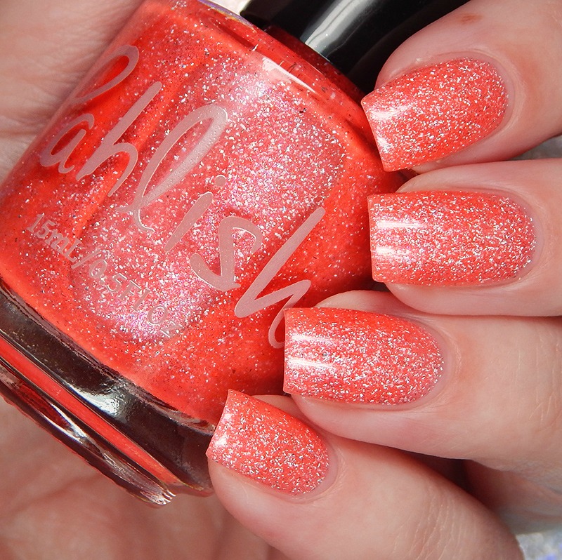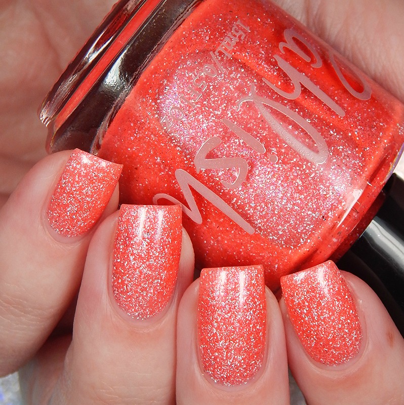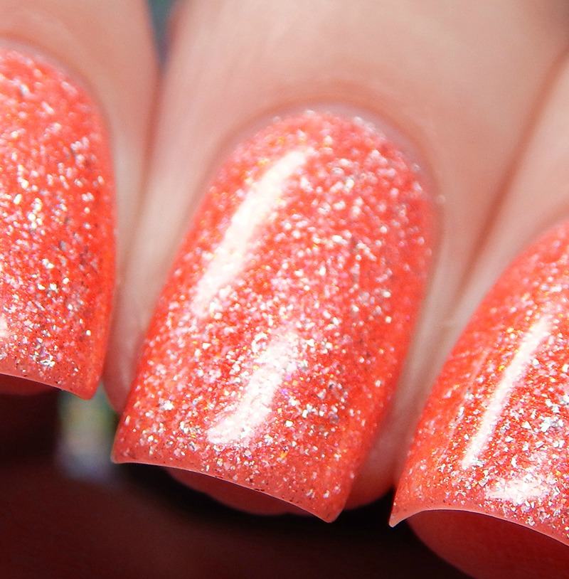 Momotaro (Peach Boy) is a neon coral pink with dense holographic flakes and bright pink to green shifting shimmer. I used 3 thin coats and a glossy top coat for these photos.