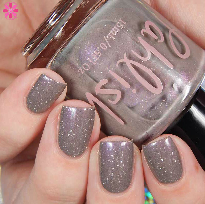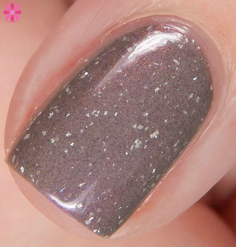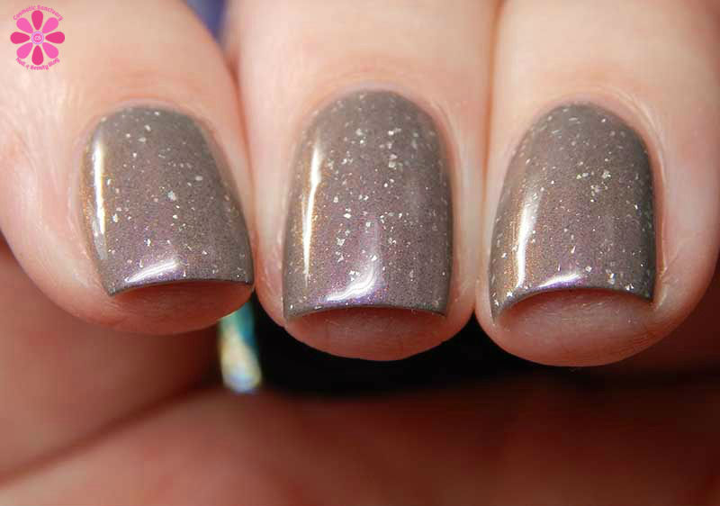 Pahlish Wild Rumpus is a medium greyed out taupe crelly base laced with purple to gold shifting shimmer and a scattering of silver holographic flakes. I used 3 thin coats and a glossy top coat for these photos.