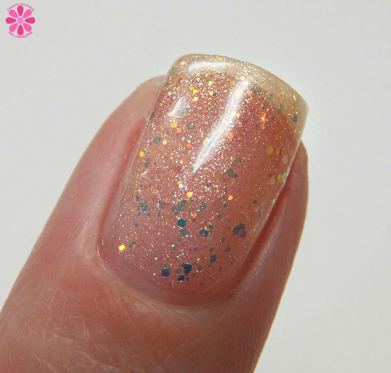 A Crown To Wear is adelicate glitter topper that is filled with shimmer and iridescent glitter. It matches nicely with In Grace and Beauty, but can also go over an assortment of other polishes in your collection.