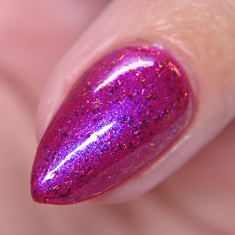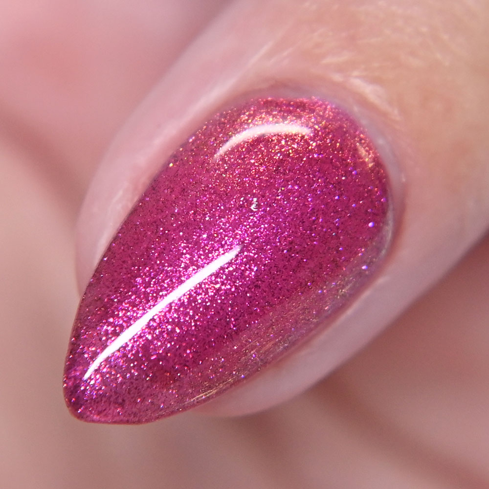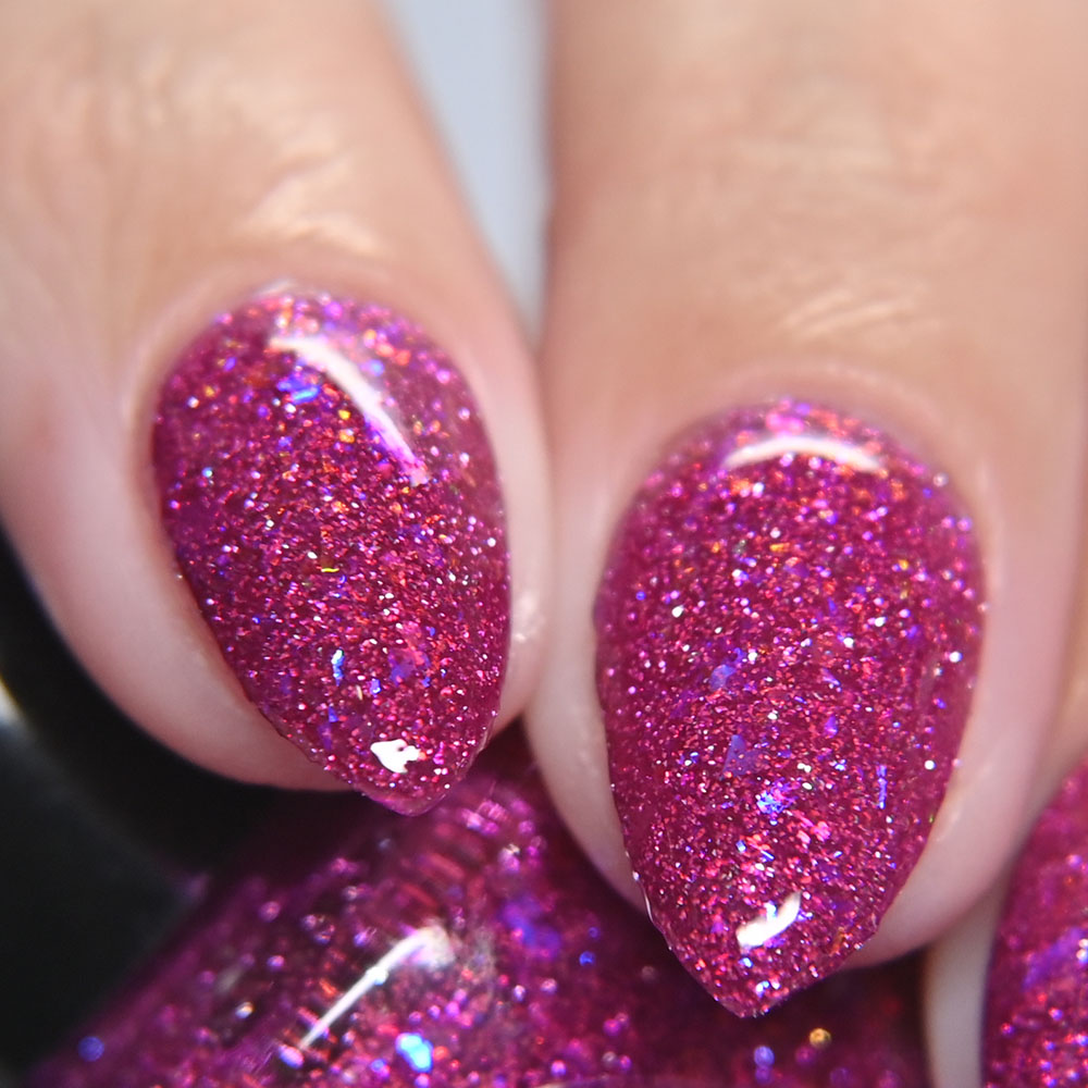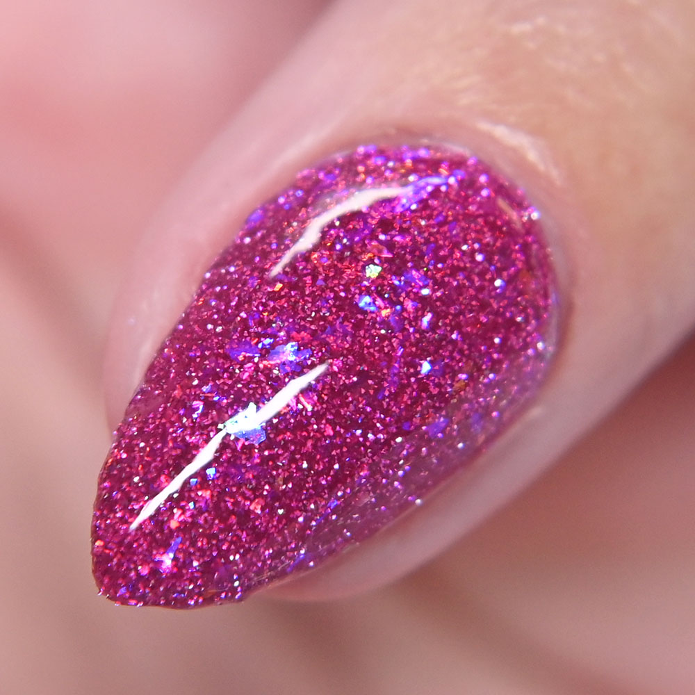 Description: Take Her to the Moon is a vibrant magenta jelly base loaded with pink reflective glitter and iridescent blue/violet and pink/orange/yellow flakes.
