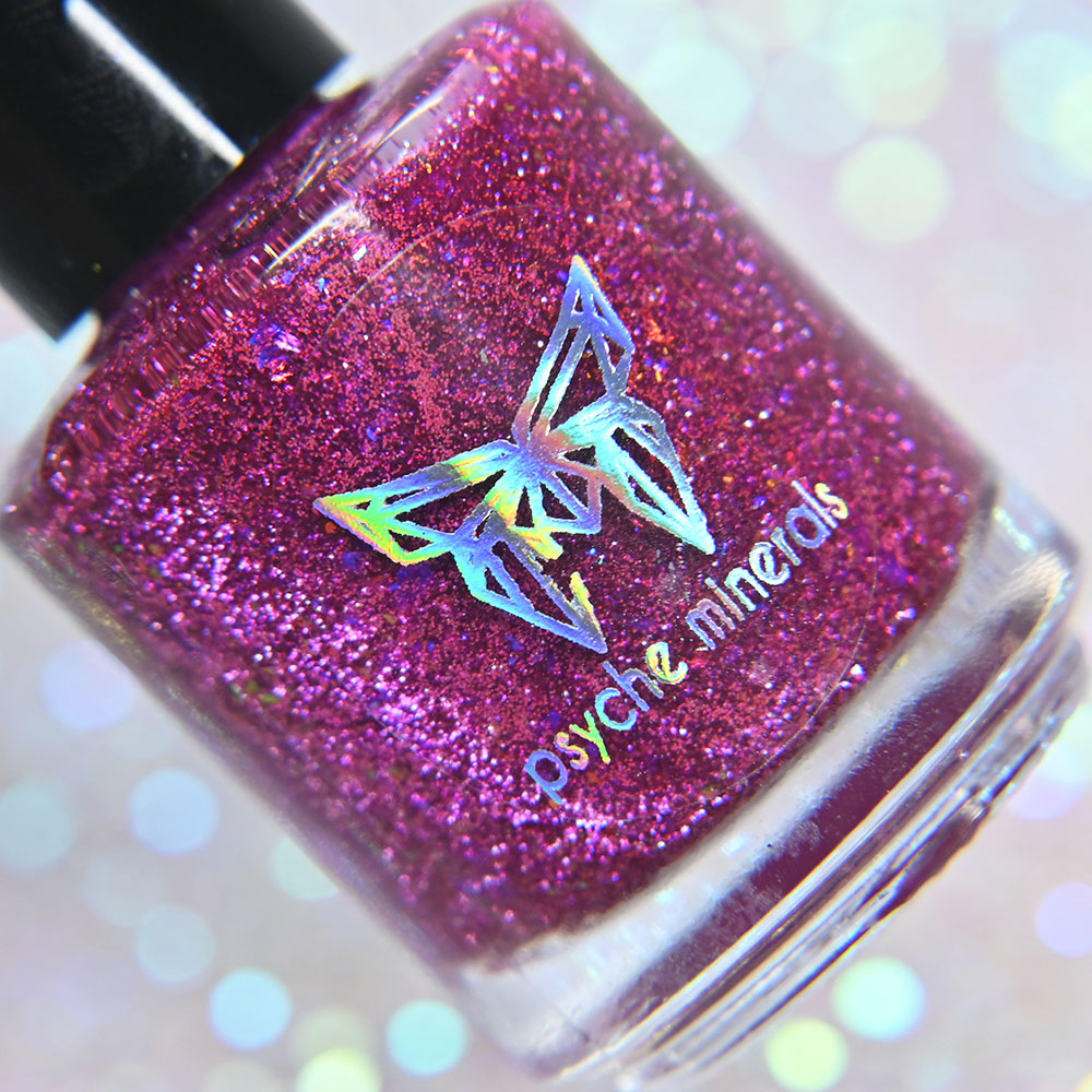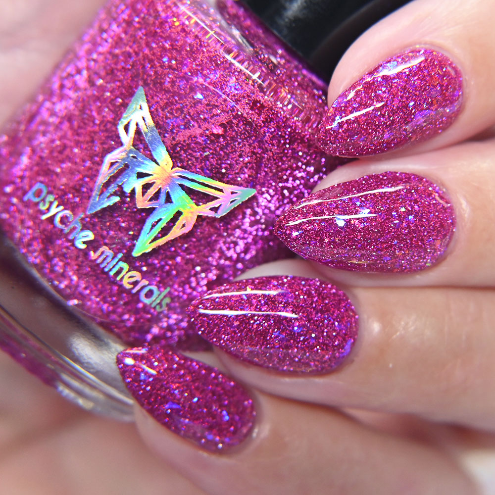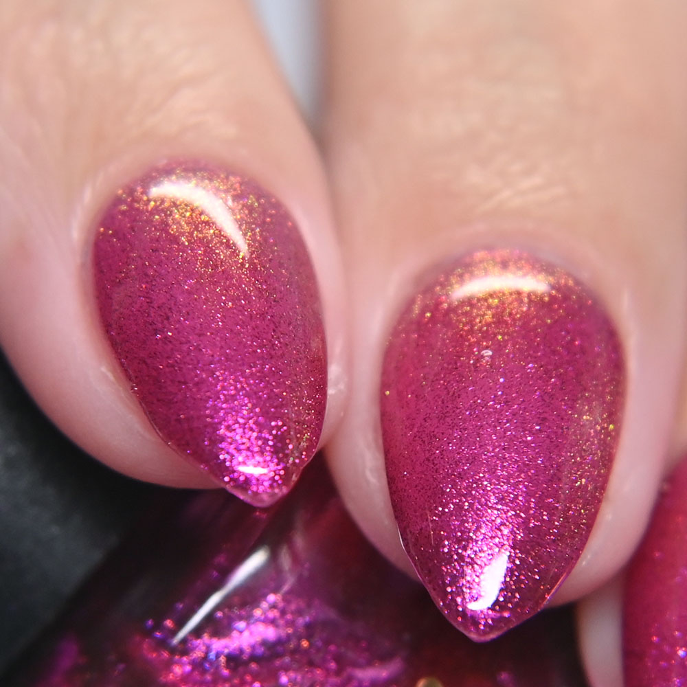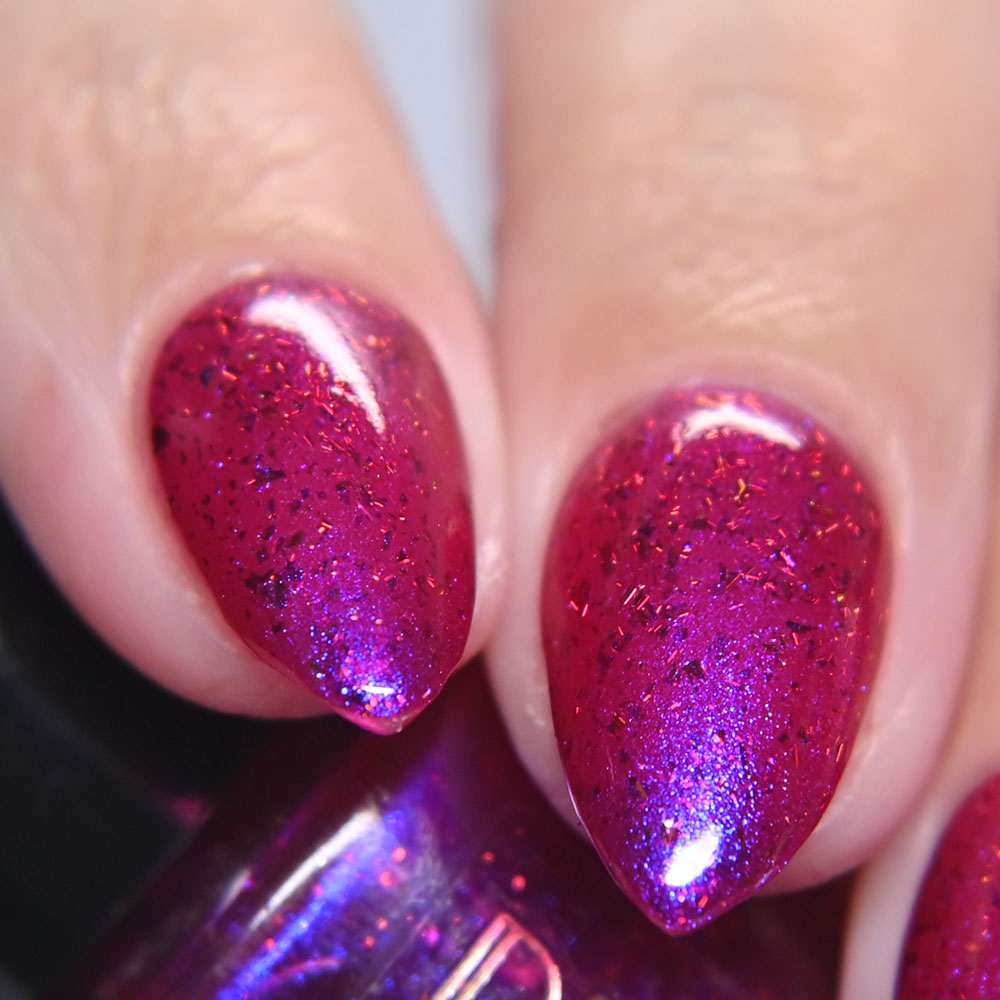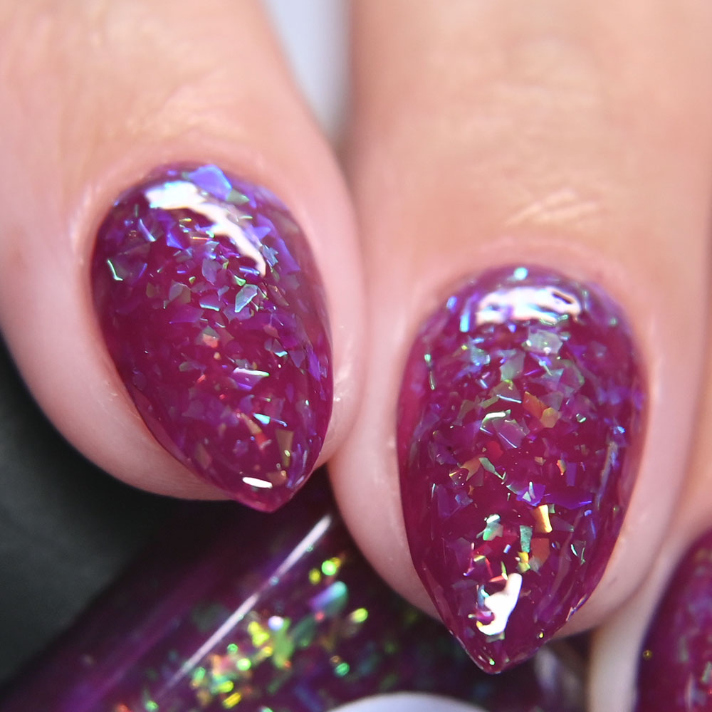 Description: Take Her to the Moon is a vibrant magenta jelly base loaded with pink reflective glitter and iridescent blue/violet and pink/orange/yellow flakes.