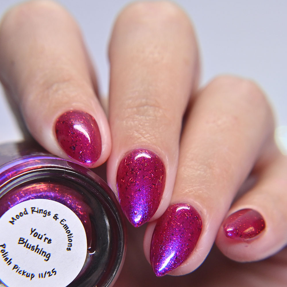 Description: You’re Blushing is a bright raspberry pink polish with purple shimmer and orangey-red metallic flakes.
