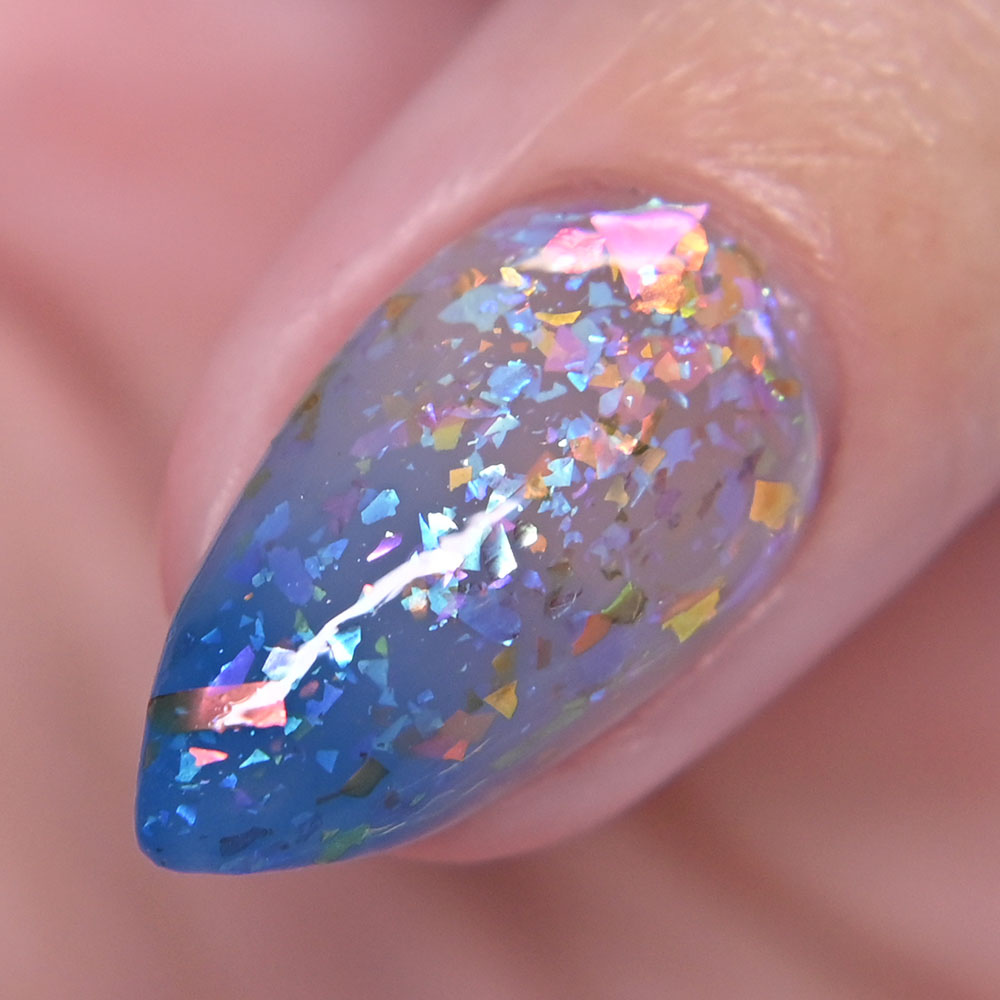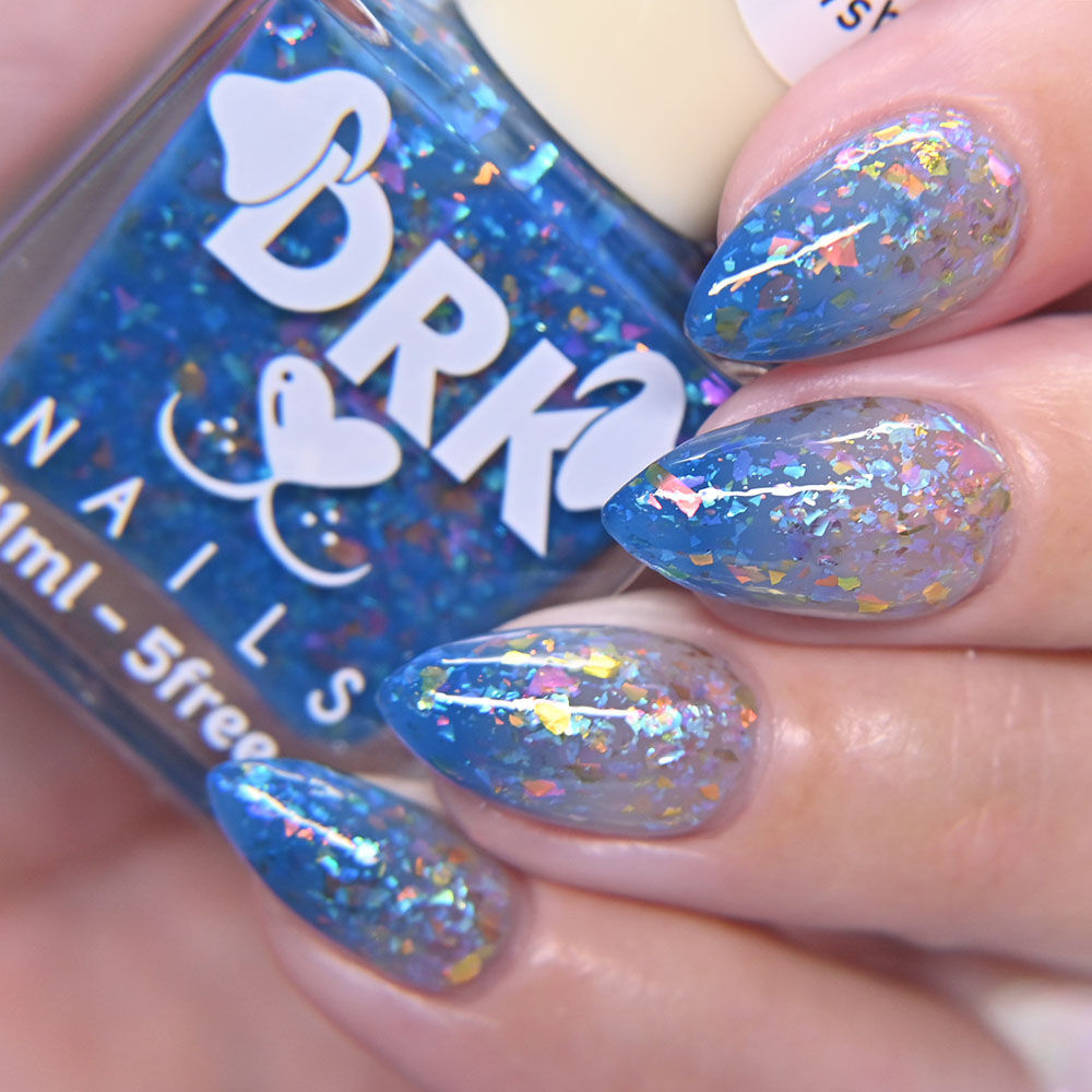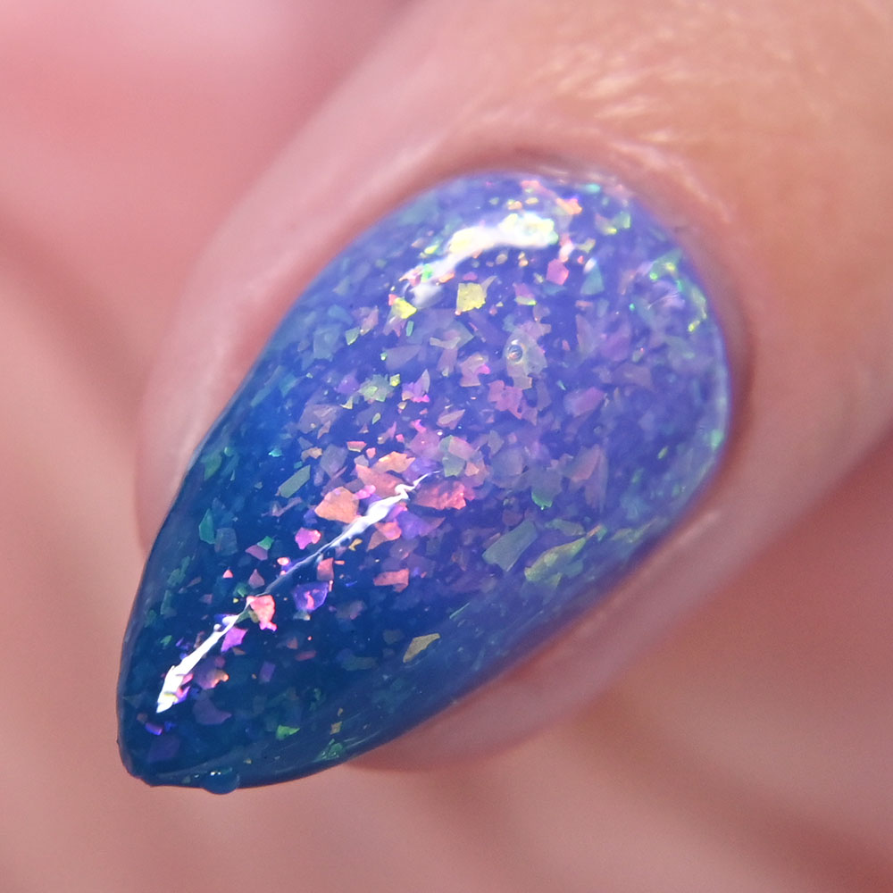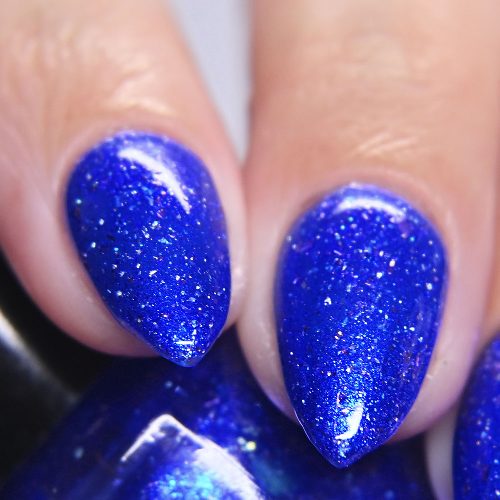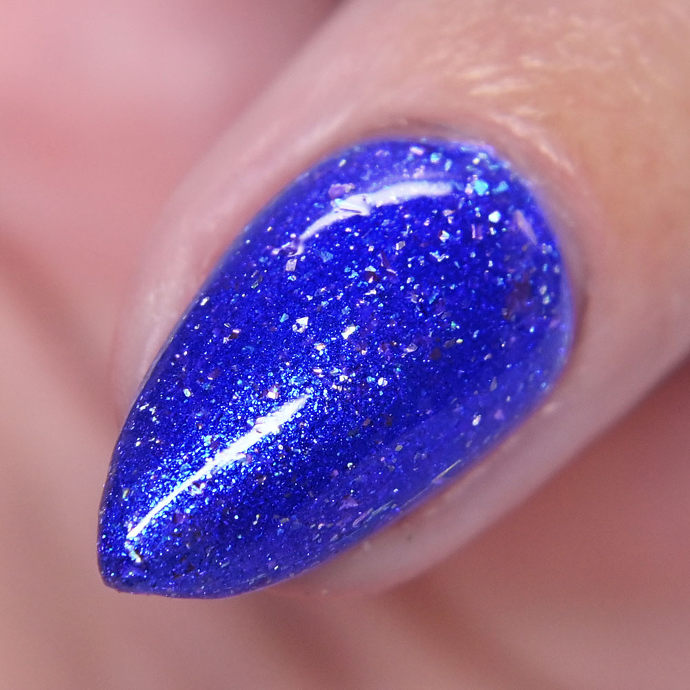 Description: Too Sad To Run is a vivid blue with blue/purple shimmer, purple chrome flakies, and silver holographic flakies.