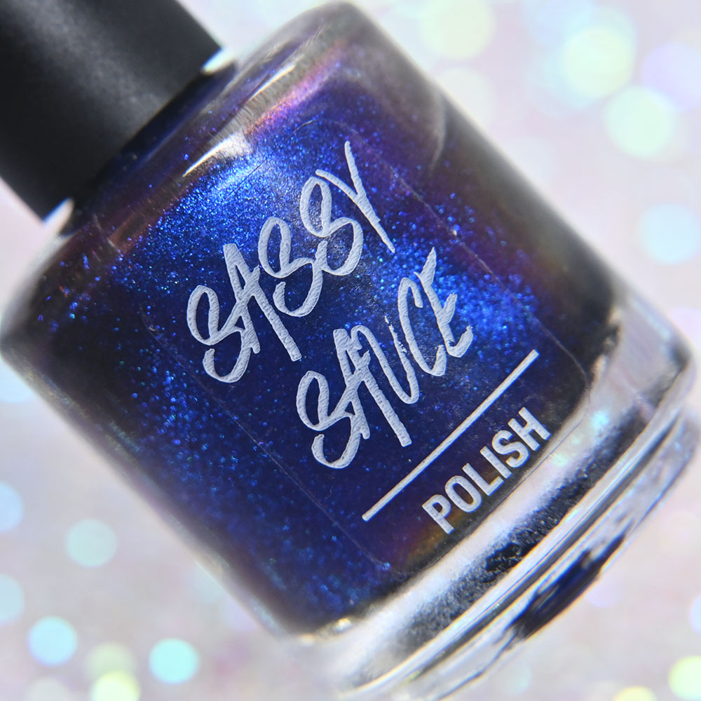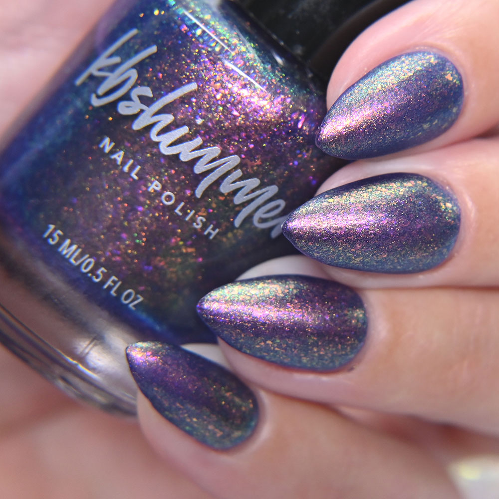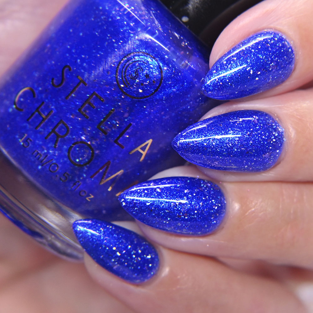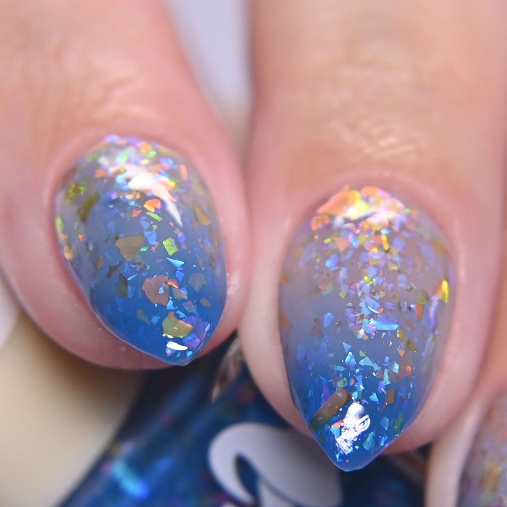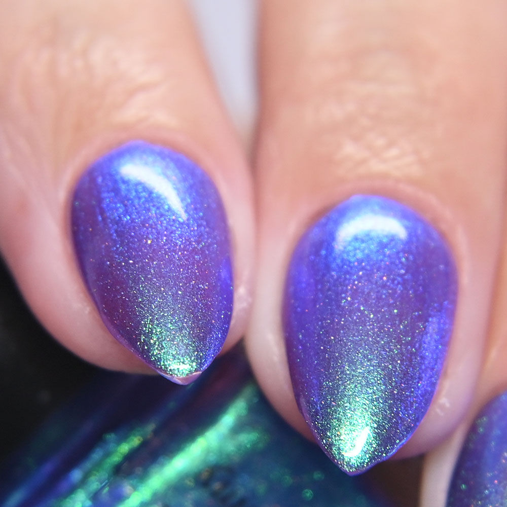 Description: Too Sad To Run is a vivid blue with blue/purple shimmer, purple chrome flakies, and silver holographic flakies.