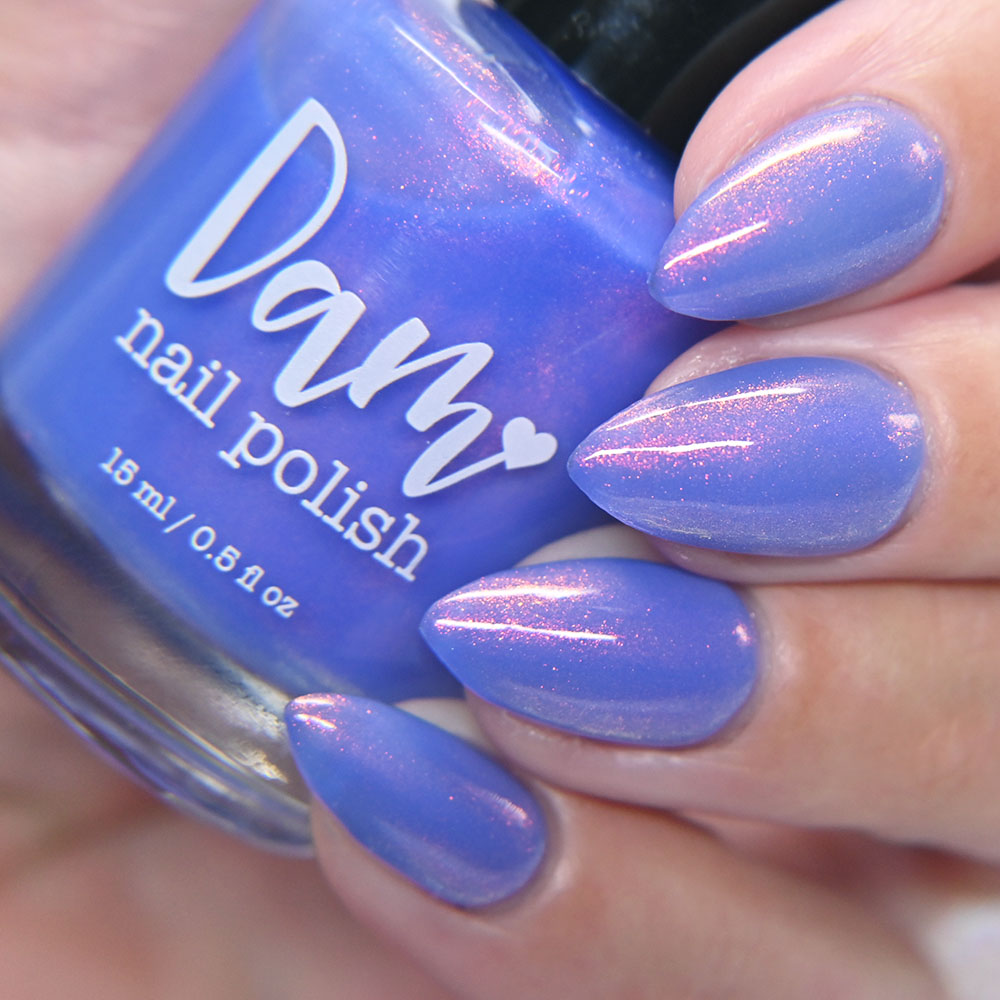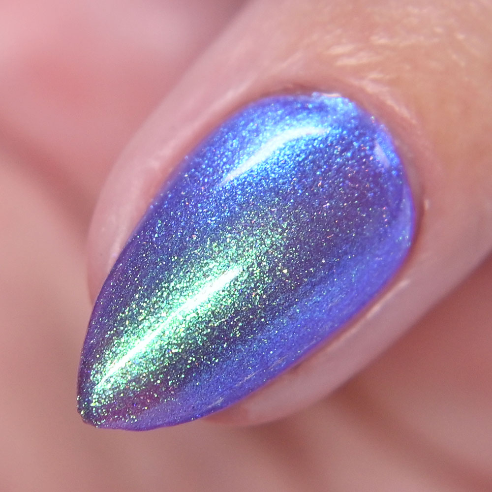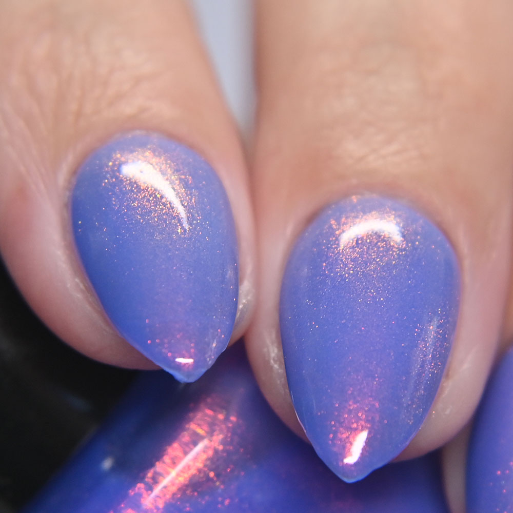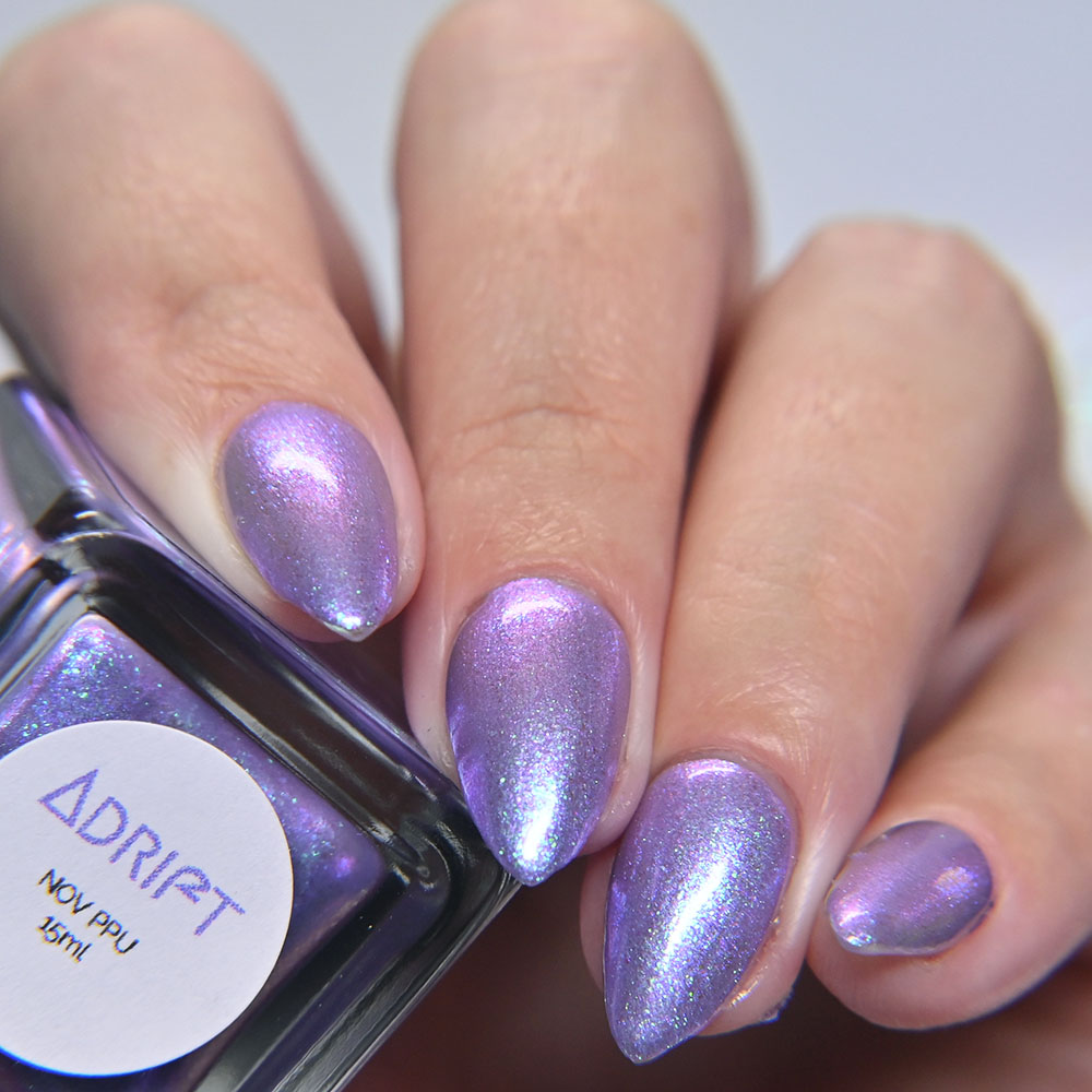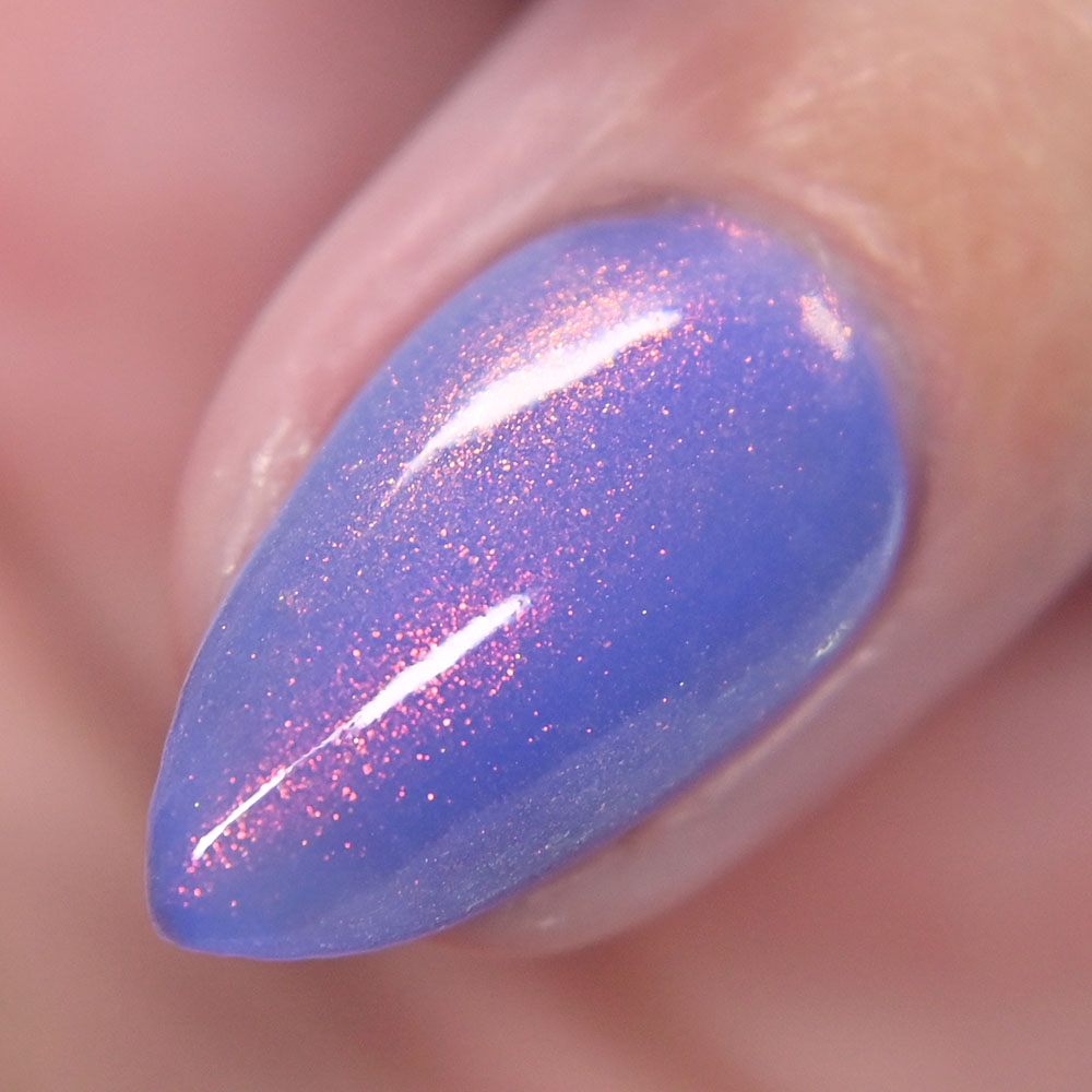 Description: Adrift is a gentle lavender with a purple to pink pearl shift and a large particle shimmer that shifts blue, to indigo, and green.