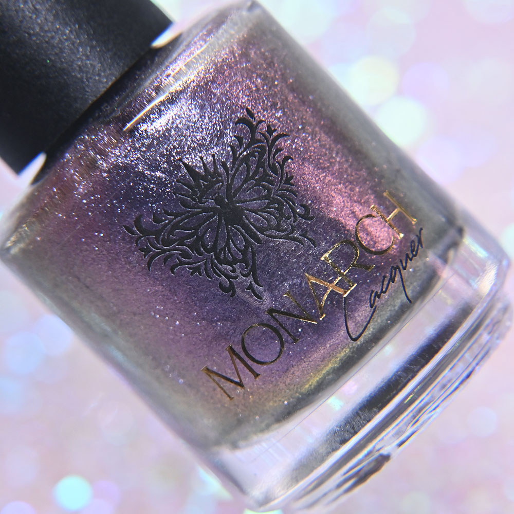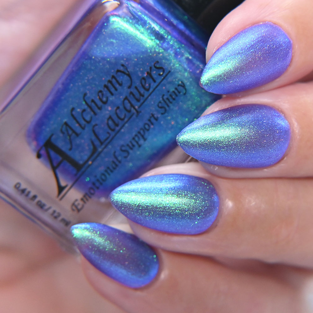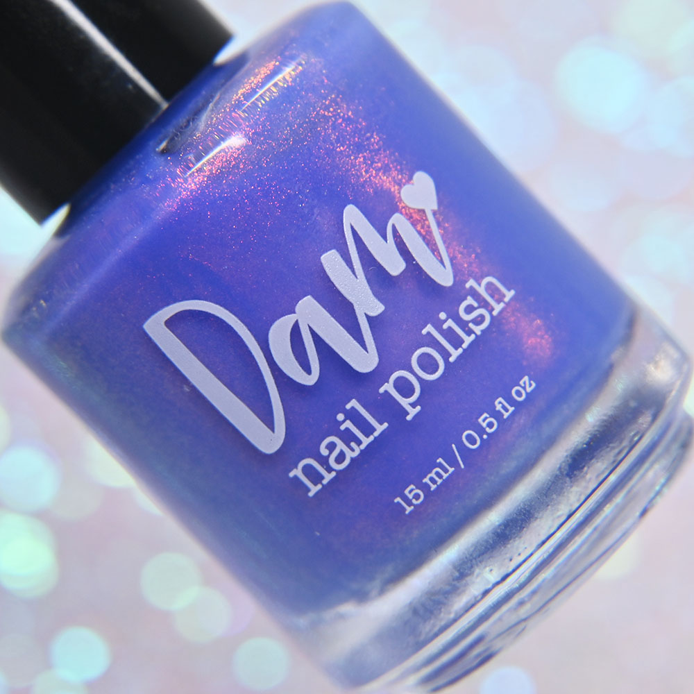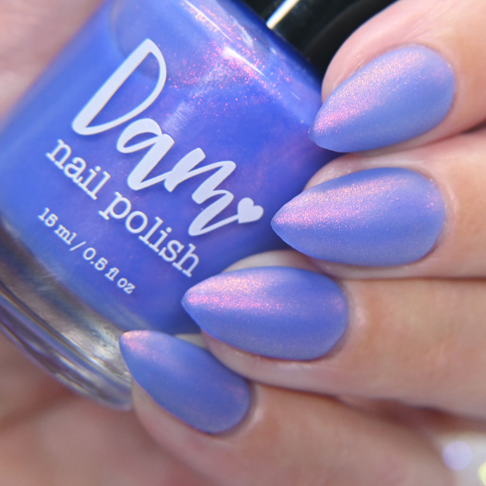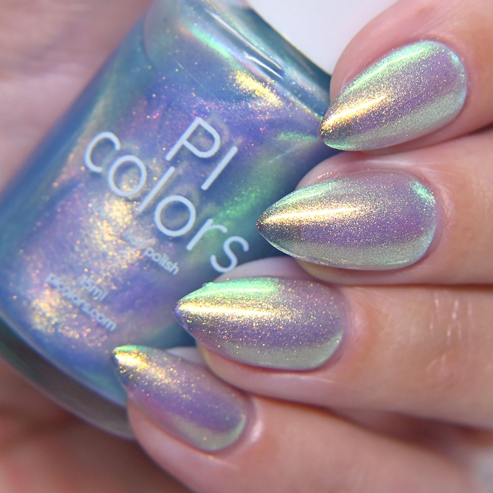Description: Adrift is a gentle lavender with a purple to pink pearl shift and a large particle shimmer that shifts blue, to indigo, and green.