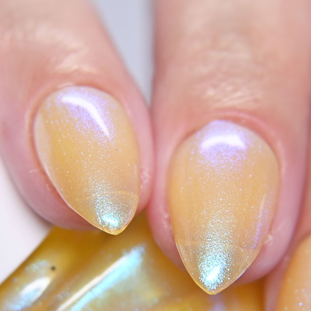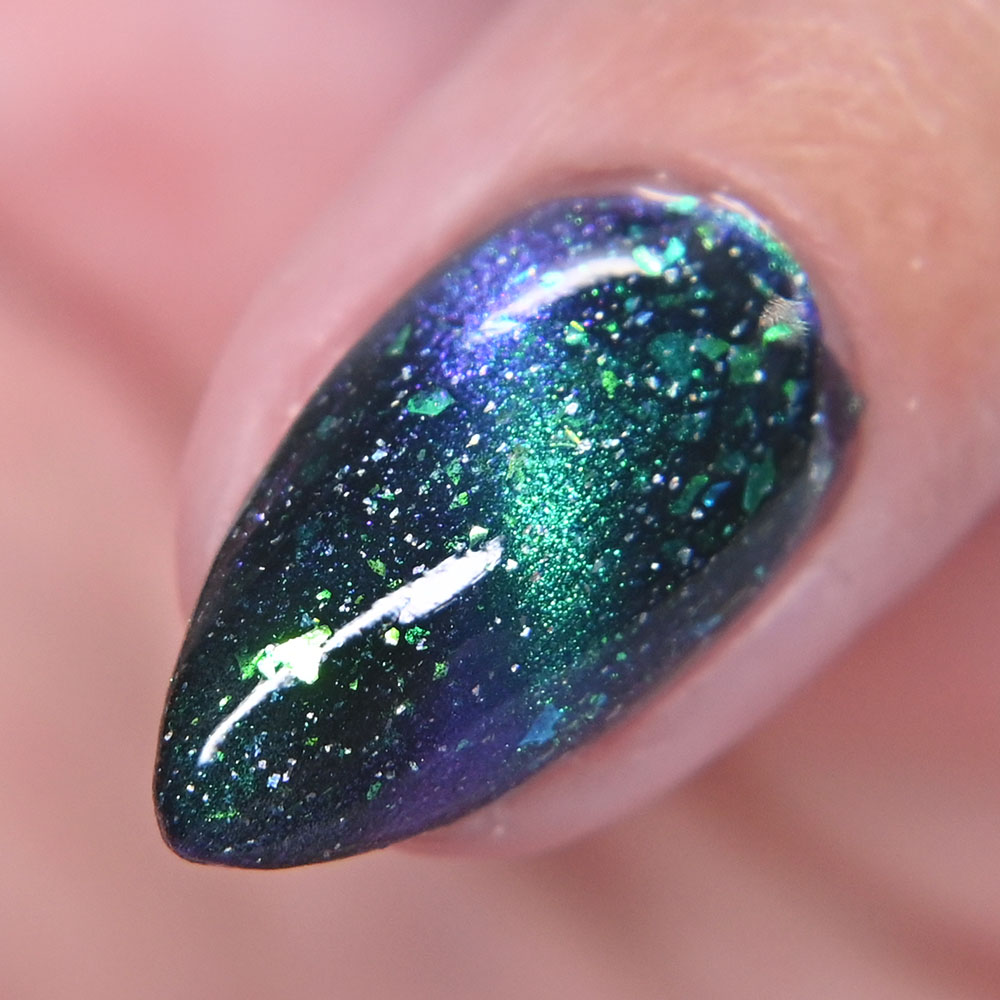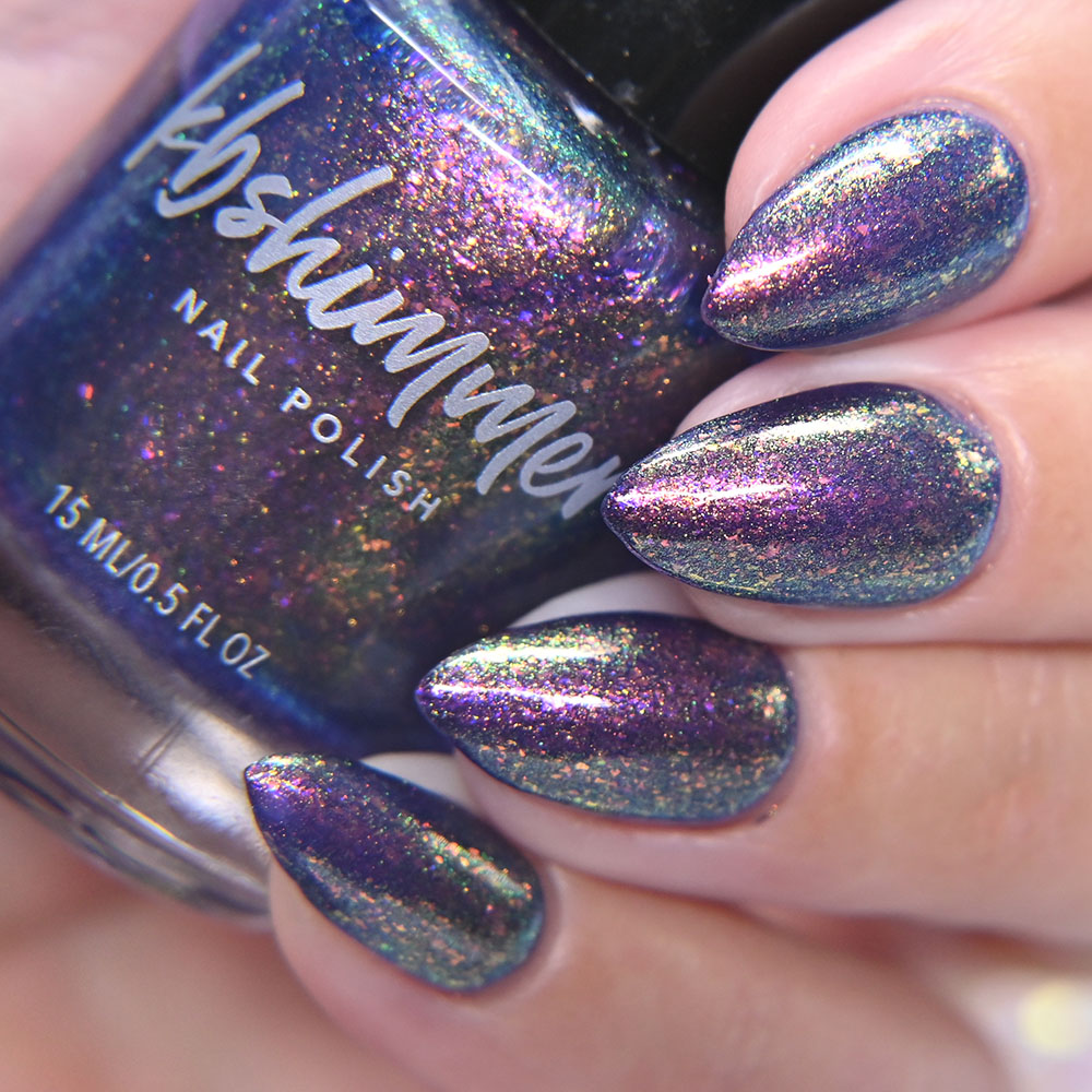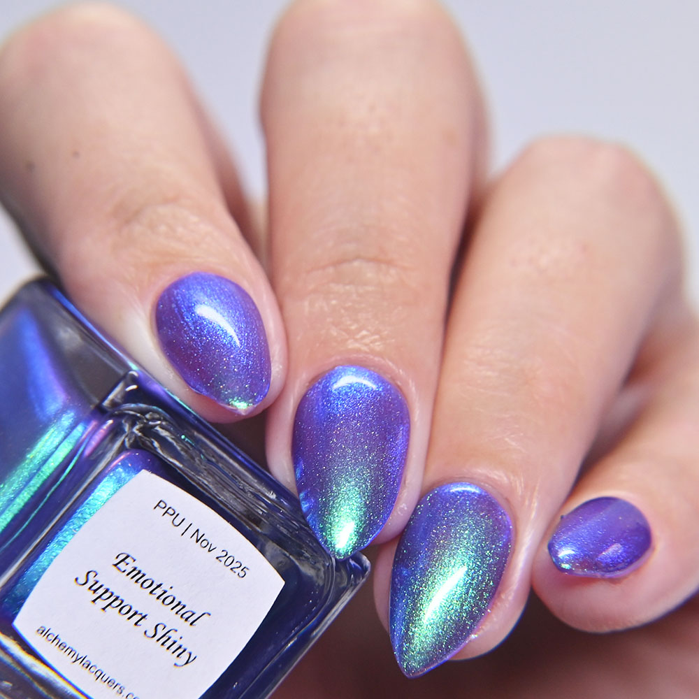 Description: Emotional Support Shiny is a lightly tinted indigo jelly nail base with green to turquoise to blue to purple shifting iridescent shimmer with a touch of holographic shimmer.