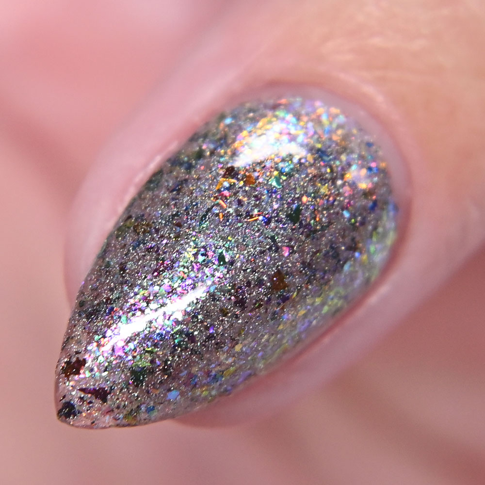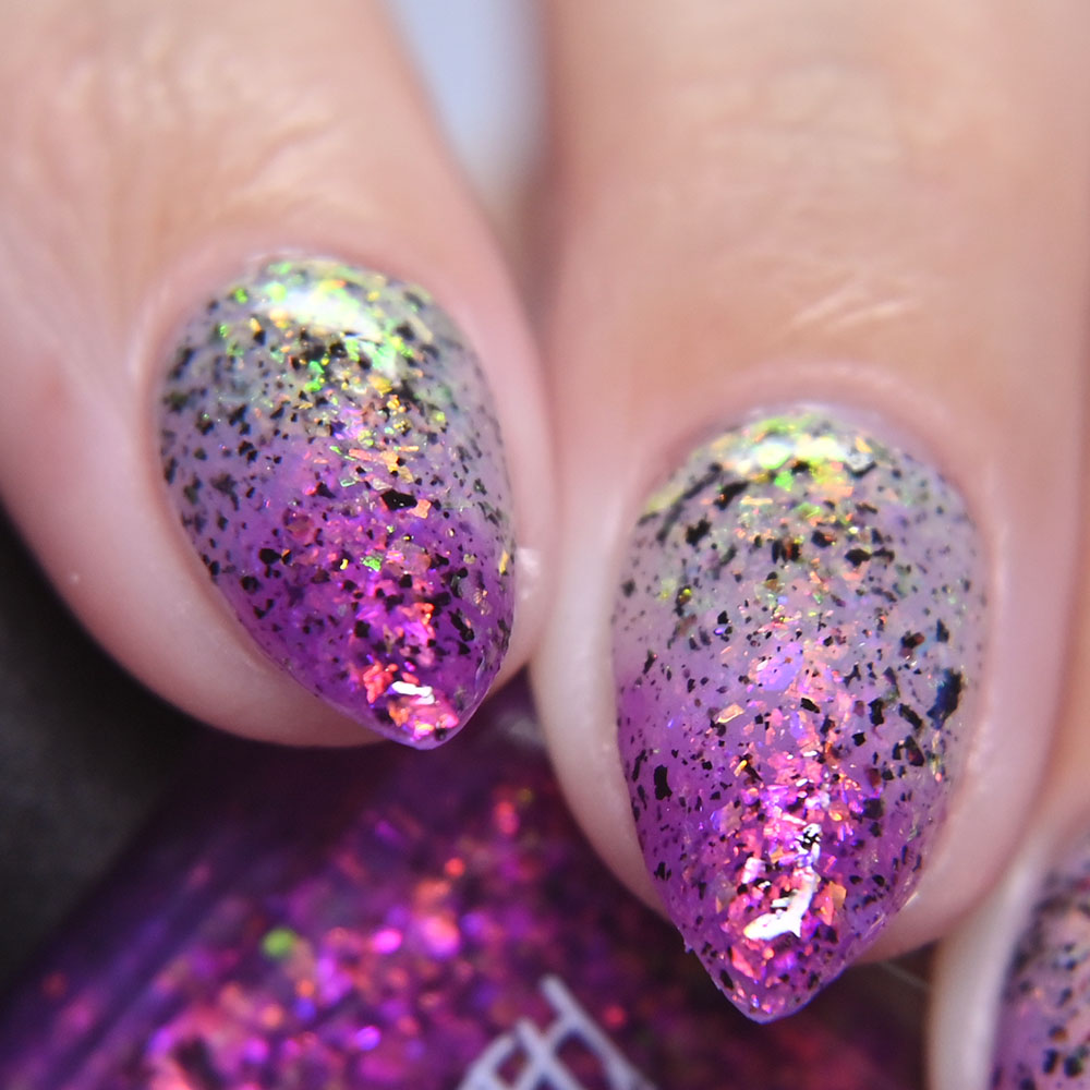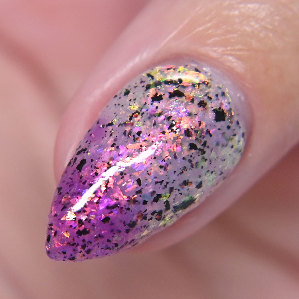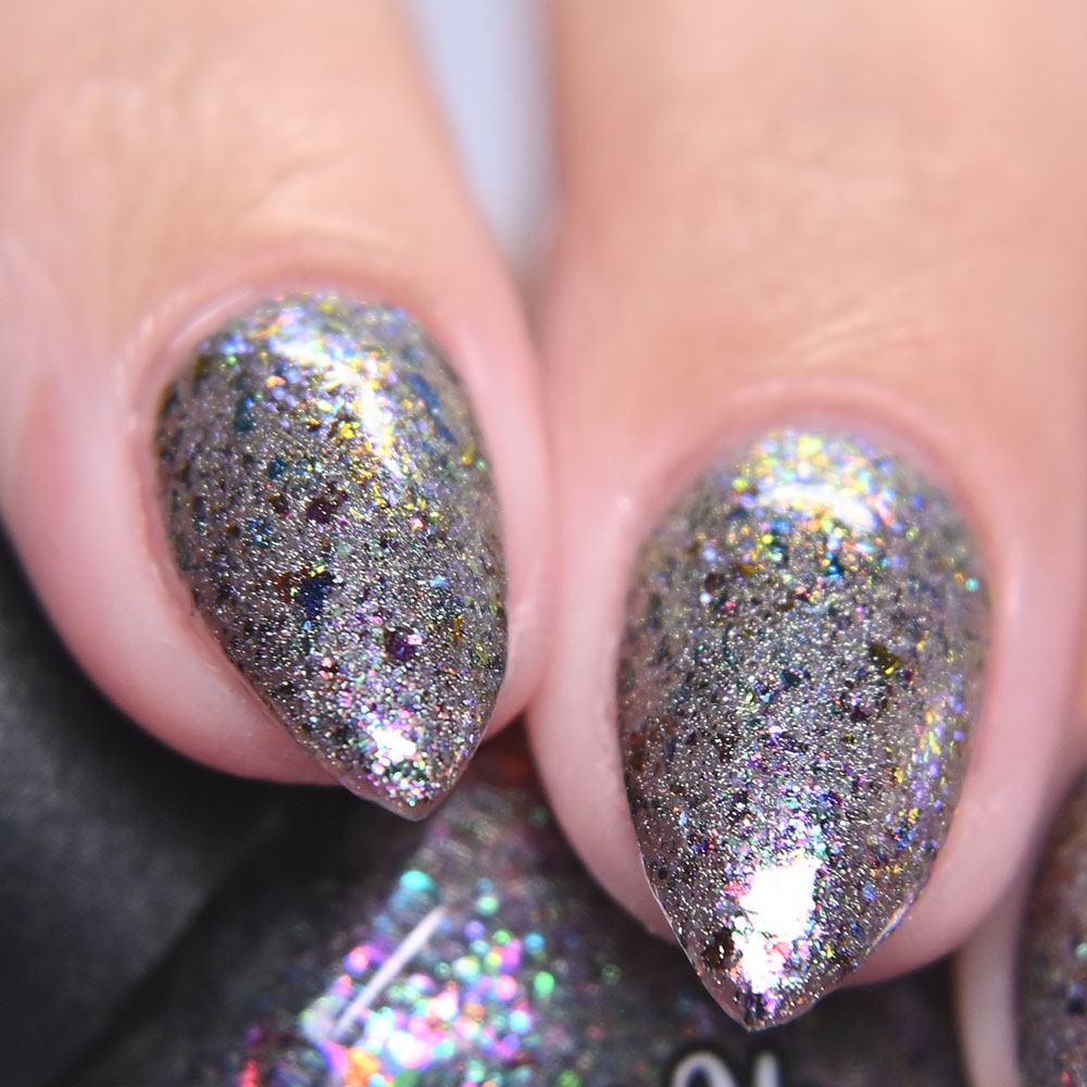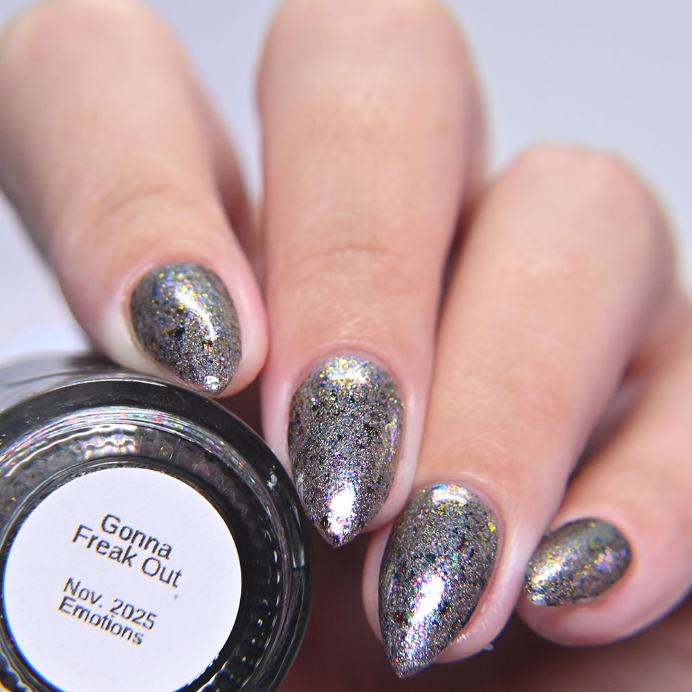 Description: Gonna Freak Out is a sheer jelly black base, scattered holographic glitter, multiple fx colorshift flakies, and multiple intense ucc flakes.