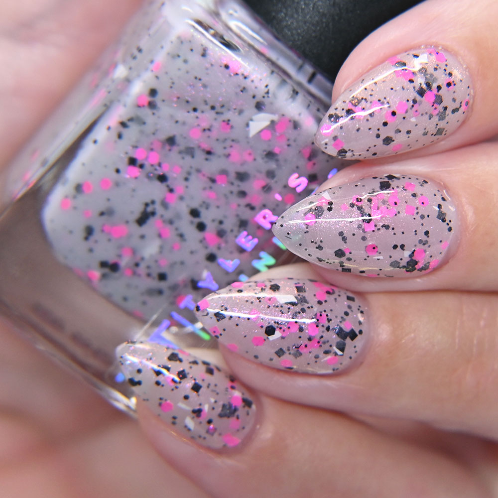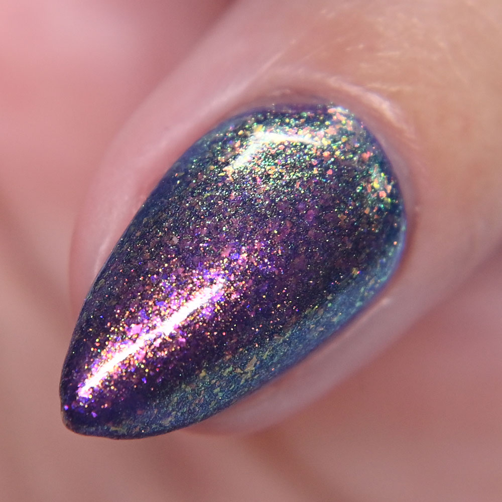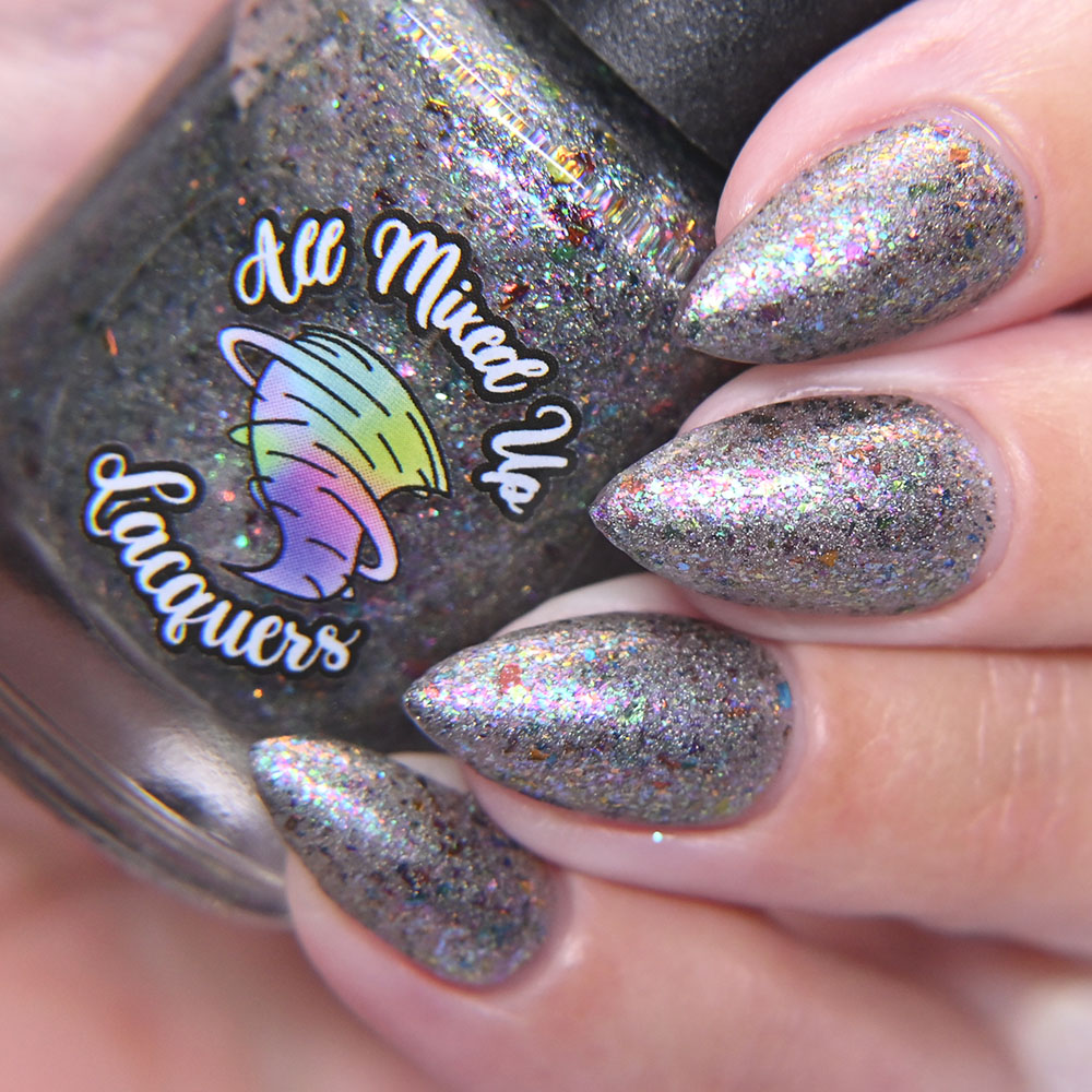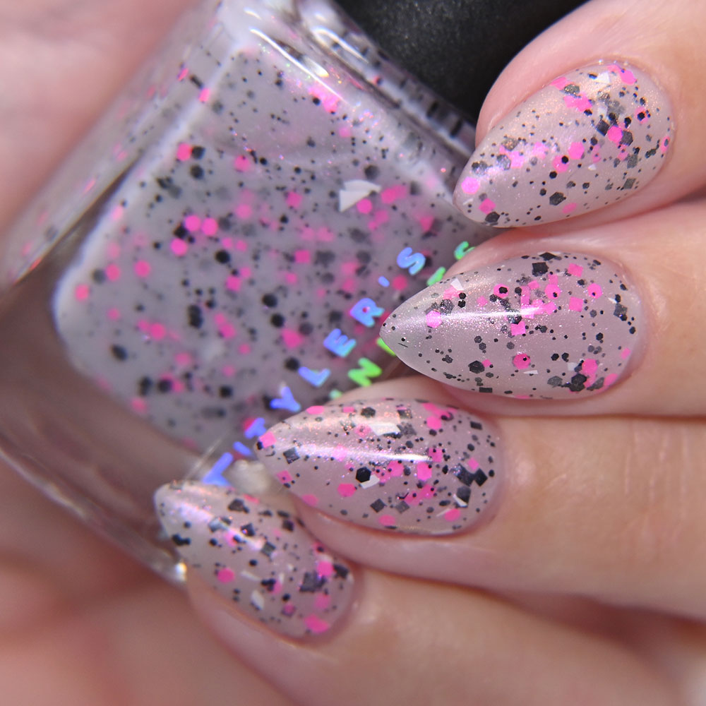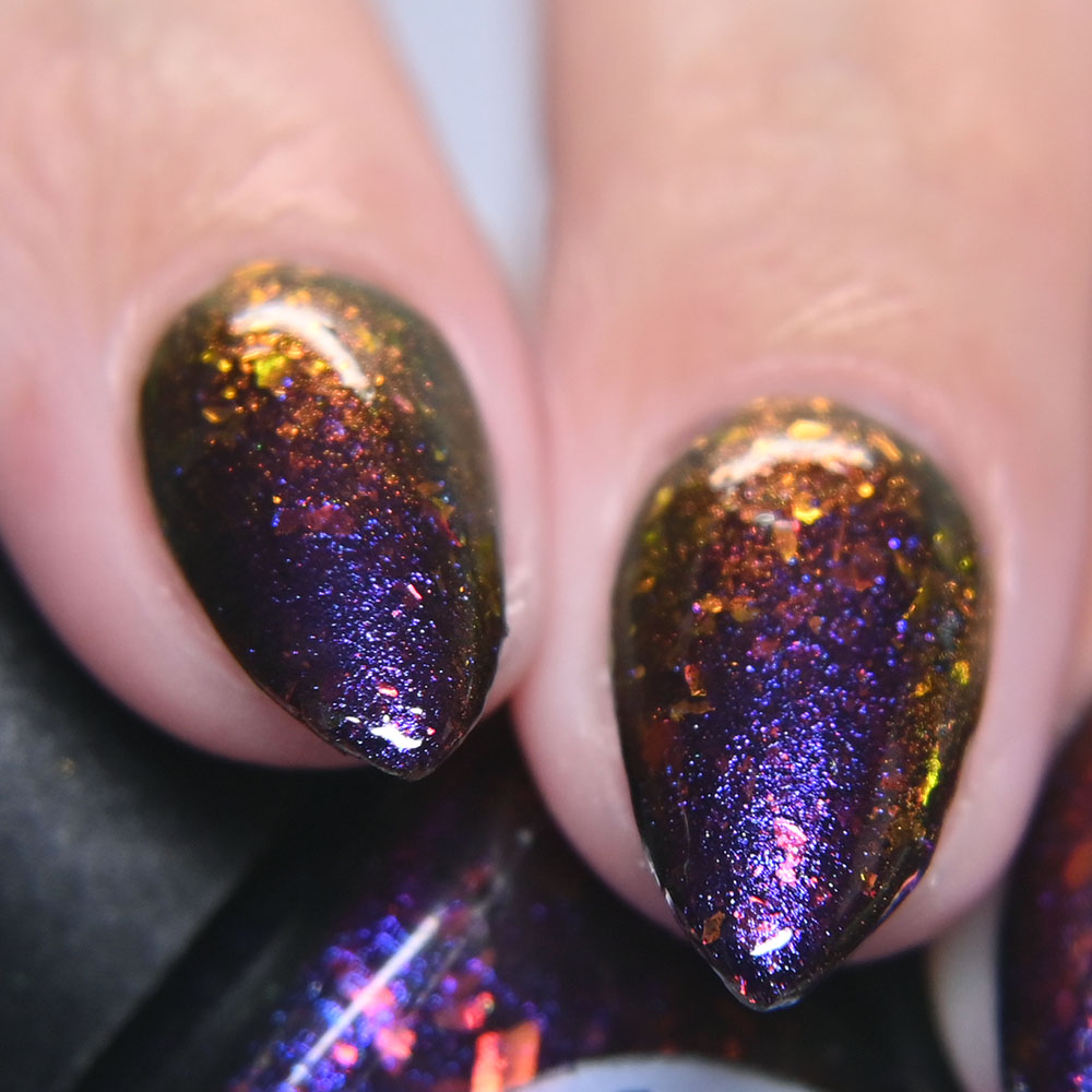Description: Gonna Freak Out is a sheer jelly black base, scattered holographic glitter, multiple fx colorshift flakies, and multiple intense ucc flakes.