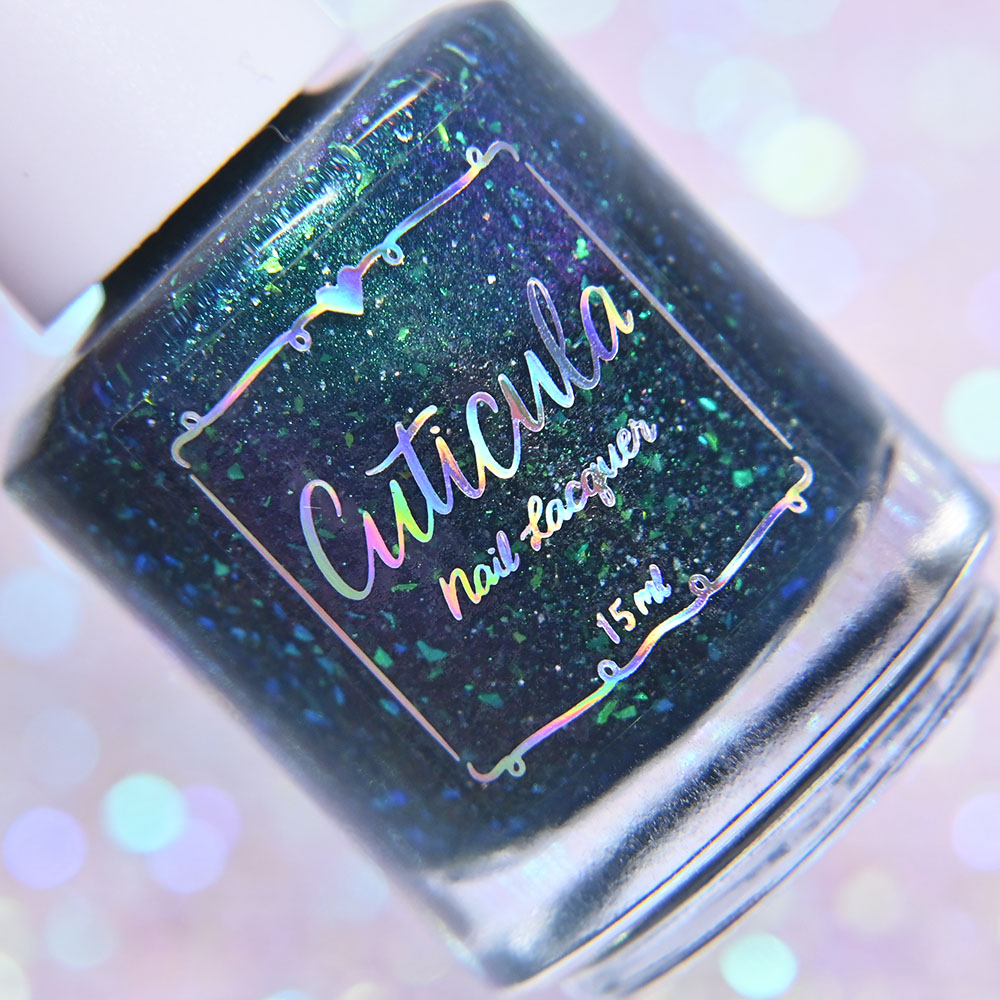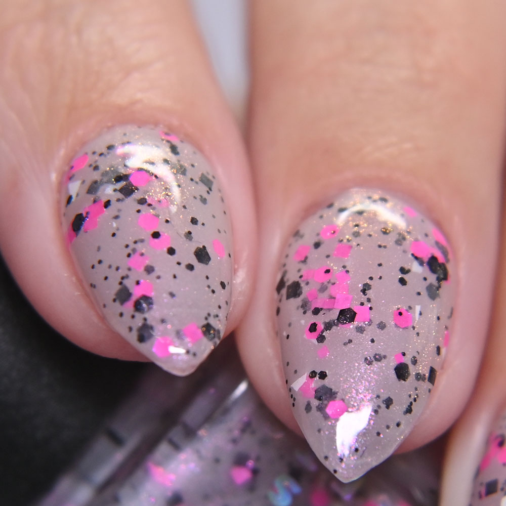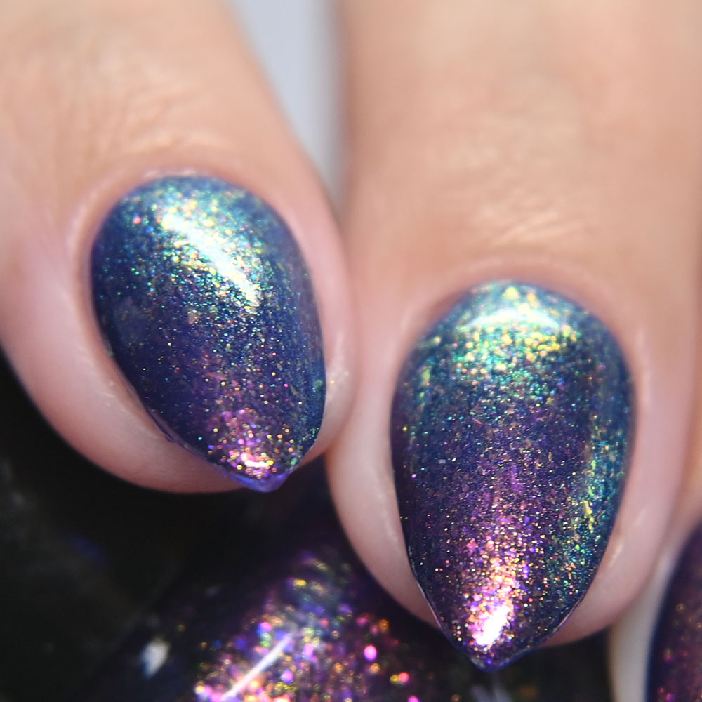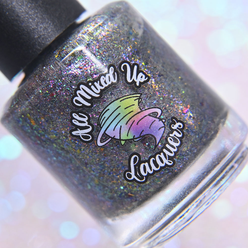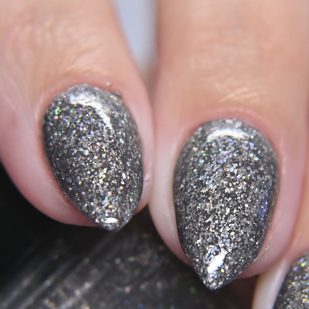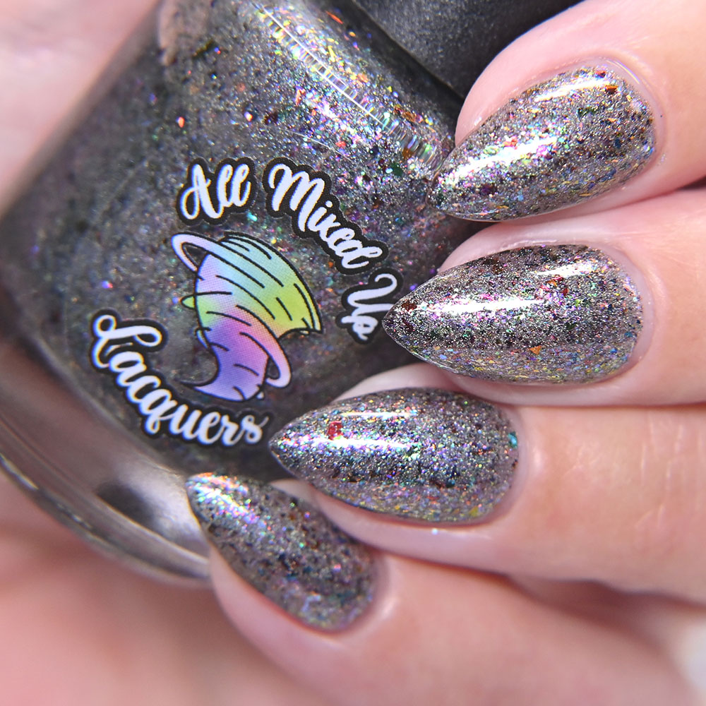 Description: Gonna Freak Out is a sheer jelly black base, scattered holographic glitter, multiple fx colorshift flakies, and multiple intense ucc flakes.