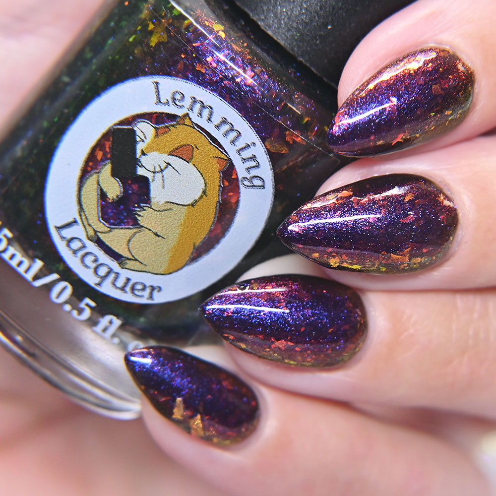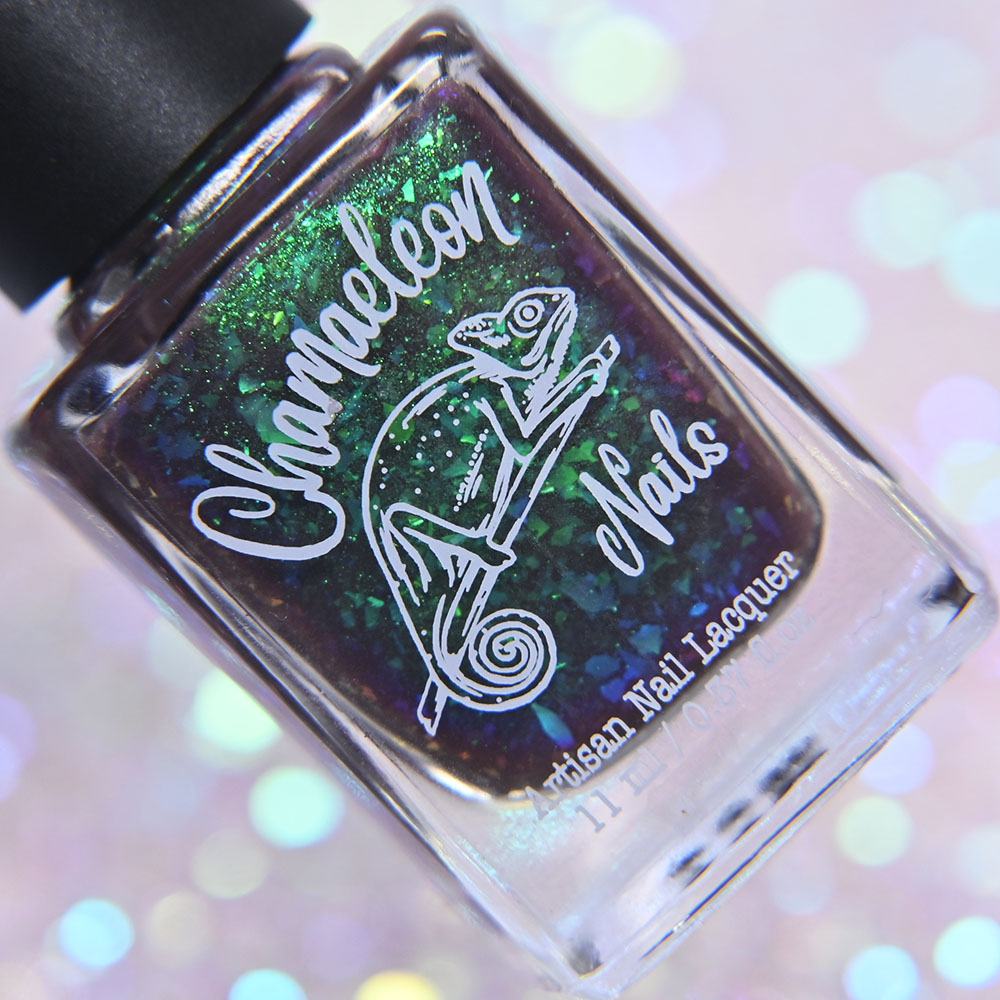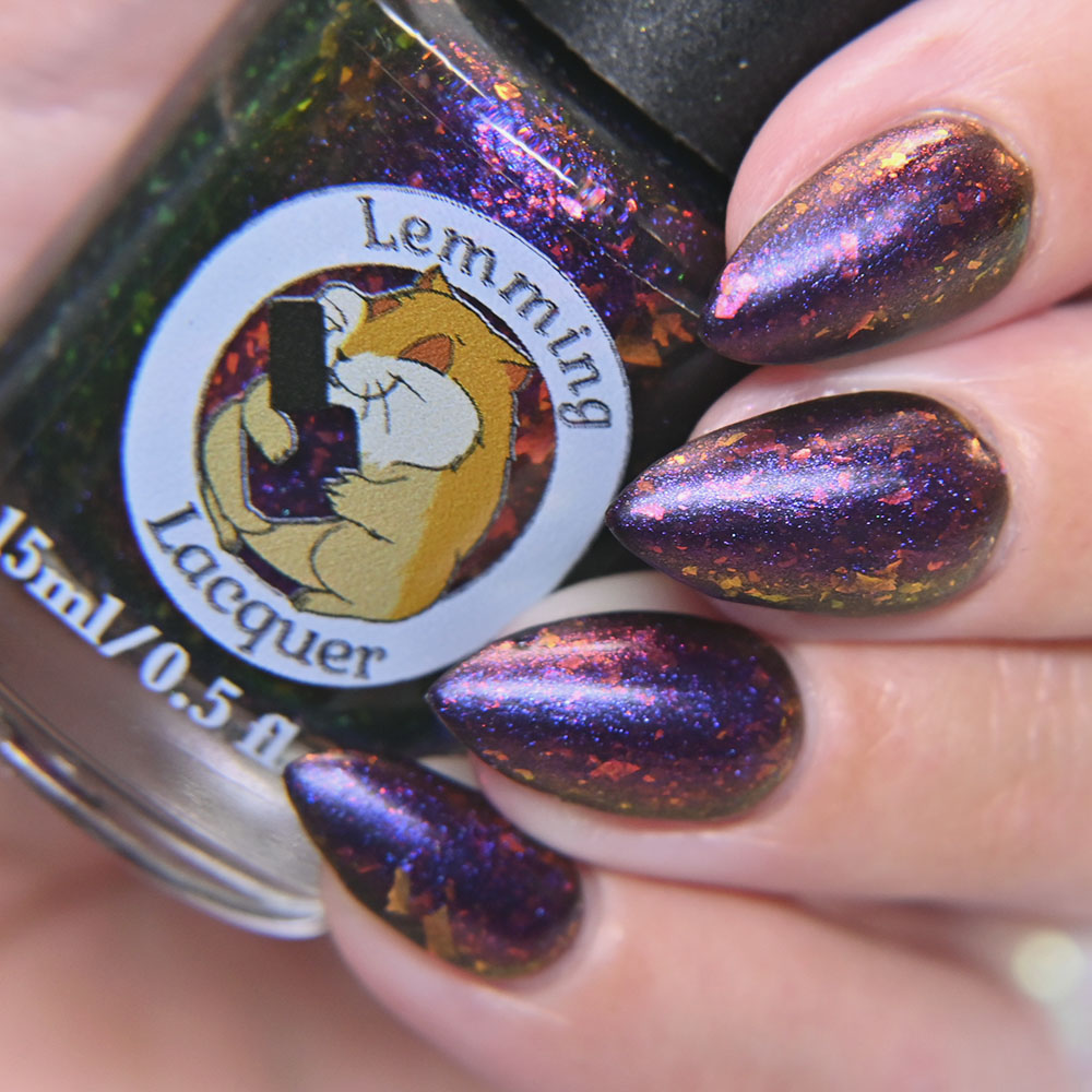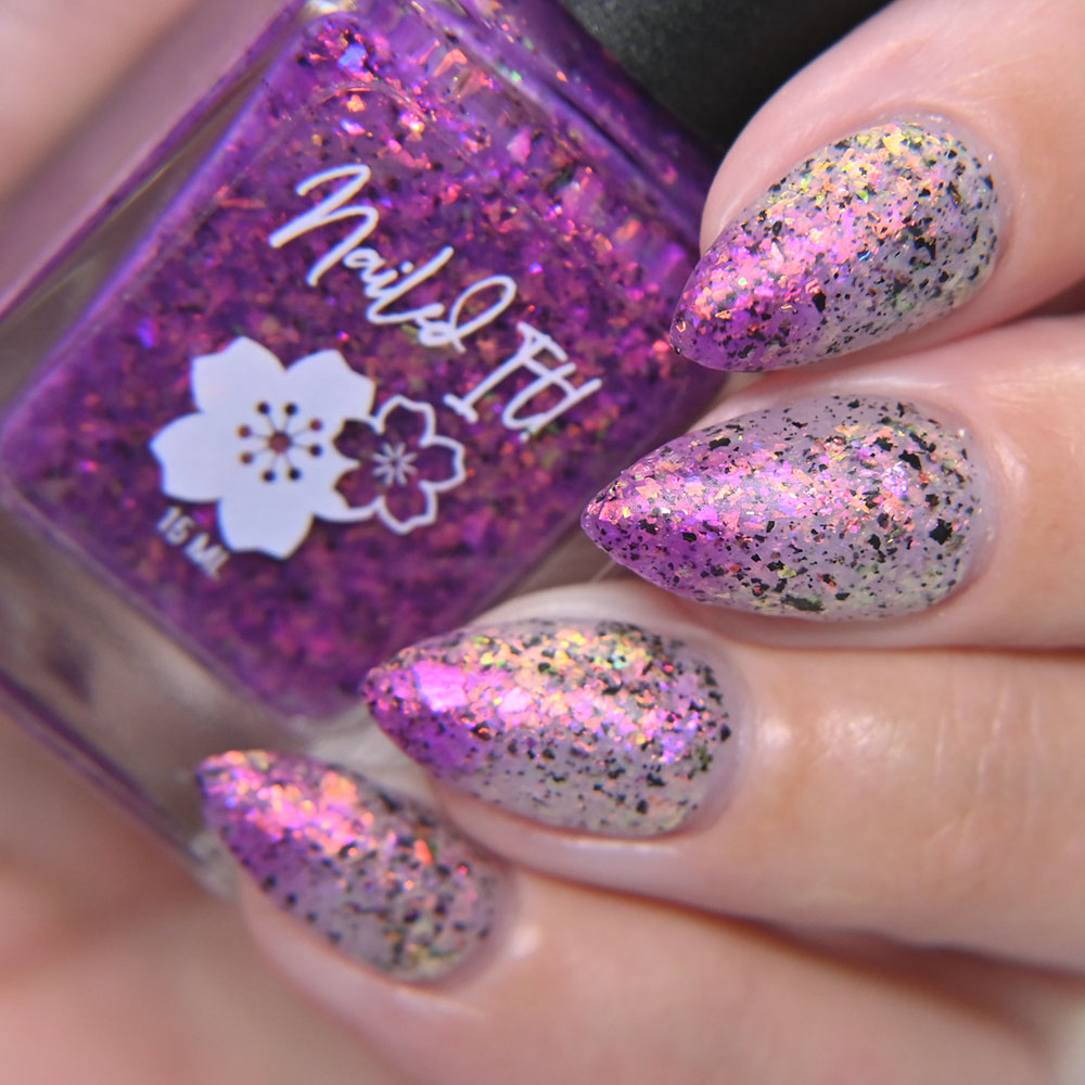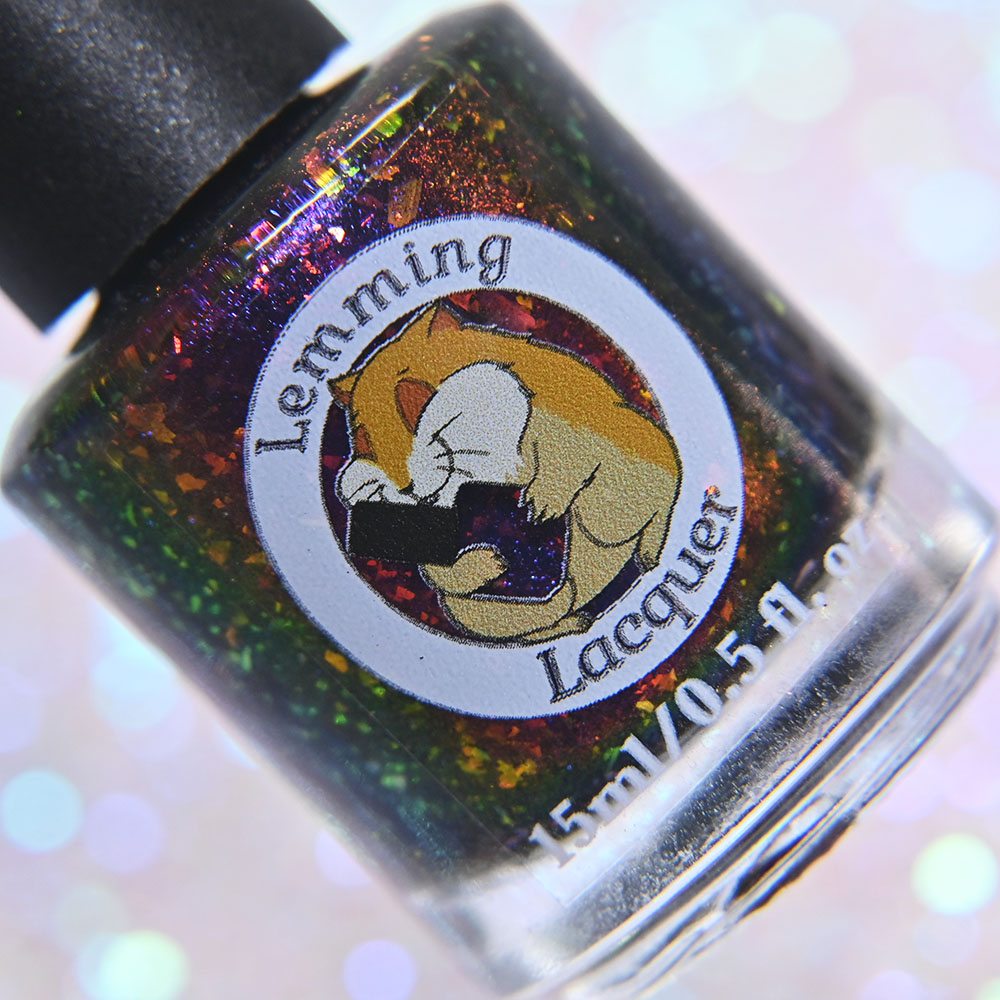Description: Gonna Freak Out is a sheer jelly black base, scattered holographic glitter, multiple fx colorshift flakies, and multiple intense ucc flakes.