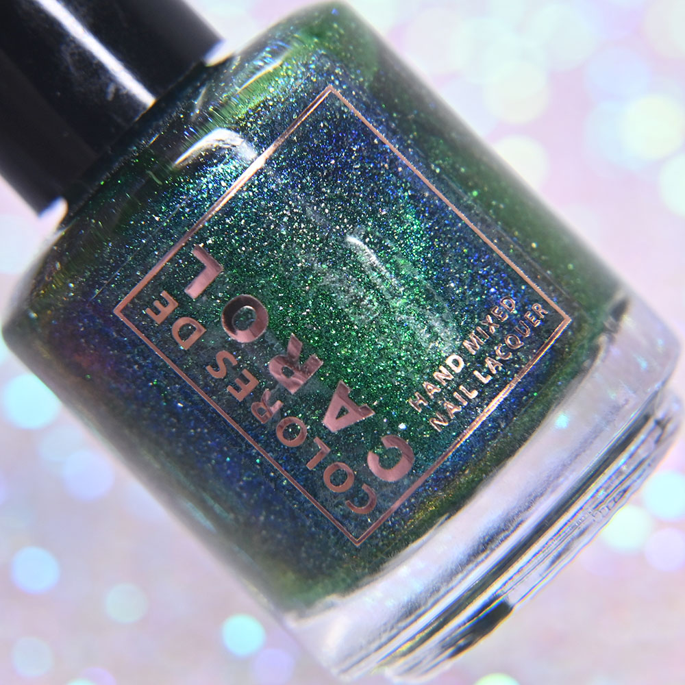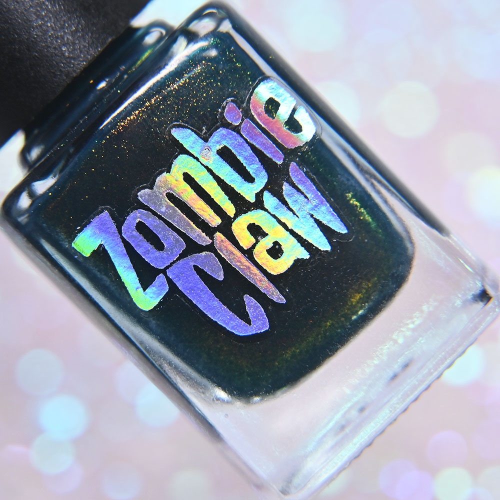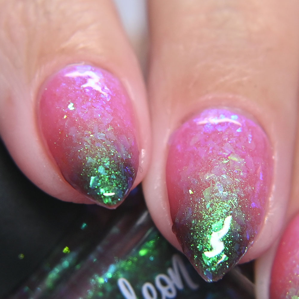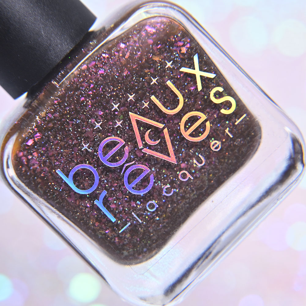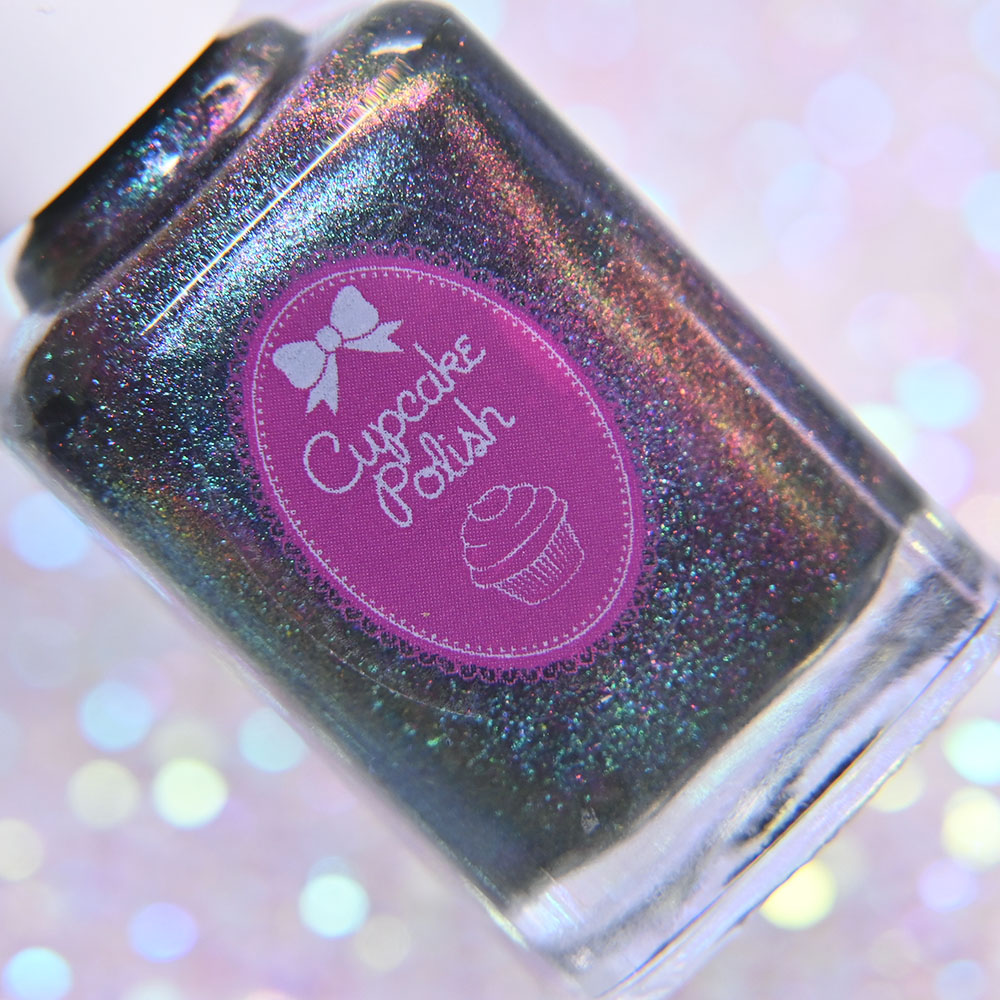 Description: Gonna Freak Out is a sheer jelly black base, scattered holographic glitter, multiple fx colorshift flakies, and multiple intense ucc flakes.