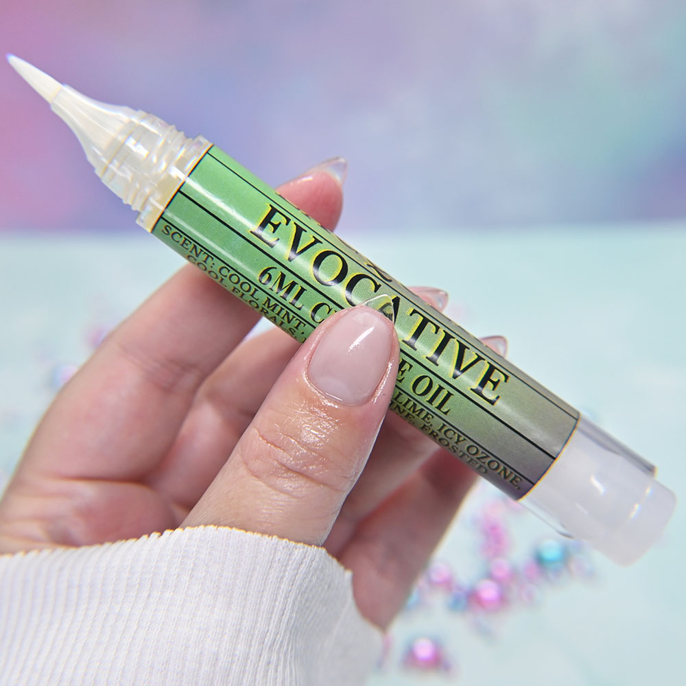 Evocative 6mL Cuticle Oil has scent notes of: Cool Mint, Sparkling Lime, Icy Ozone, Cool Florals, Night Jasmine, Frosted Amber and Soft Musk.