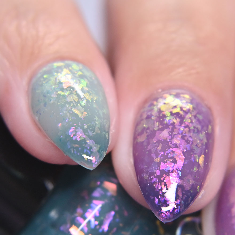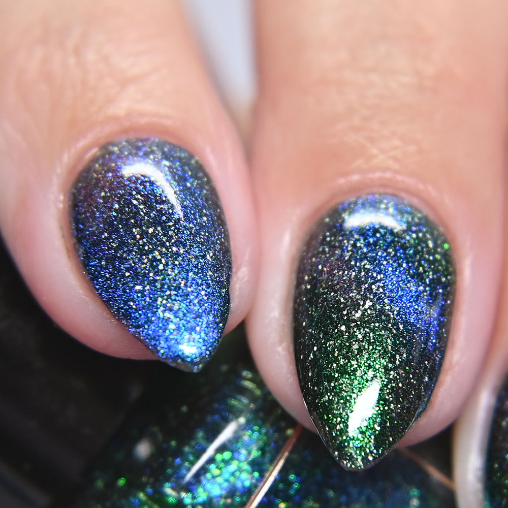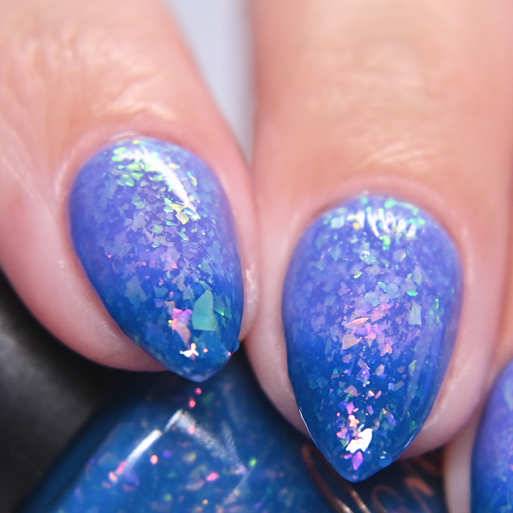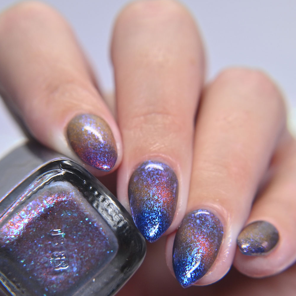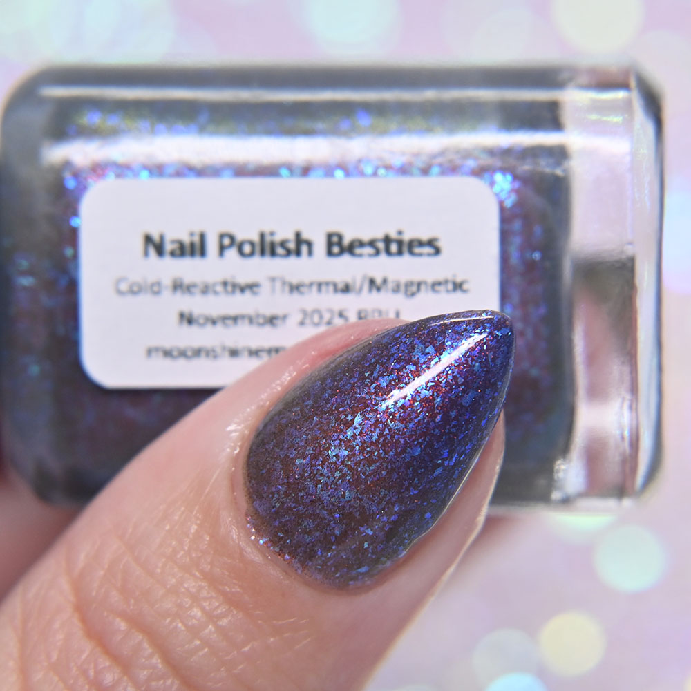 Description: Nail Polish Besties is a gray to blue cold reactive thermal glowing with pink to red to gold to green magnetic shimmer and packed with aqua to sapphire to green iridescent flakies.