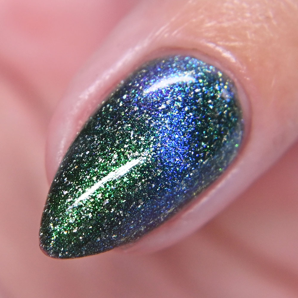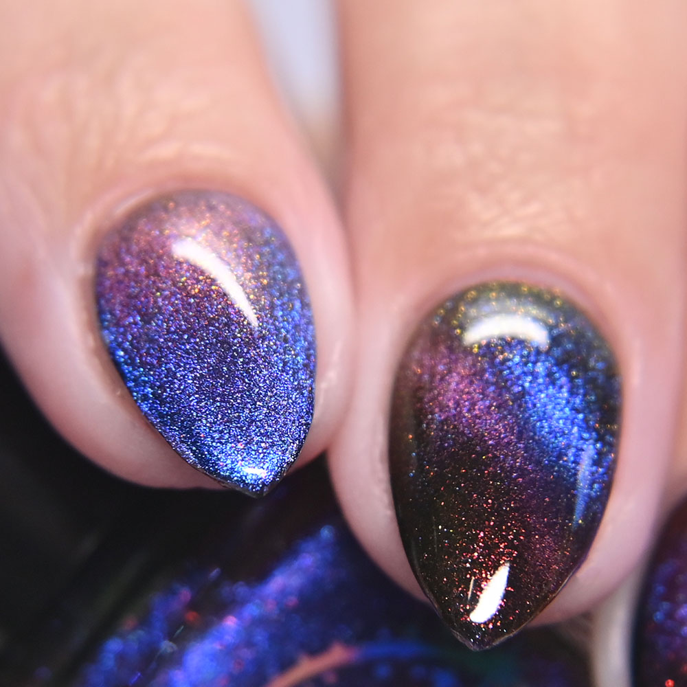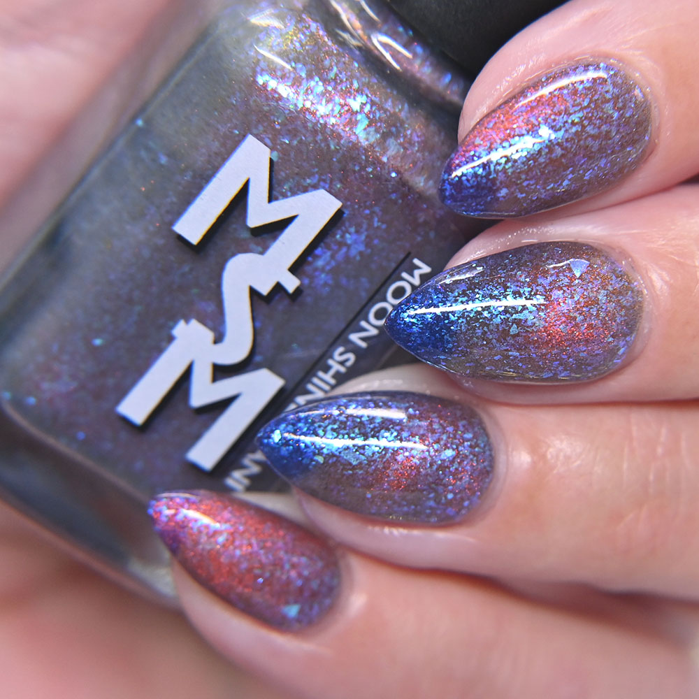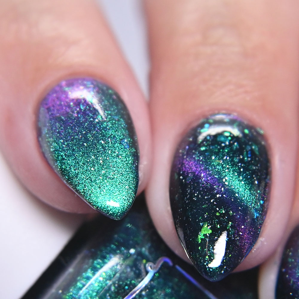Description: Nail Polish Besties is a gray to blue cold reactive thermal glowing with pink to red to gold to green magnetic shimmer and packed with aqua to sapphire to green iridescent flakies.