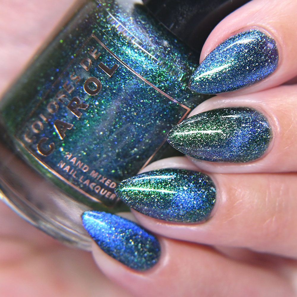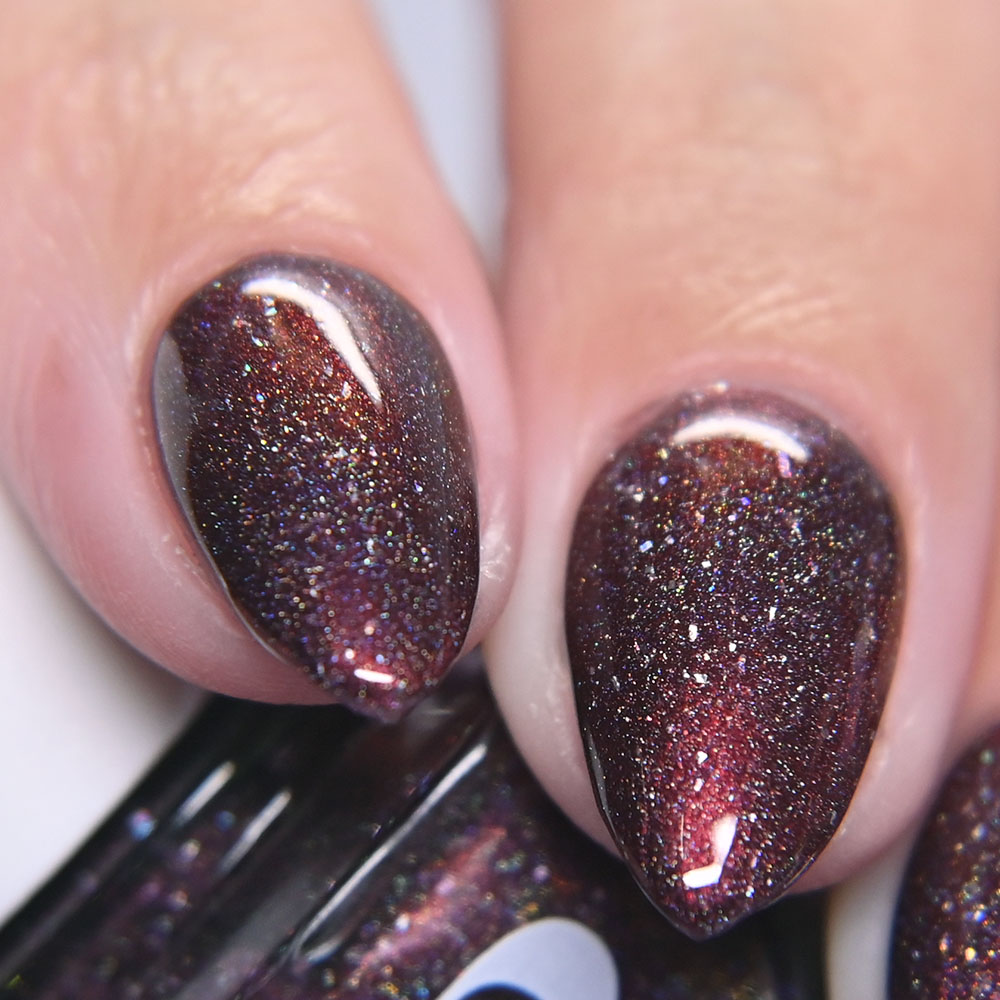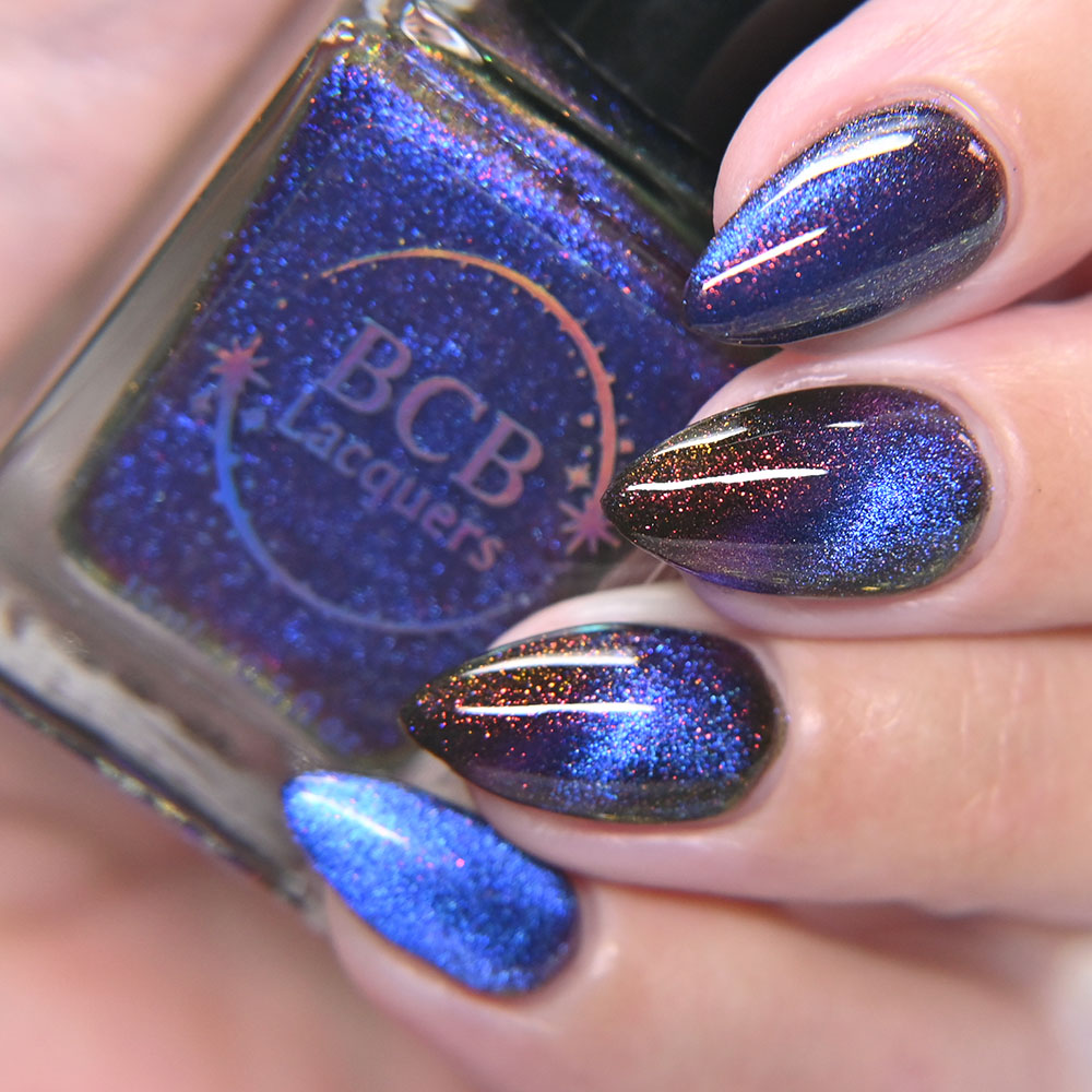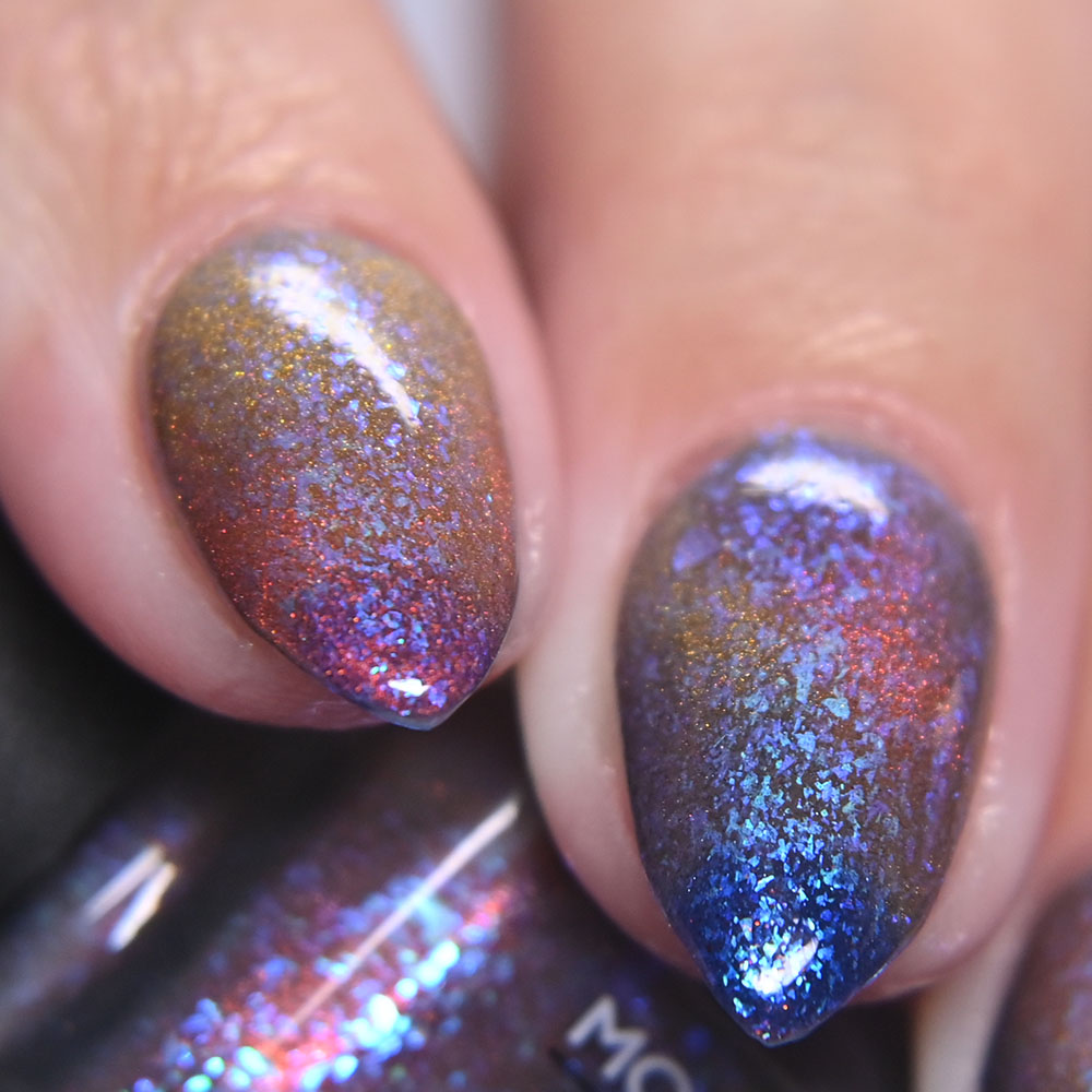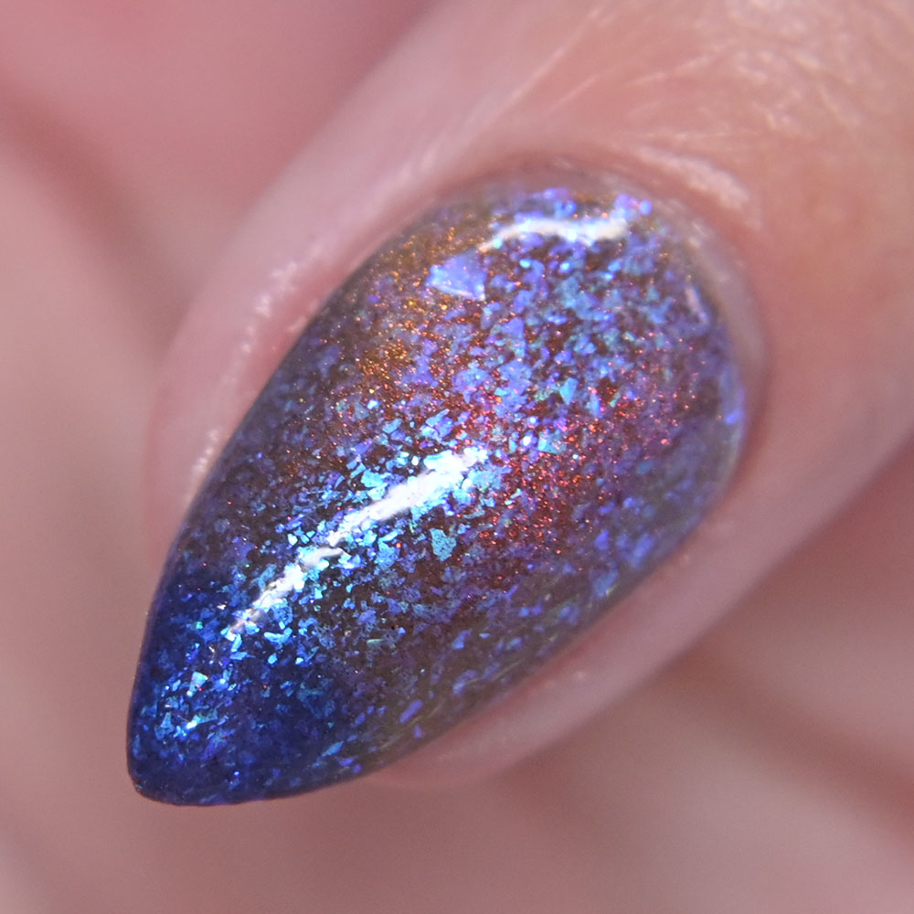 Description: Nail Polish Besties is a gray to blue cold reactive thermal glowing with pink to red to gold to green magnetic shimmer and packed with aqua to sapphire to green iridescent flakies.