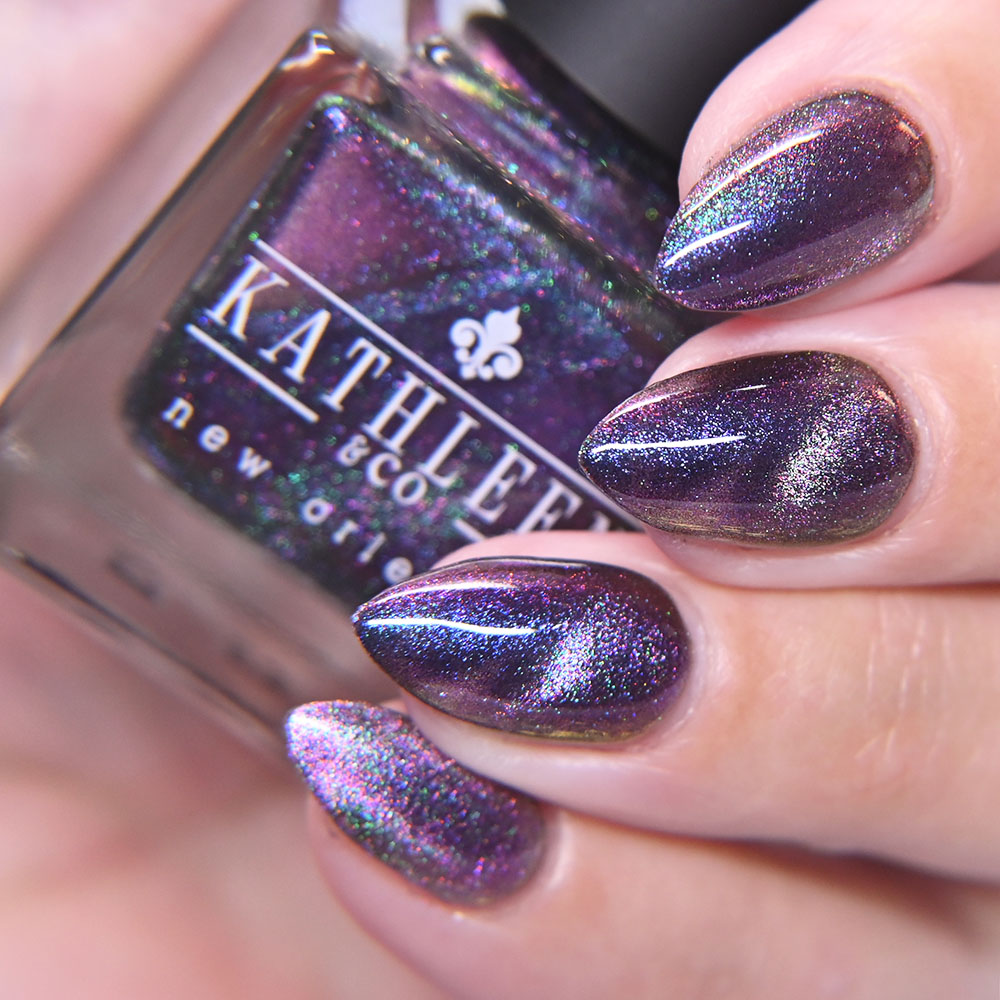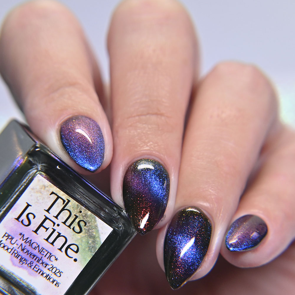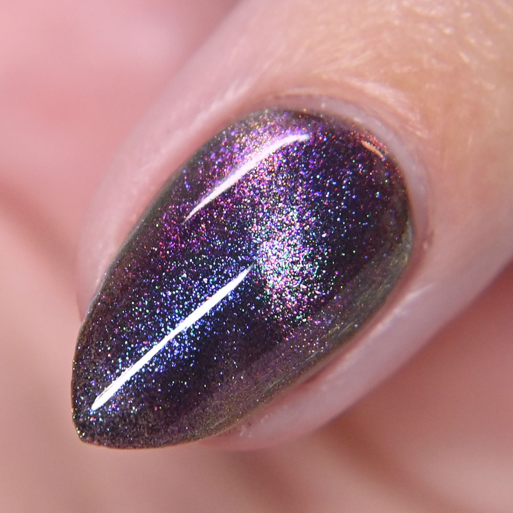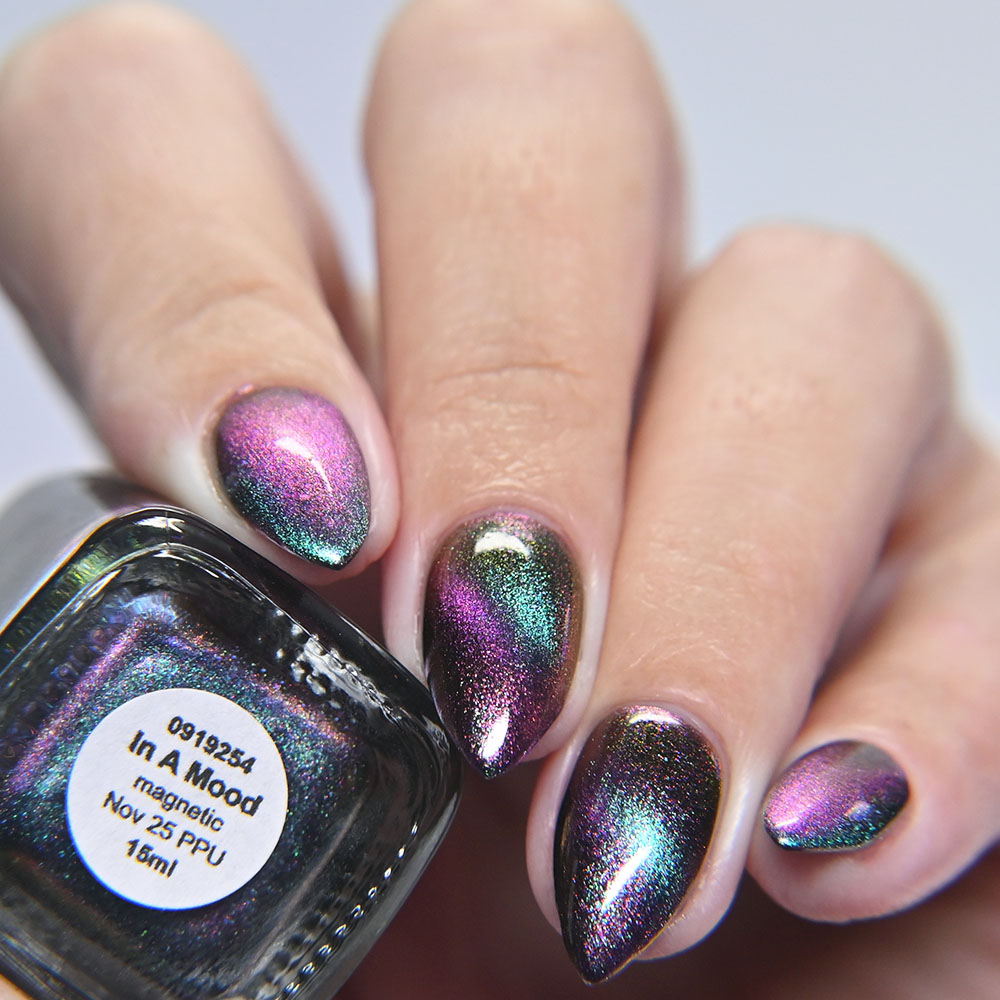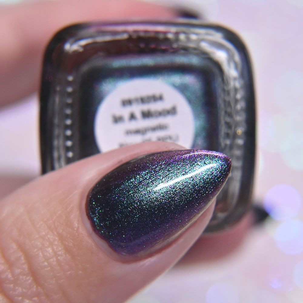 Description: In A Mood is a double multichrome magnetic polish with a pink/gold/green multichrome base and a purple/blue/teal magnetic shift.