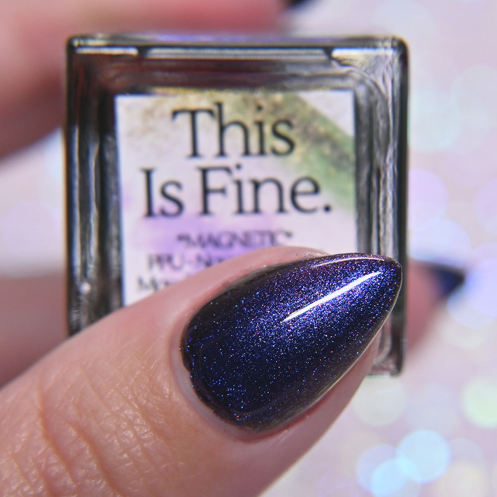 Description: This Is Fine is a murky green jelly with a purple/blue/pink magnetic pull and red to orange to green shifting shimmer.