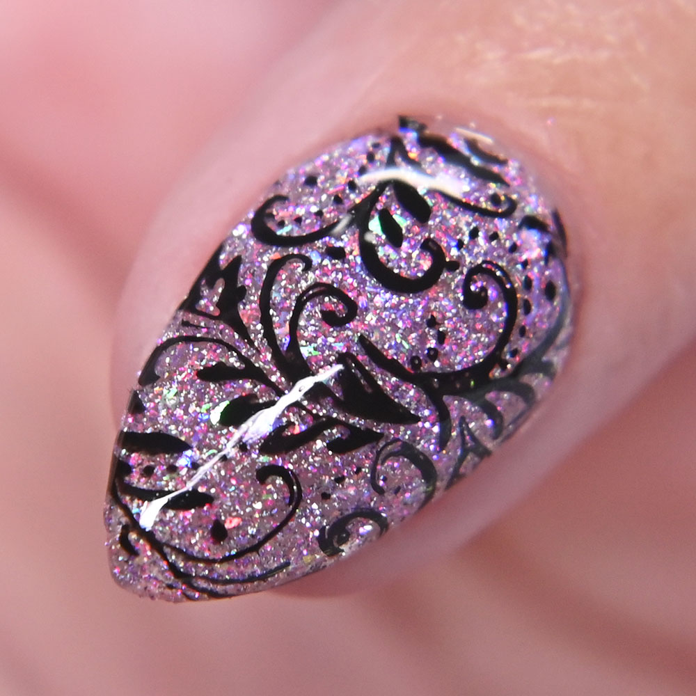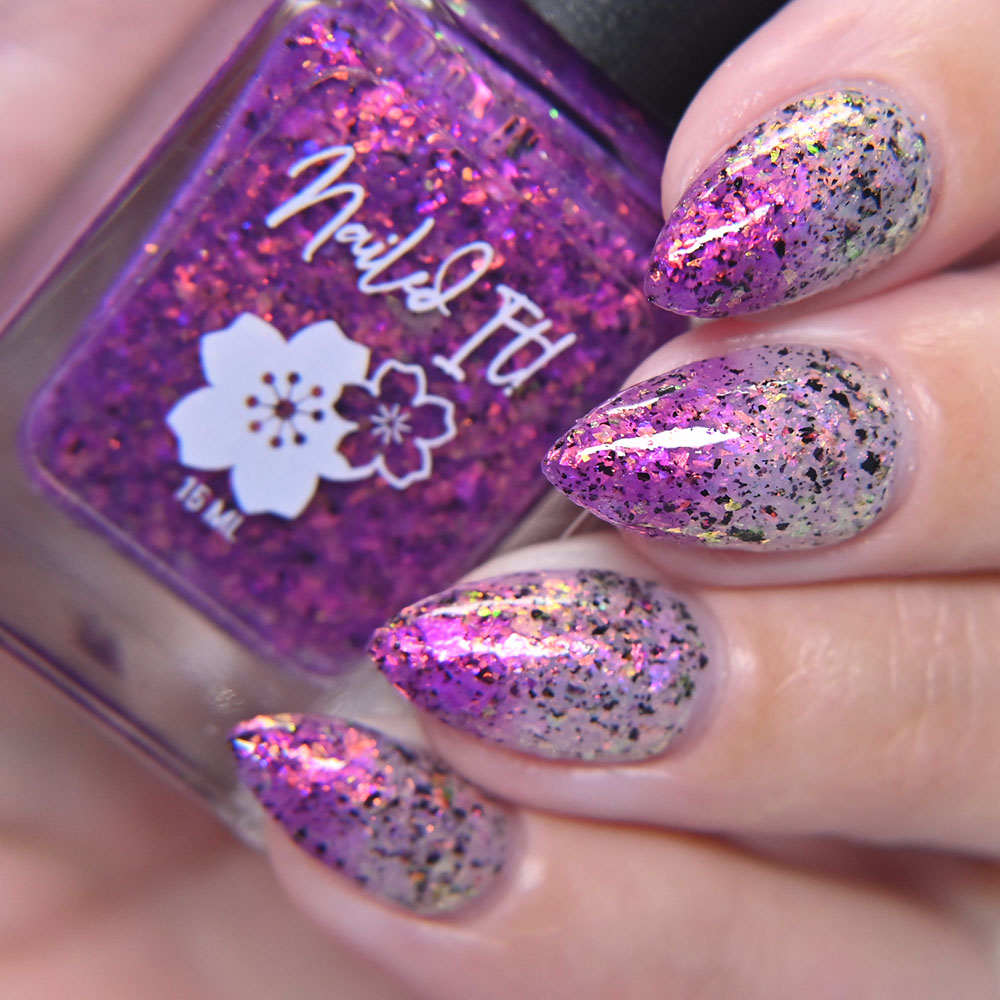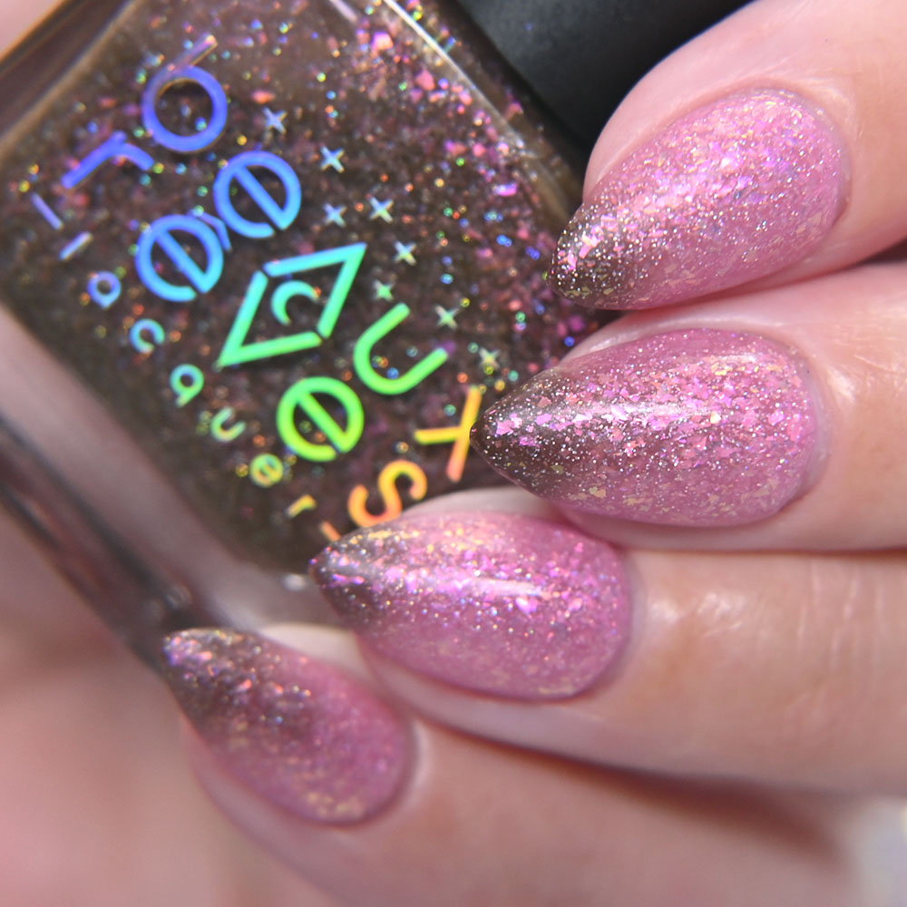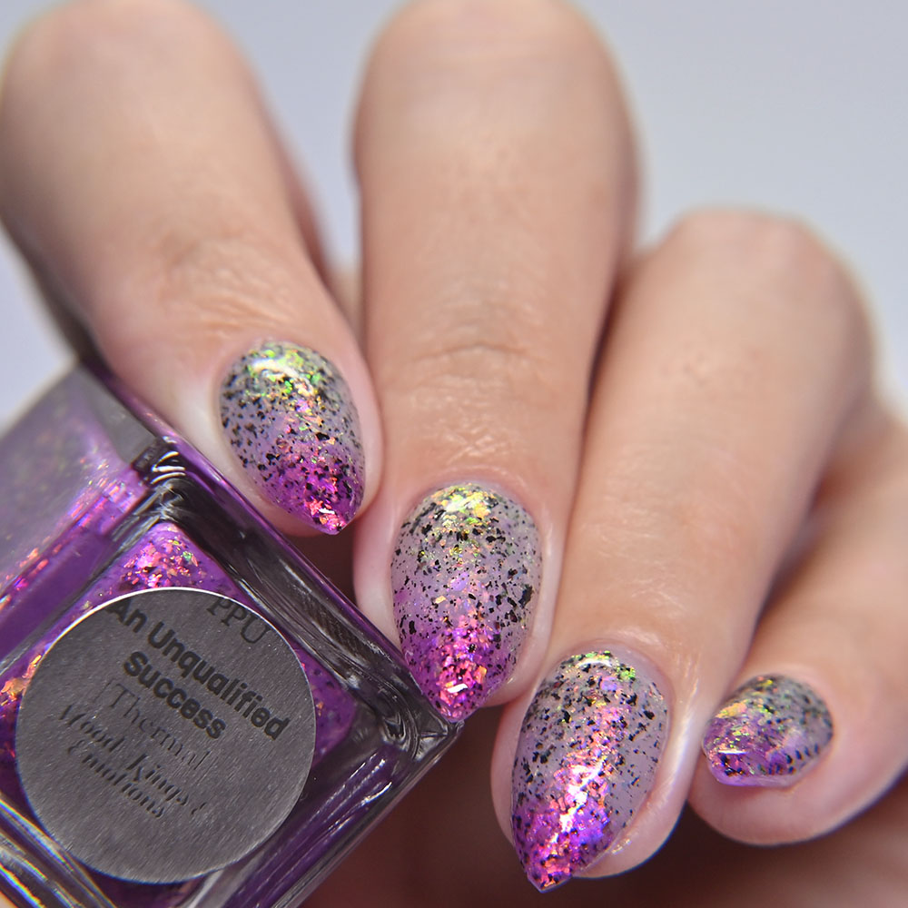 Description: Party 4 U is a soft black when cold/pinky lilac when warm filled with iridescent shifting flakes and holo glitters.