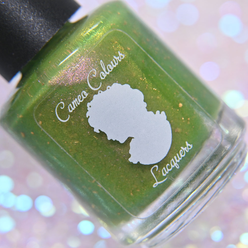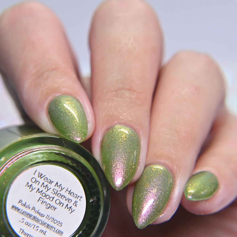 Description:  I Wear My Heart On My Sleeve & My Mood On My Ring is a spring green when cold to delicate blue when warm thermal, with a strong pink/gold/green shimmer and gold metallic flakes.