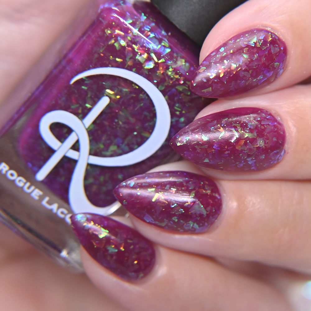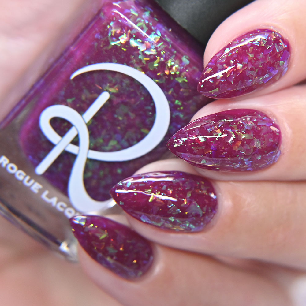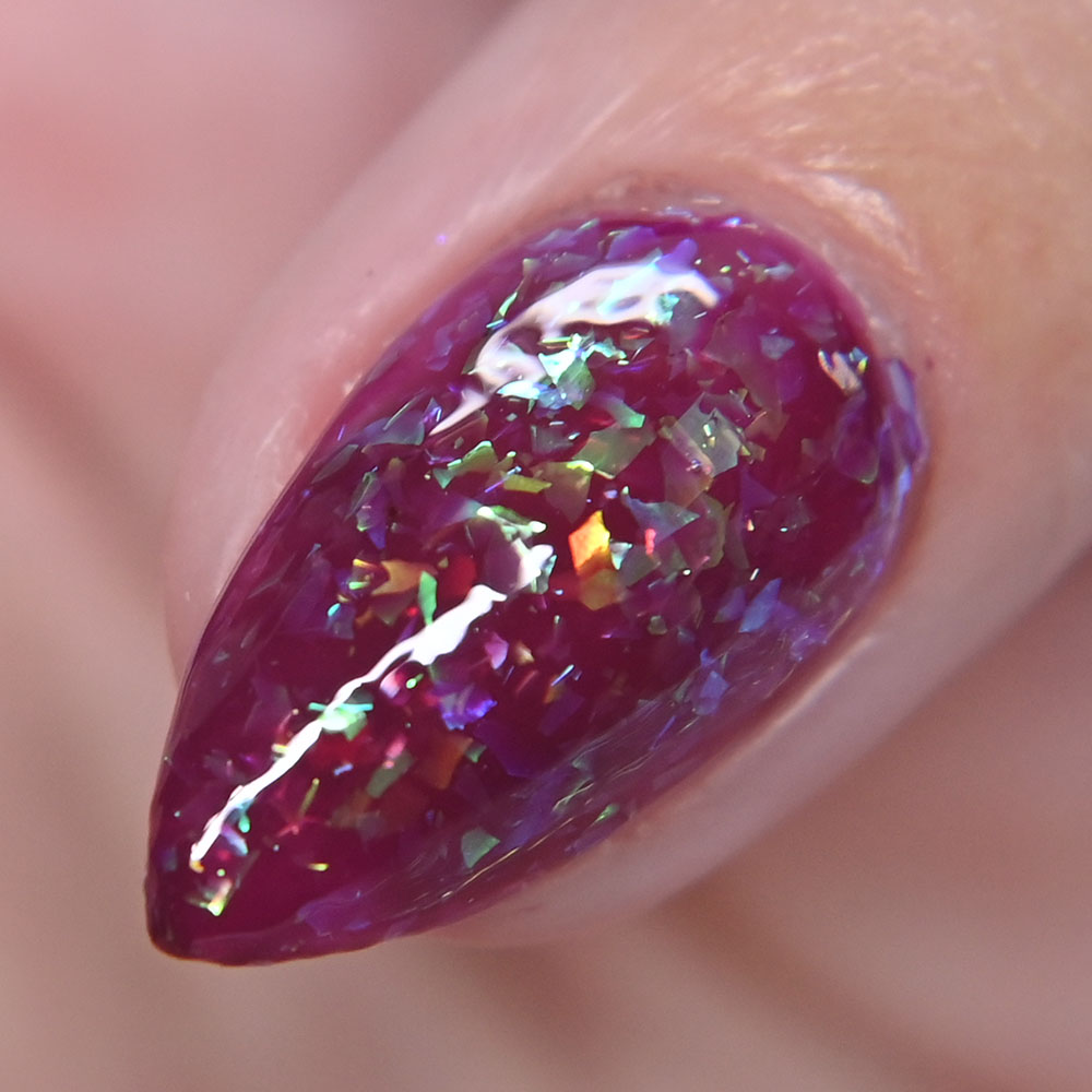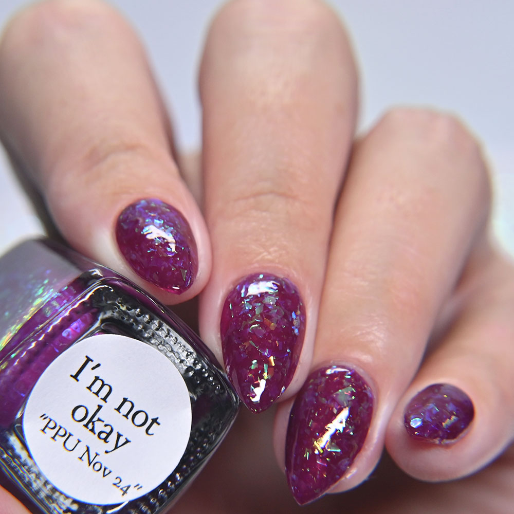 Description: I’m Not Okay is a rich berry tone with green glass flakes that shift like a mood ring.