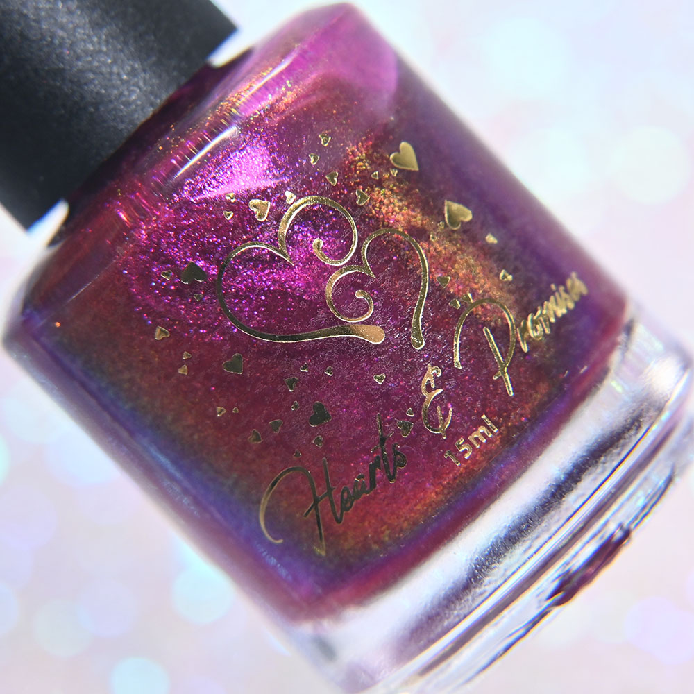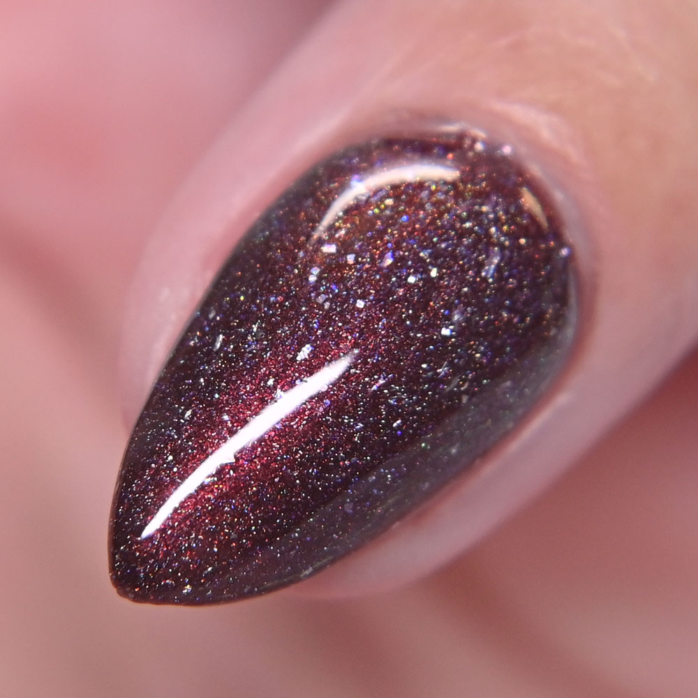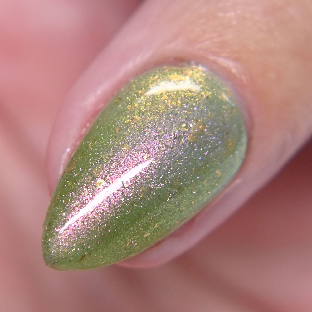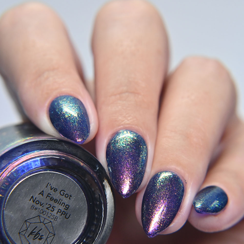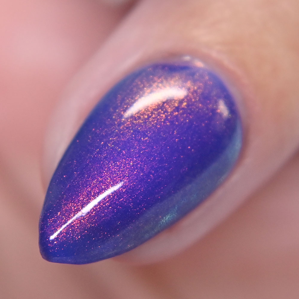 Description: I’ve Got A Feeling is a multichromatic microflake that is a purple jelly base loaded with shimmer and microflakes that show flashes of rosy, red-leaning pink morph into copper, rust, and yellow gold