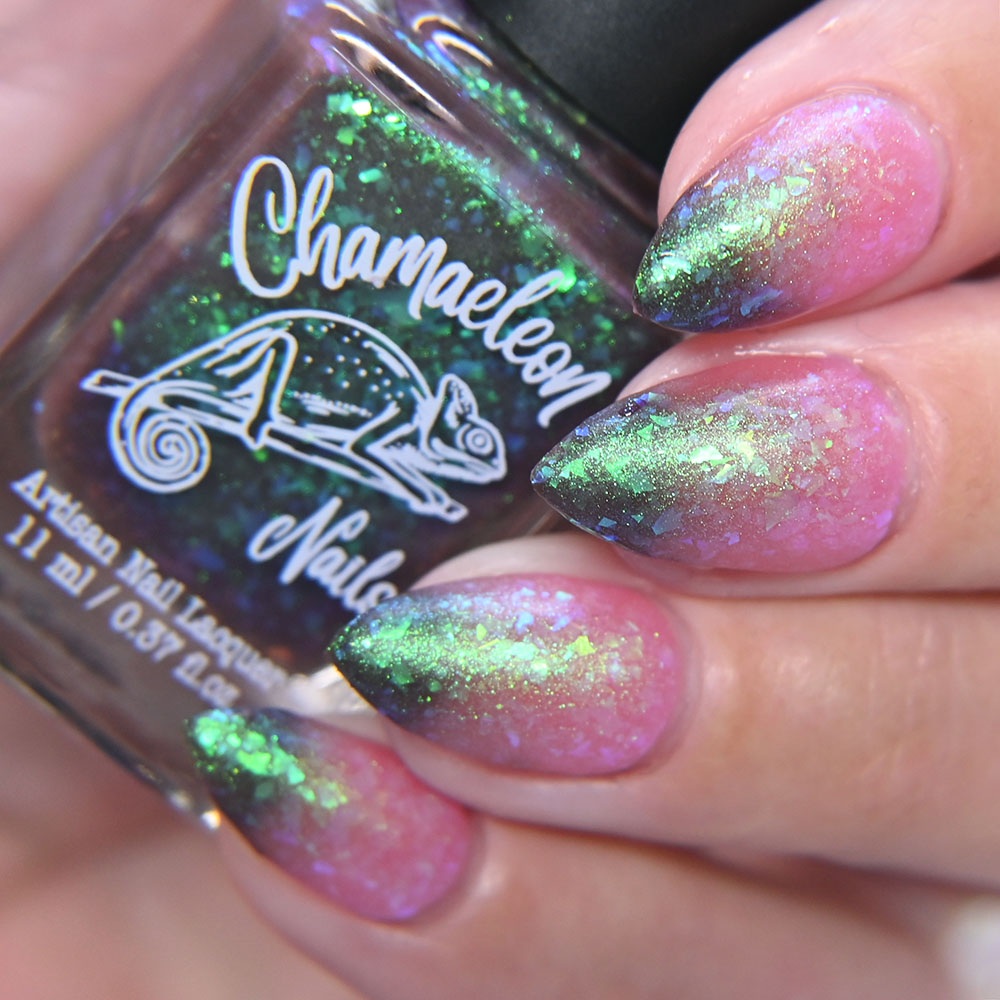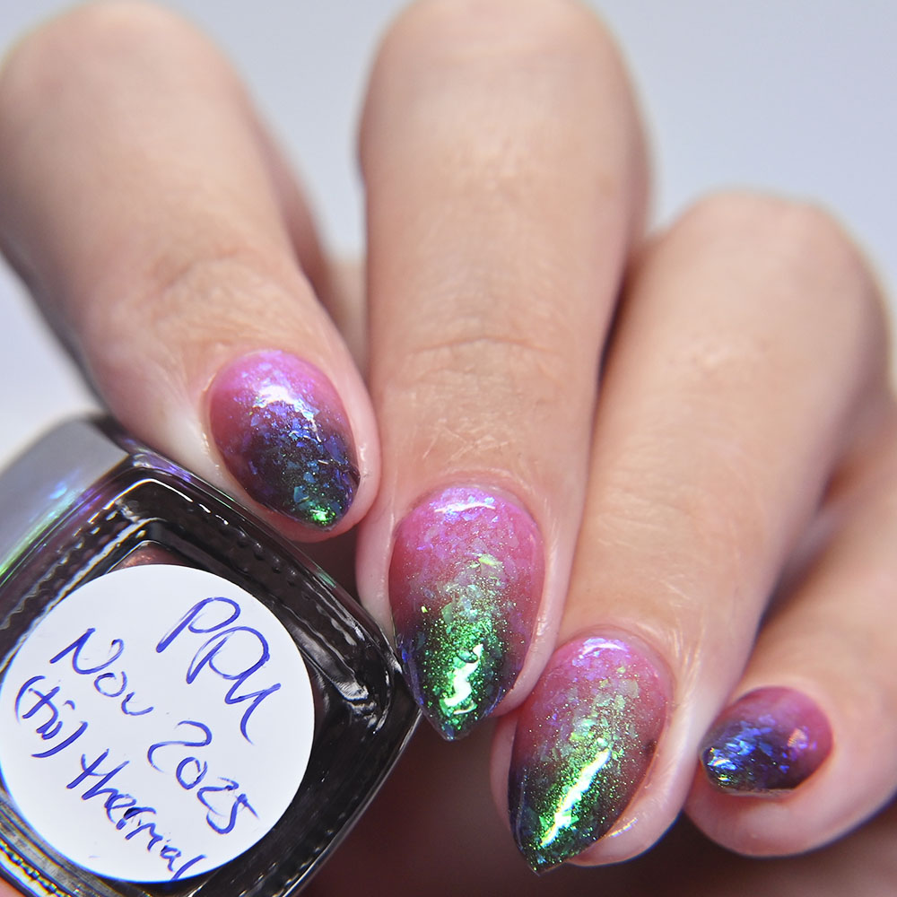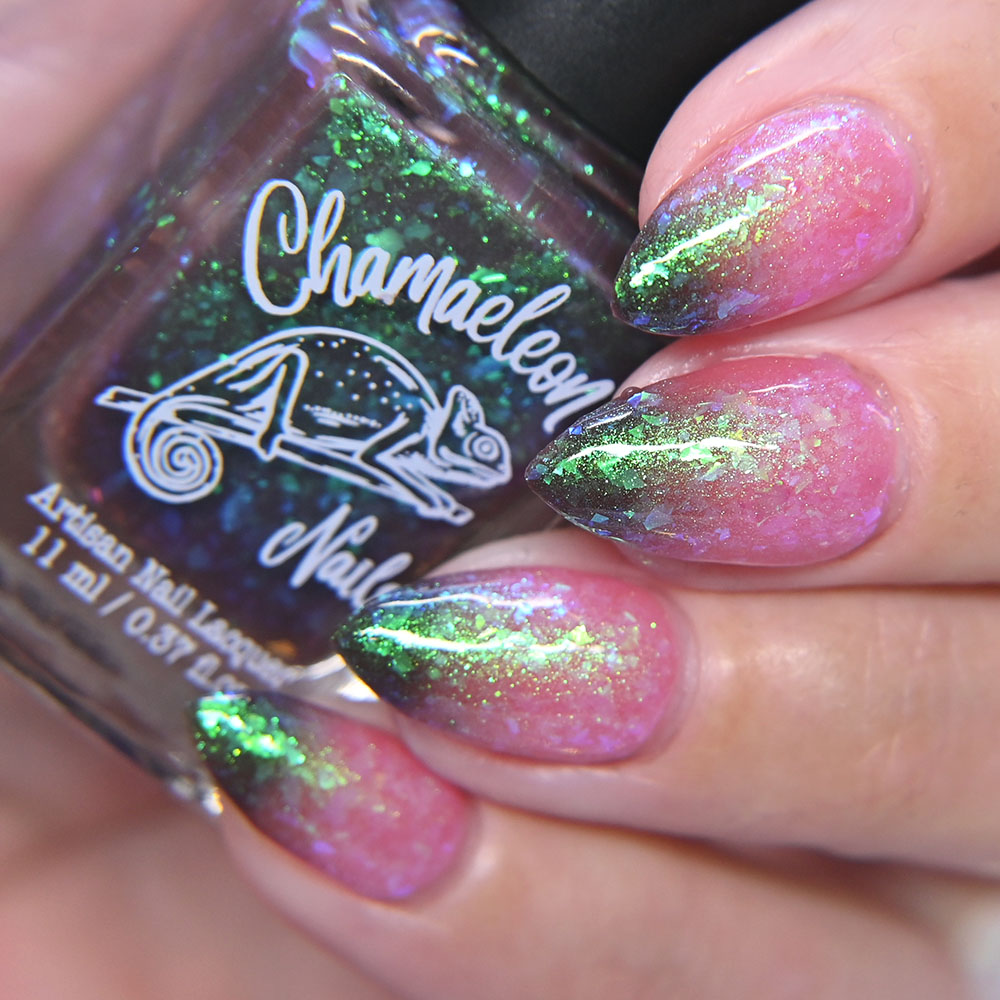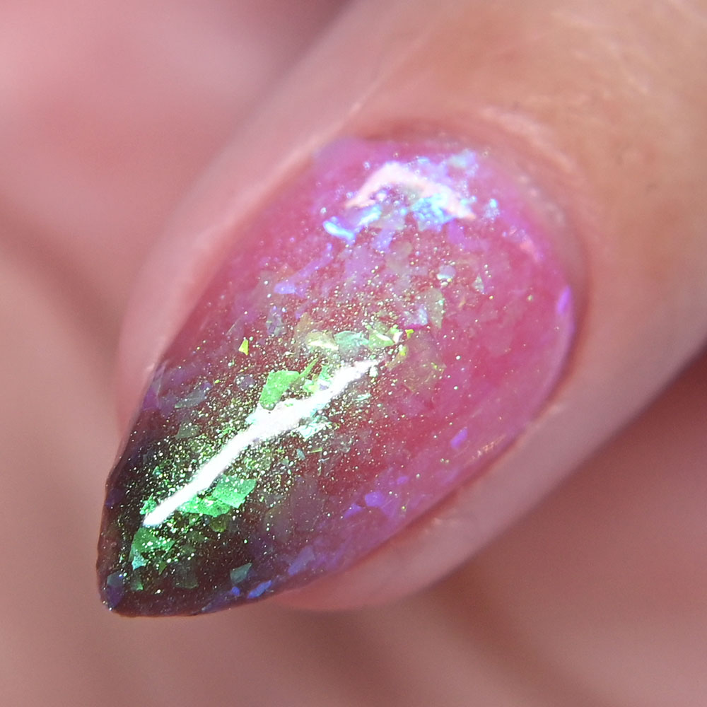 Description: Emotional Metamorphosis is a jelly based thermal going from deep brown (cold) to pink (warm) with hues of mauve while transitioning, with a strong green/blue shimmer and matching iridescent flakes.